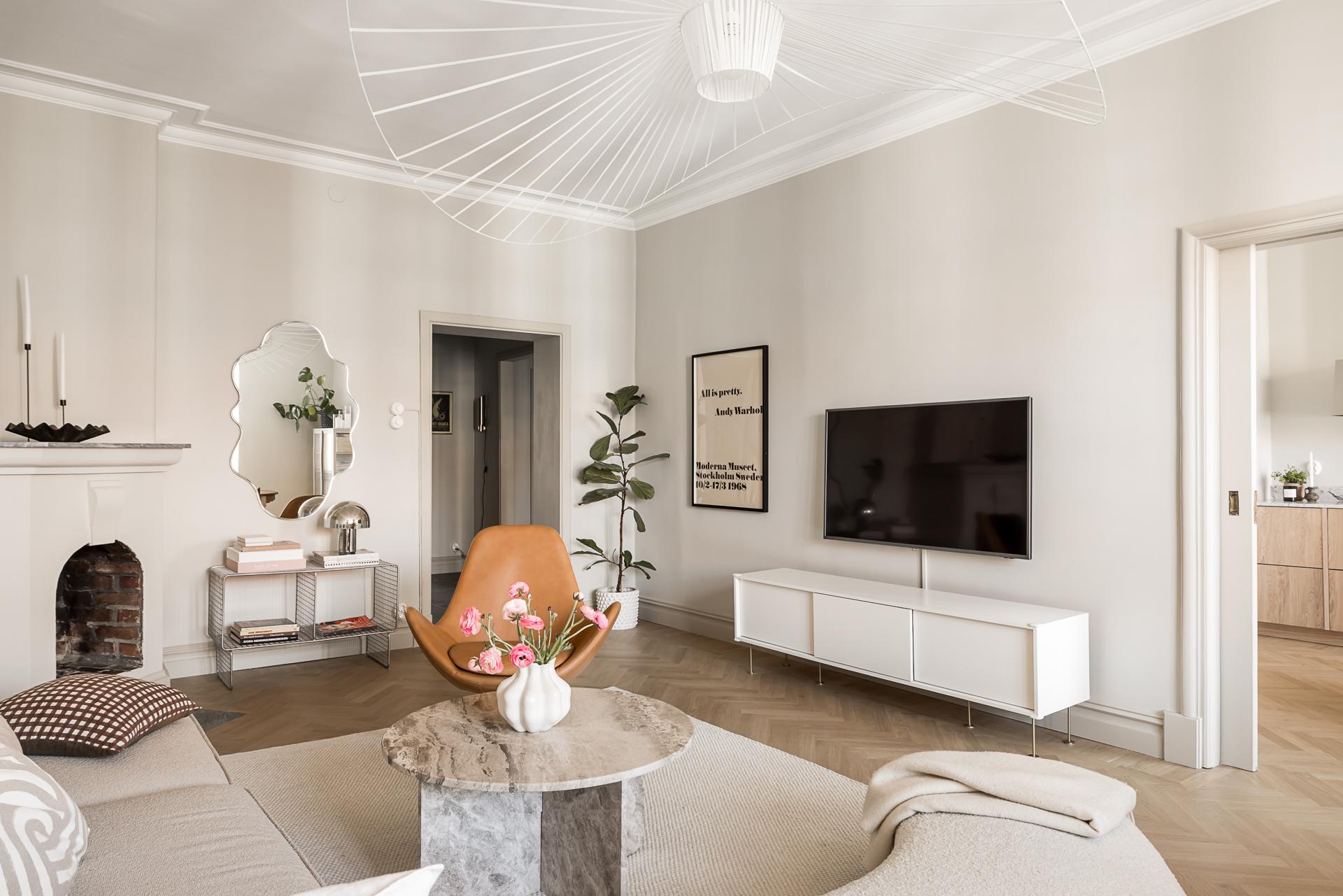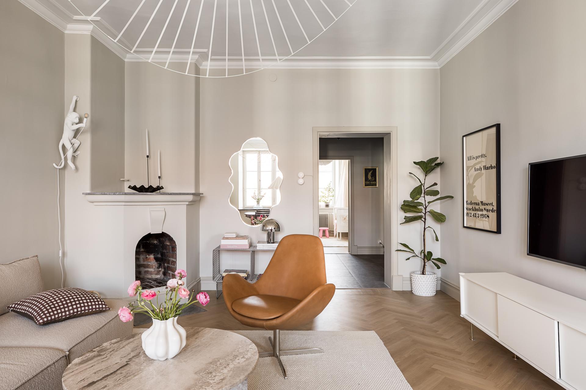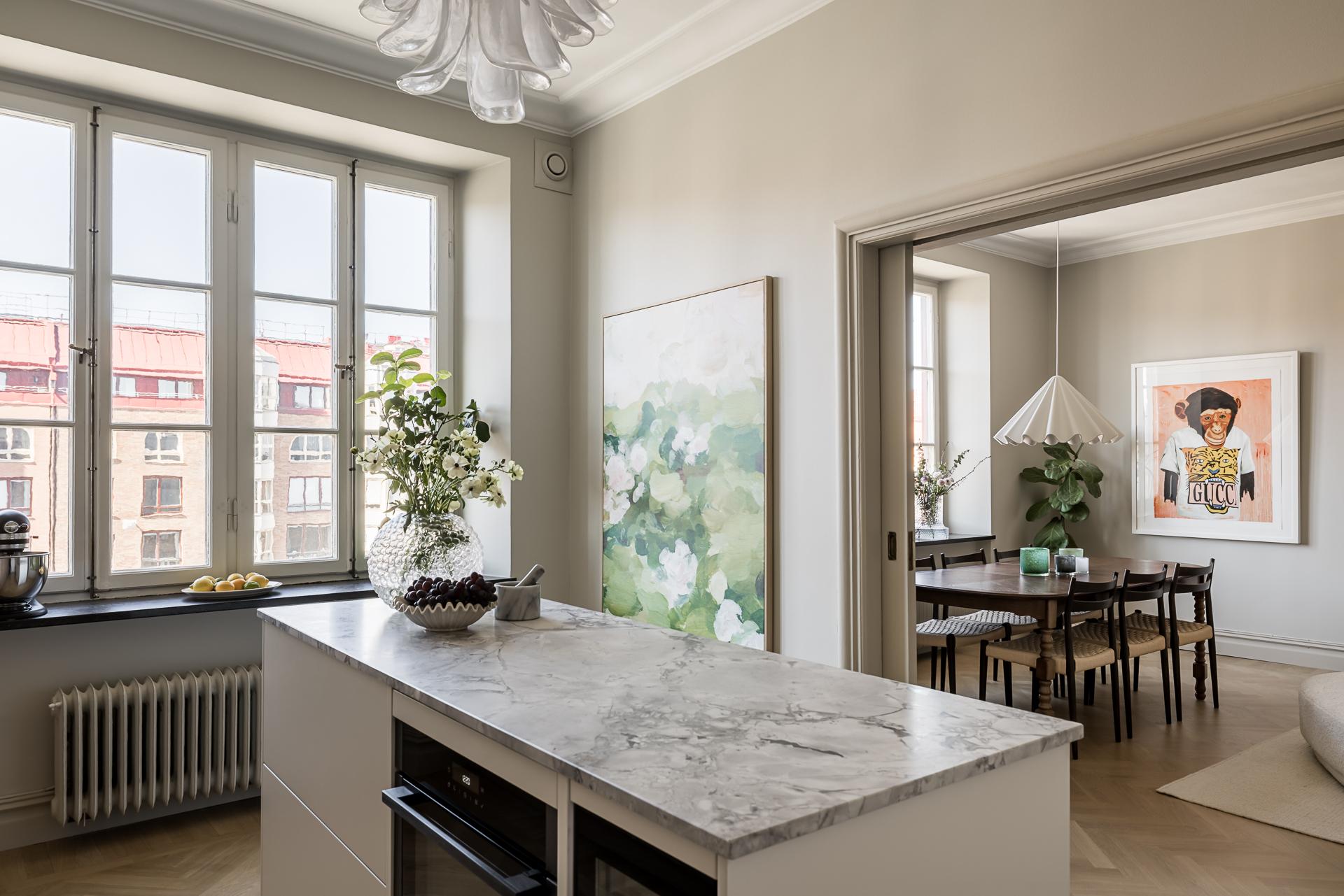 Totalrenoverad 20-talsdröm på Linnégatans solsida – högst upp med spröjsade munblåsta fönster i två väderstreck, påkostat kök med köksö i fil med vardagsrummet, lyxigt badrum med tvättmöjligheter samt gäst- wc. Nymålade ytskikt och massiva trägolv i fiskbensläggning. goda förvaringsmöjligheter, öppen spis och en mängd originaldetaljer bevarade. Hela lägenheten renoverades under 2025.