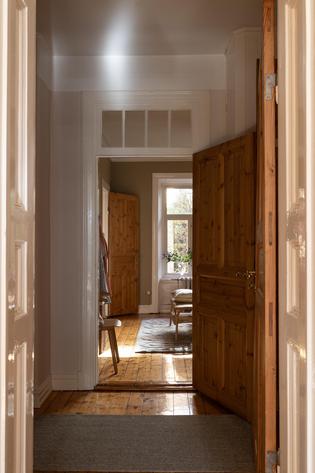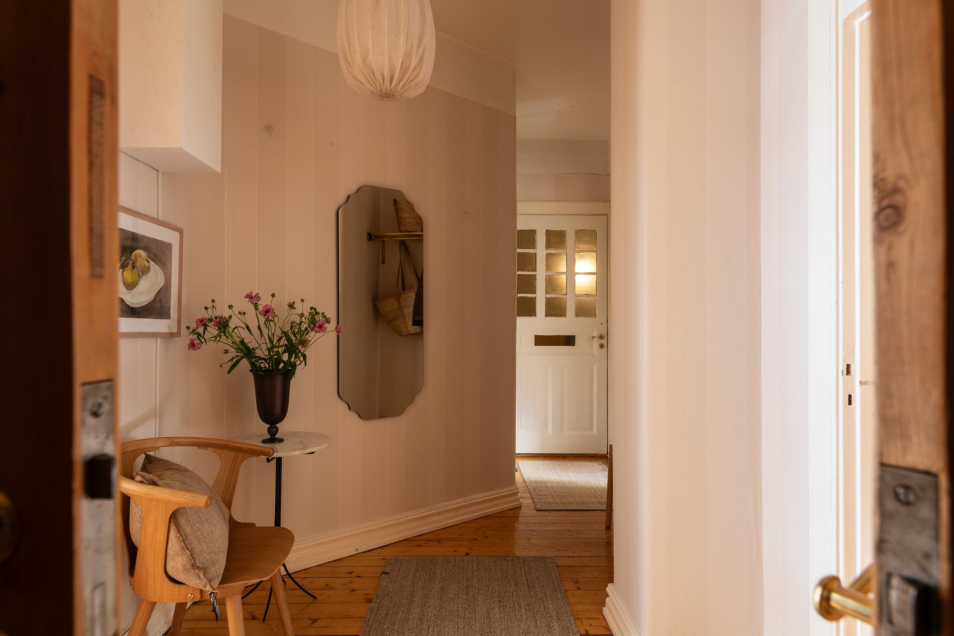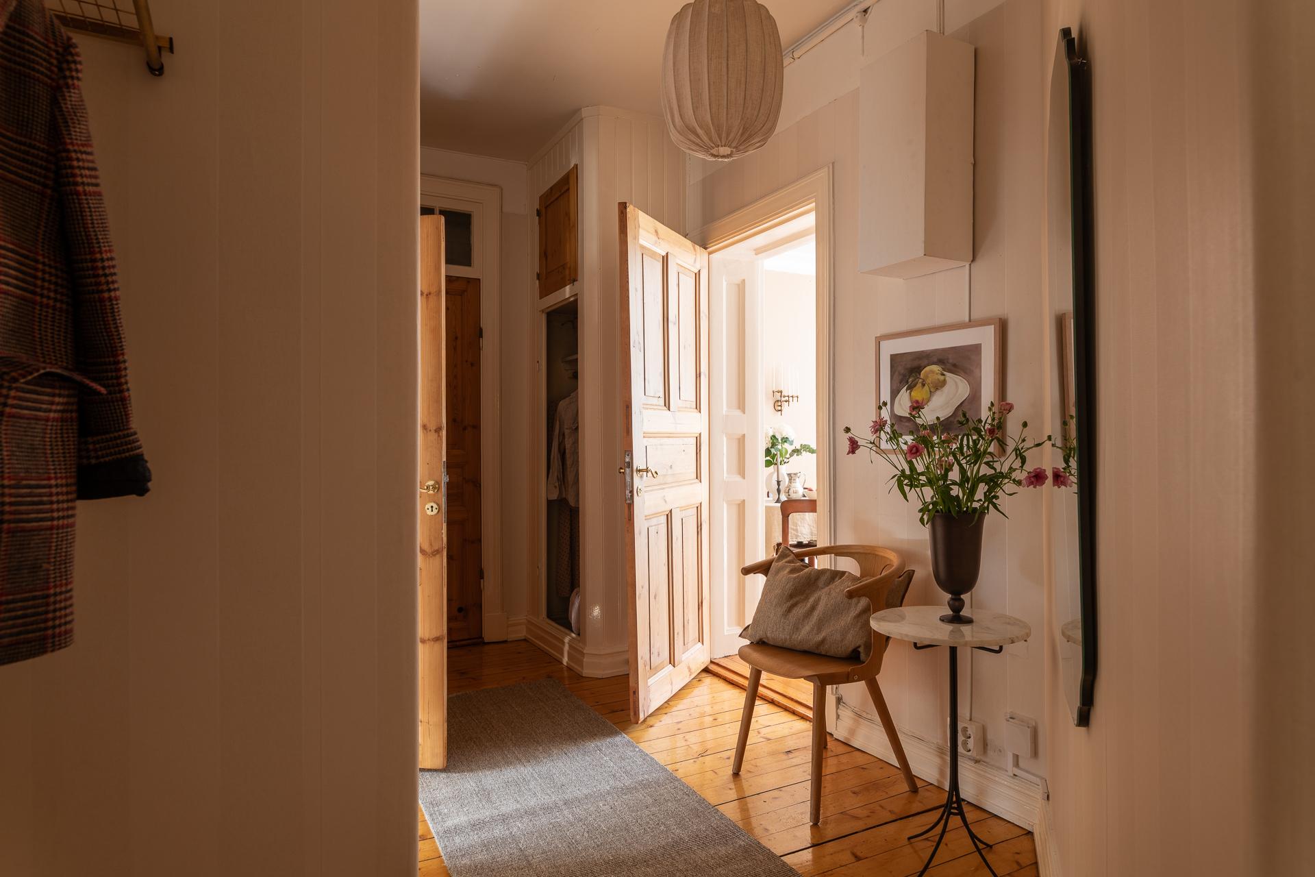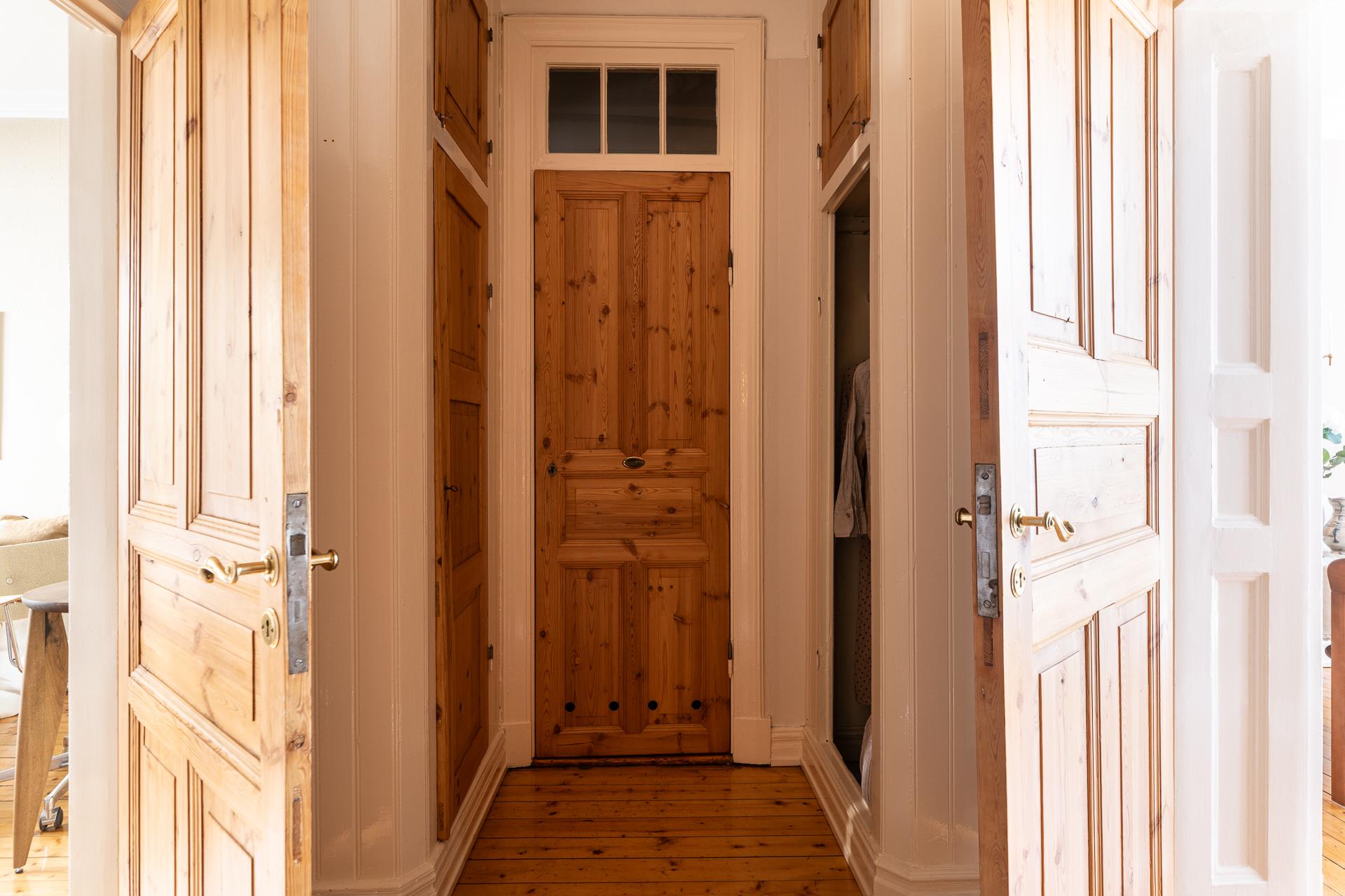 Förbi hallen igen, öppna upp spegeldörren och fortsätt fängslas och förälskas. Det är inte helt lätt att avgöra vad man gillar bäst, det är så mycket som går att uppskatta i denna lägenheten som är svårt att hitta i dagens hårt renoverade lägenheter. Utöver allt som andas byggvård är också genomgångskänslan underbar, att ni har ingång både från hallen och köket vilket ger möjlighet till ett härligt rörelsemönster i hemmet. Nymålade väggar, "Savann" Från Jotun, lyfter och förstärker listverken som är vita. Tack vare ett rofyllt gårdsläge sover man gärna med öppet fönster, enda bruset kan vara en fågel eller två som kvittrar nu när våren är på ingång.