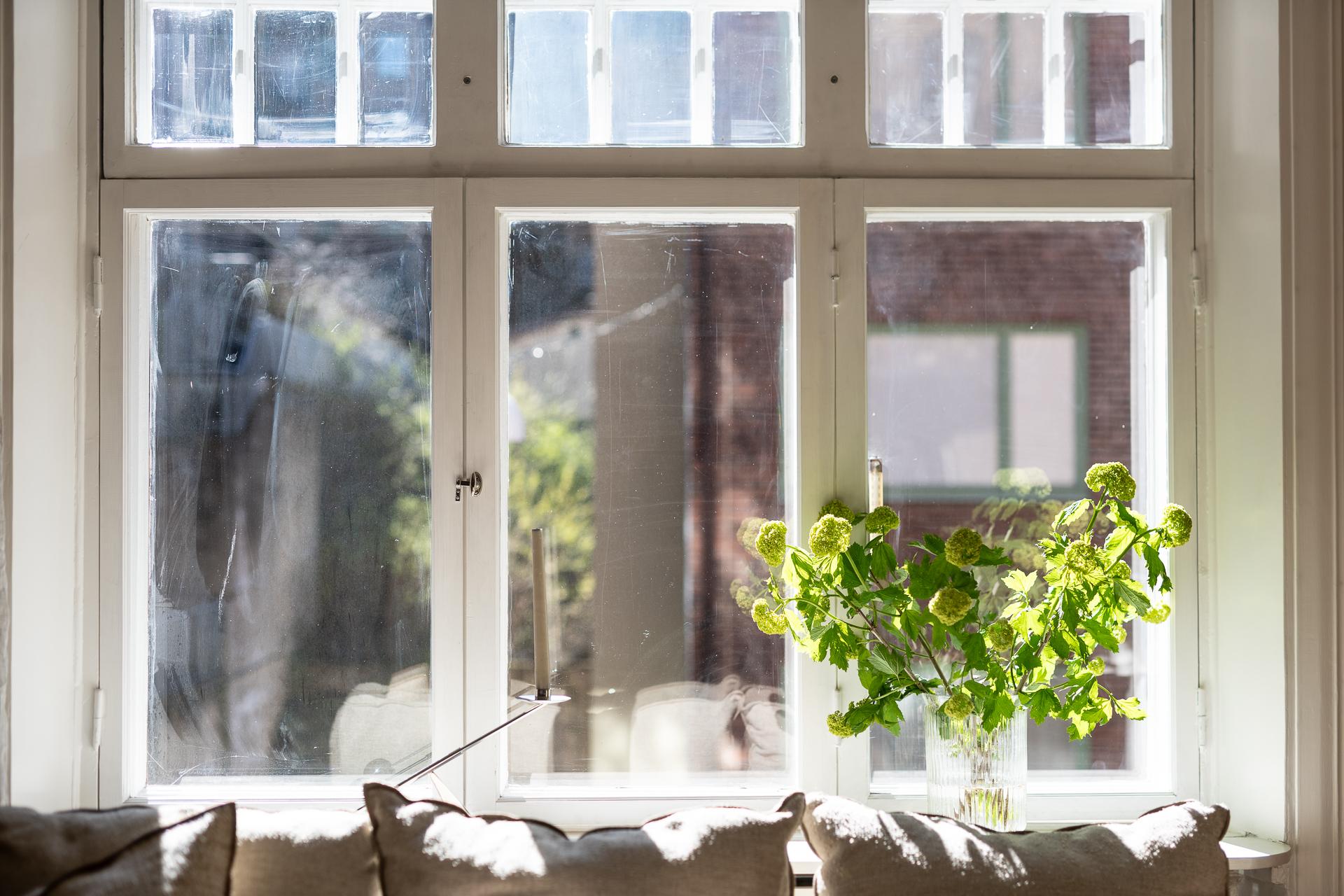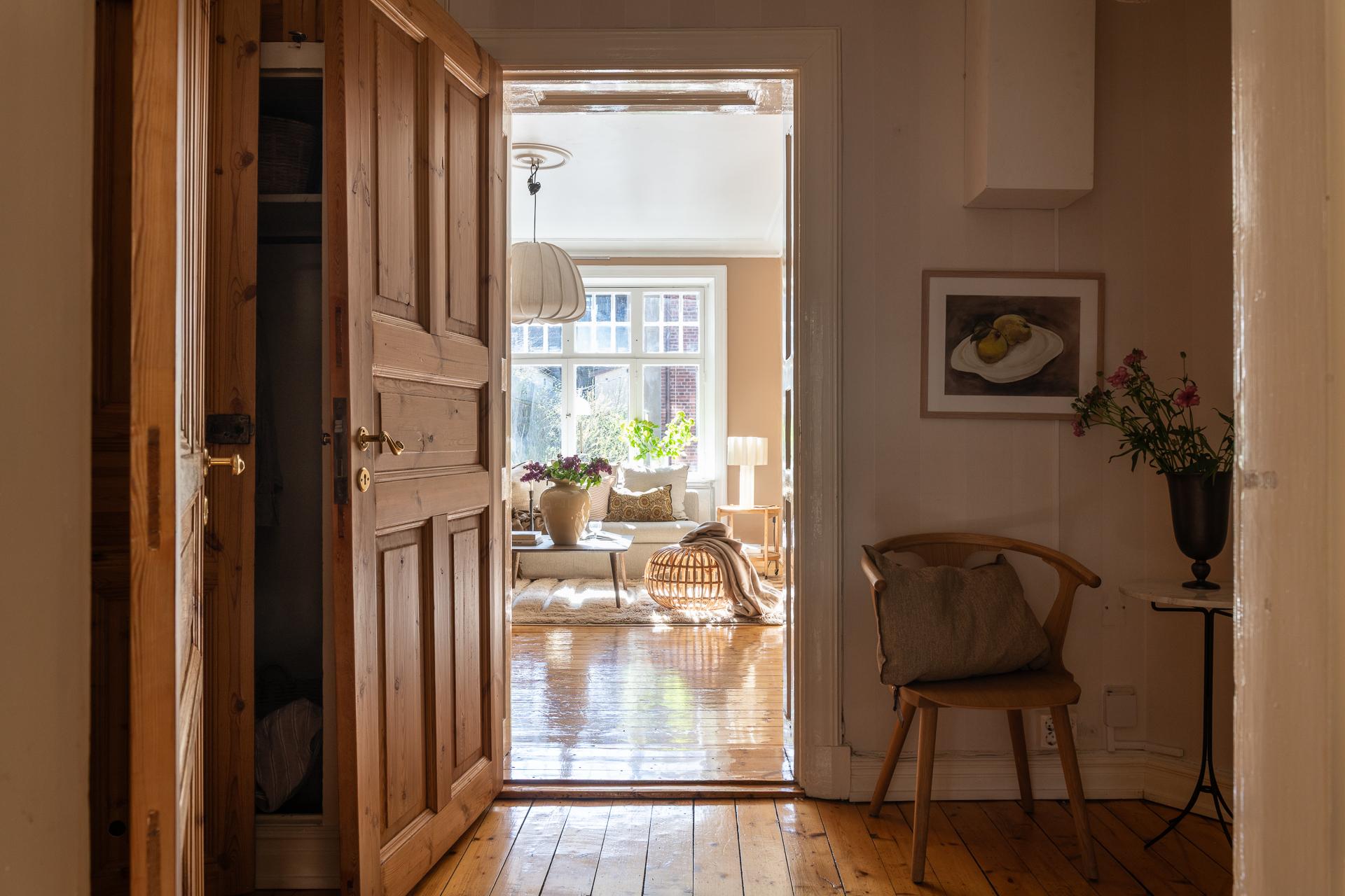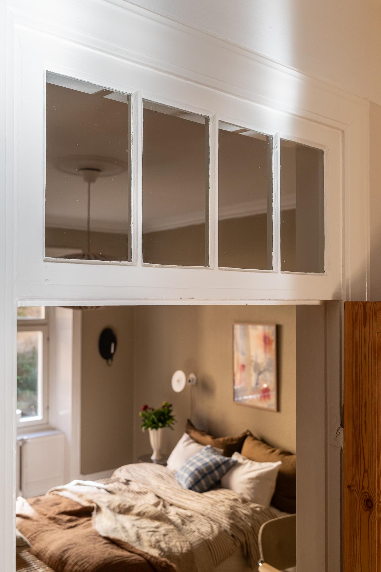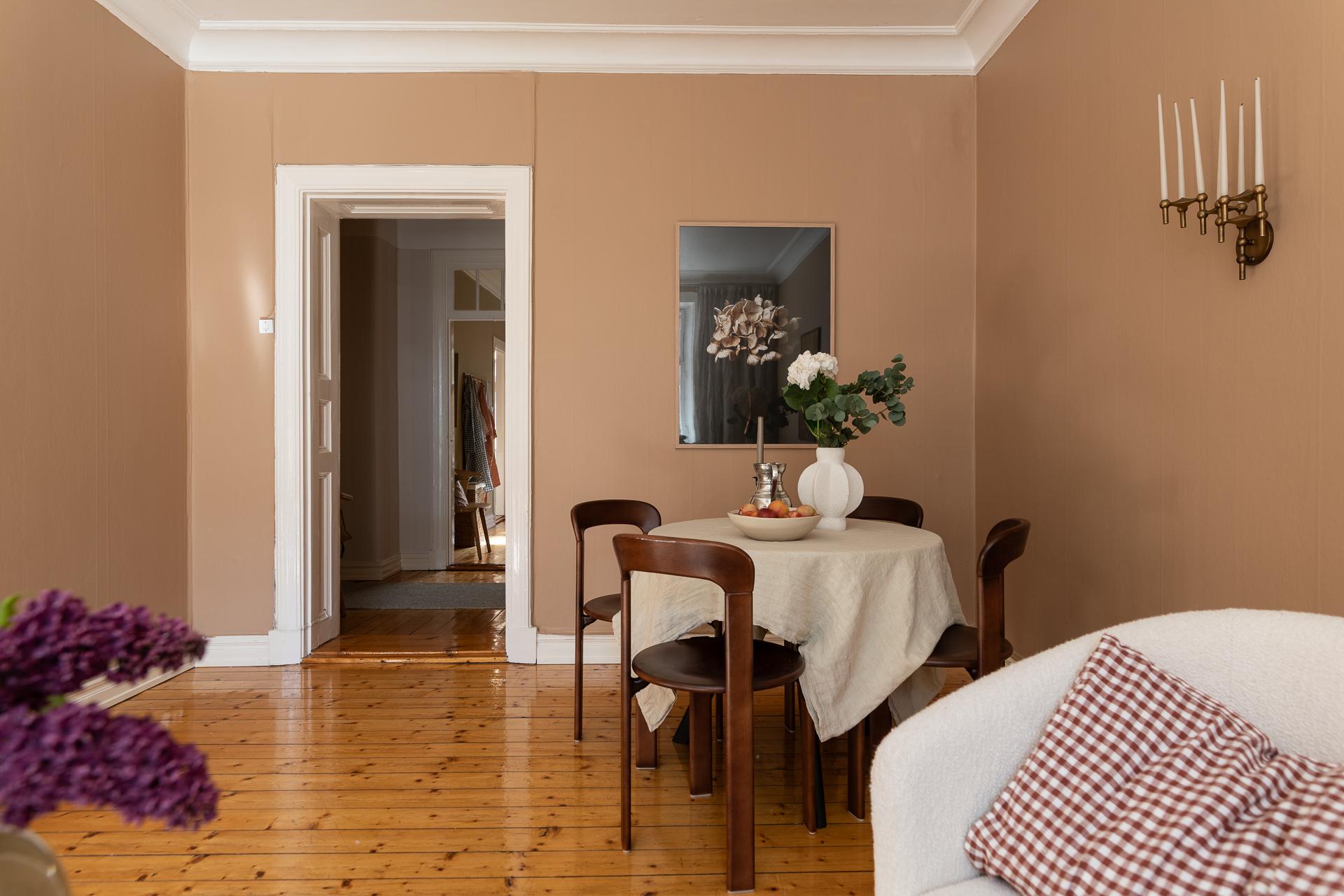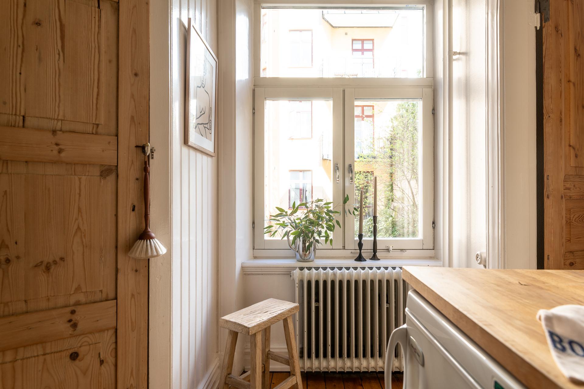 Förbi hallen igen, öppna upp spegeldörren och fortsätt fängslas och förälskas. Det är inte helt lätt att avgöra vad man gillar bäst, det är så mycket som går att uppskatta i denna lägenheten som är svårt att hitta i dagens hårt renoverade lägenheter. Utöver allt som andas byggvård är också genomgångskänslan underbar, att ni har ingång både från hallen och köket vilket ger möjlighet till ett härligt rörelsemönster i hemmet. Nymålade väggar, "Savann" Från Jotun, lyfter och förstärker listverken som är vita. Tack vare ett rofyllt gårdsläge sover man gärna med öppet fönster, enda bruset kan vara en fågel eller två som kvittrar nu när våren är på ingång.