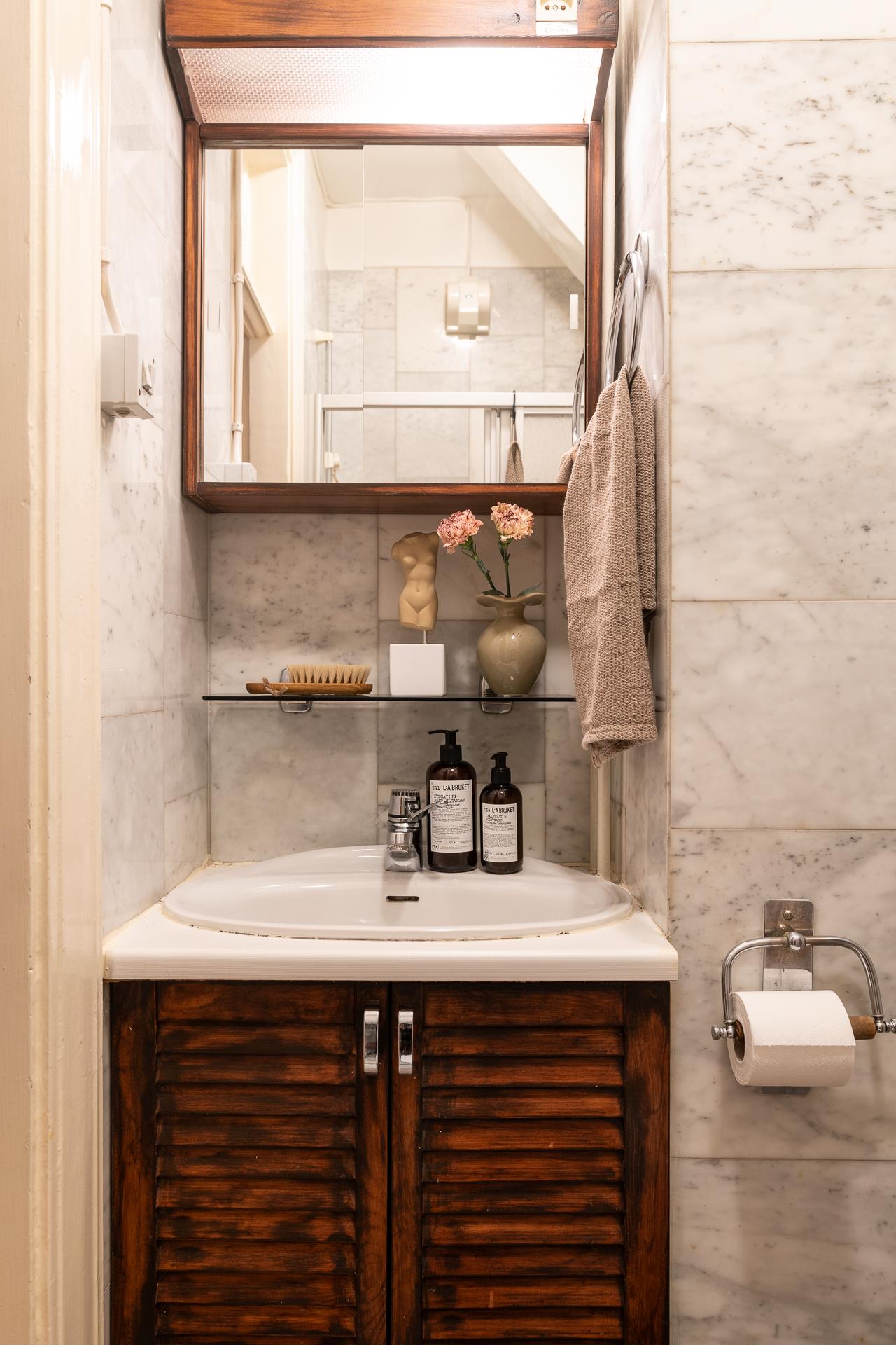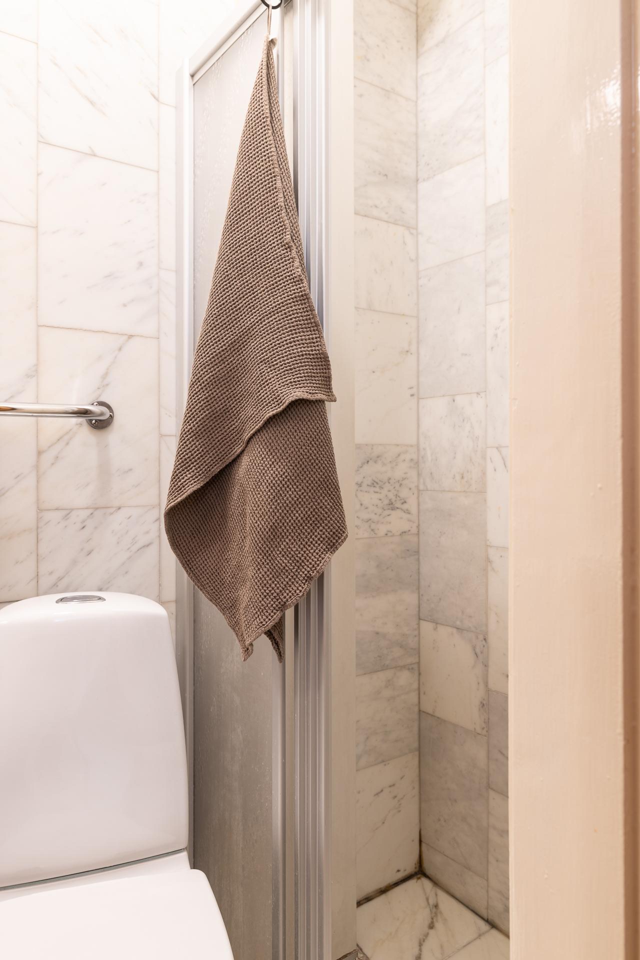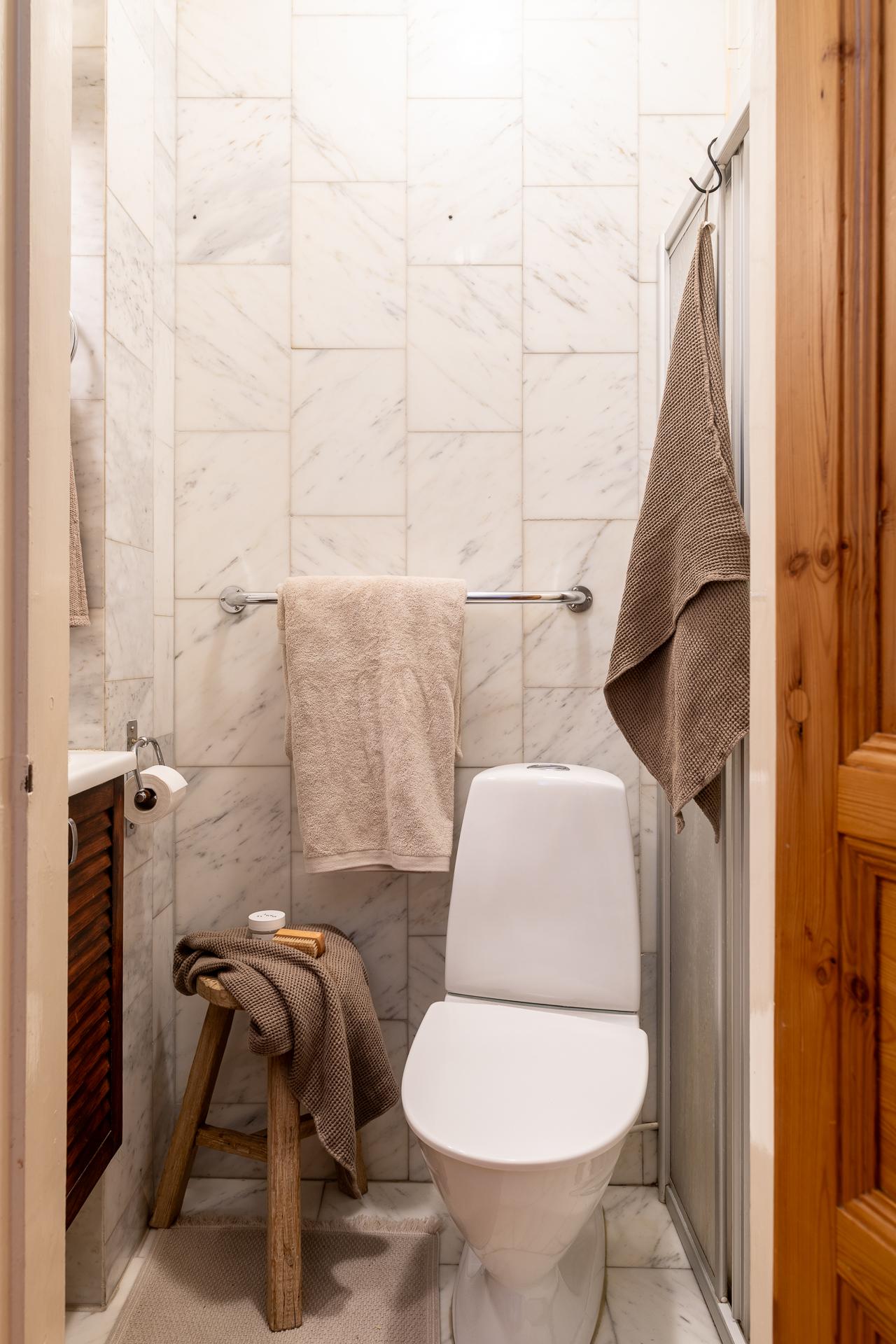 Ett litet men naggande gott badrum. Tack vare en familjekontakt nere i italienska Carrara la föregående ägare beslag på ett större parti marmor som fick utgöra basen för detta badrum för xx år sen. Både väggar och golv är klädda i detta exklusiva stenmaterial. Fint att jobba med och behålla och kanske komplettera med ny toalett, badrumsskåp och blandare. Högre upp i huset har man totalrenoverat badrum och då tagit en del av hallen i anspråk för att på så vis ha fått ett större badrum med tvättmaskin.