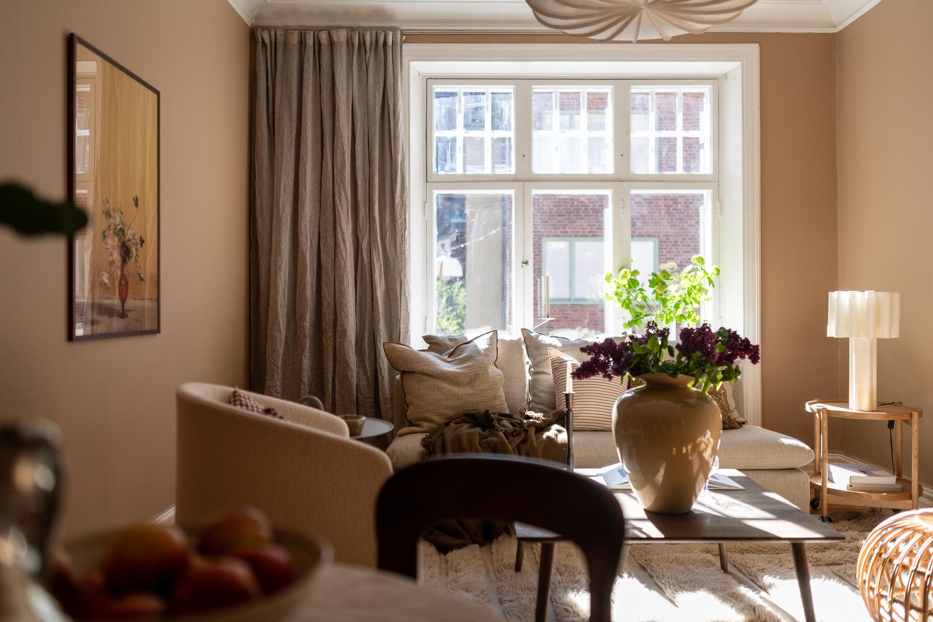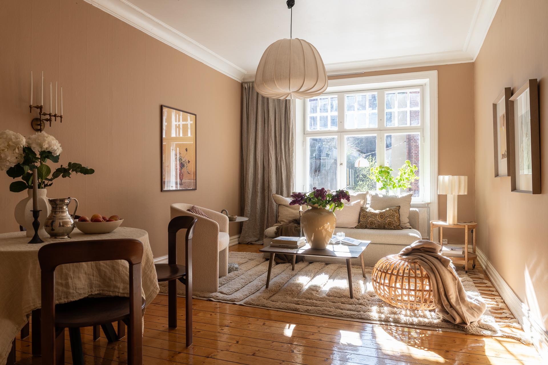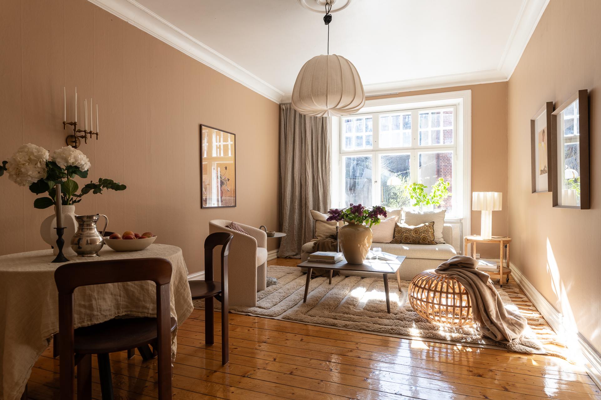 Till höger om hallen ligger vardagsrummet, vilket just nu badar i ljus under eftermiddagarna tack vare läget i väster. Det är svårt att inte uppmärksamma fönstren lite extra, 114 år gamla i originalutförande och sådär spräckliga och finstämda som gamla rutor är. Ett treluftsfönster med överljus där spröjset ger hela 18 rutor upptill och tre stora nertill. Ljuset faller helt magiskt på brädgolvet där solkatterna borrar sig långt in i lägenheten. Gjutjärnsradiatorn står tungt och stolt där den står och skänker både värme och ett estetiskt mervärde. Rummet ramas också in av den nätta stuckaturen, fotlisterna och foder som allt är från byggåret 1912. Här är det enkelt att möblera tack vare rummets utformning, och ni rymmer med lätthet både soffgrupp, tv-möbel och om man önskar ett matsalsbord. Väggarna är helt nyumålade i färgen "Peachy" från Jotun.