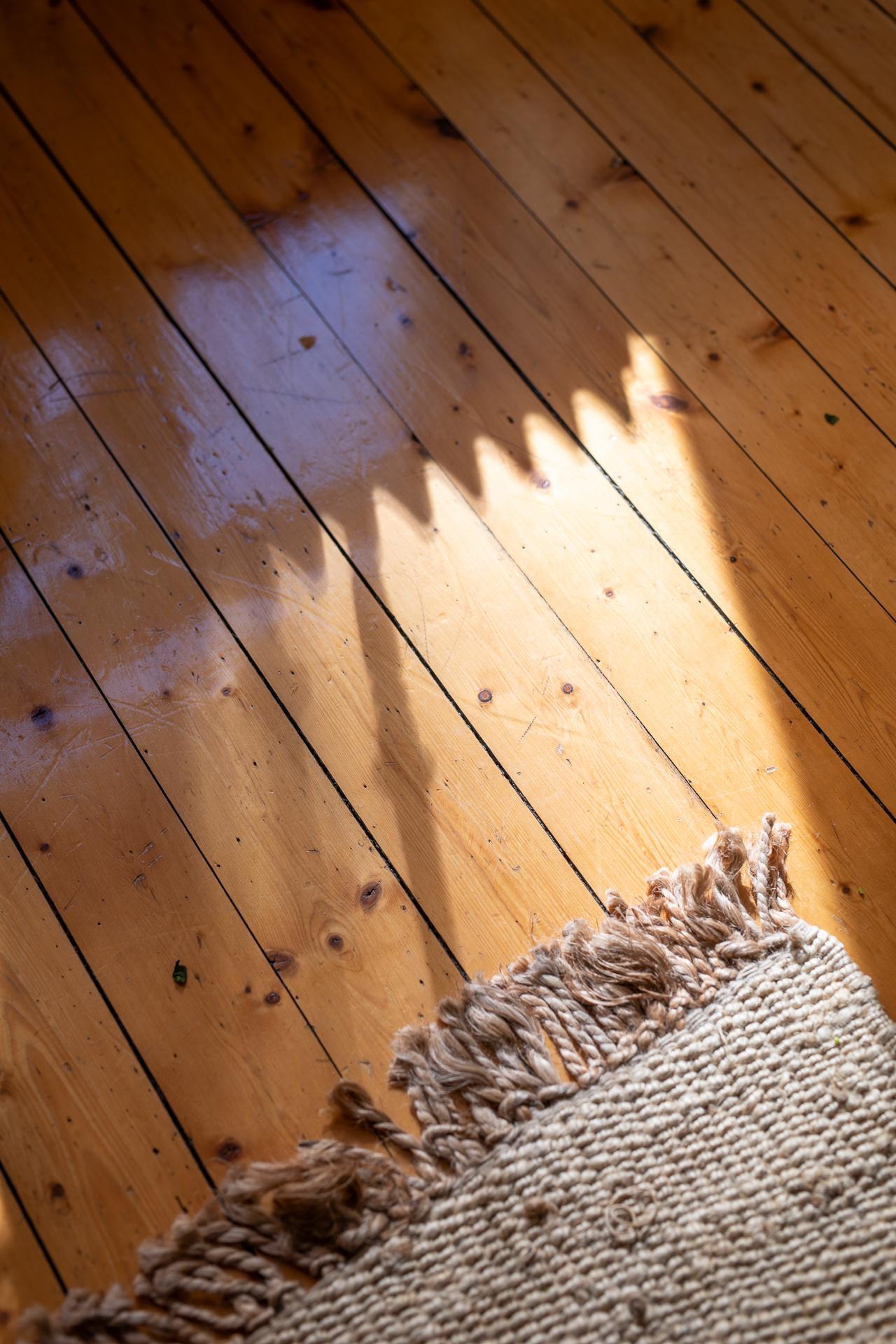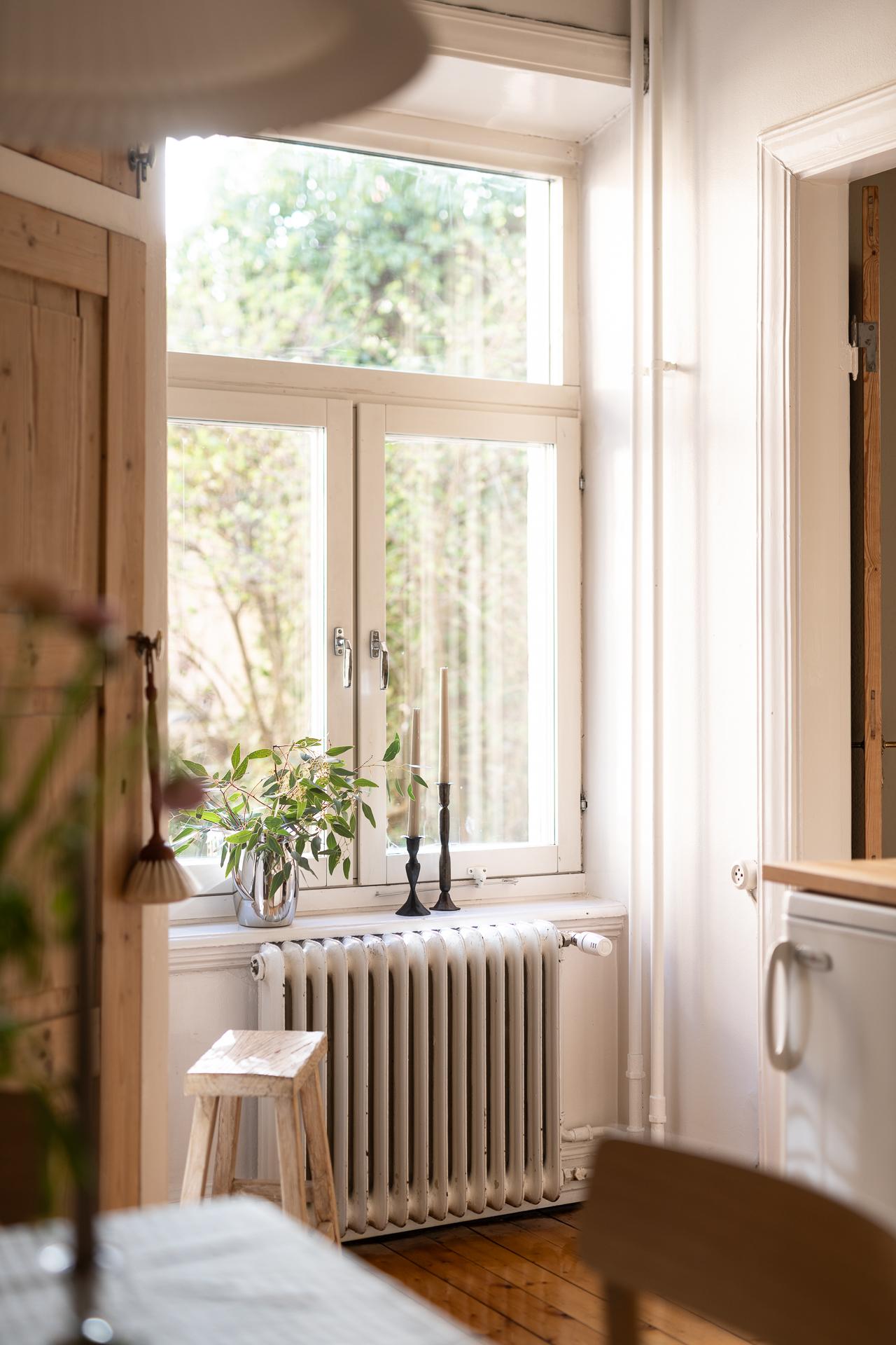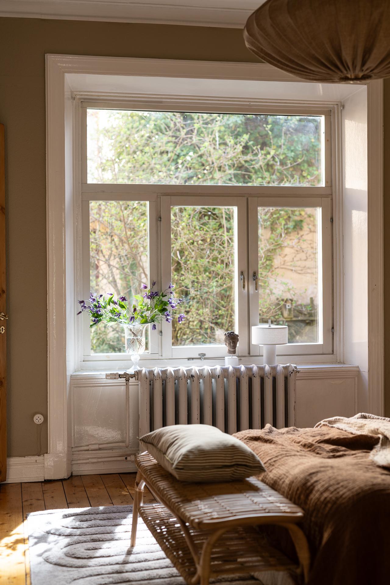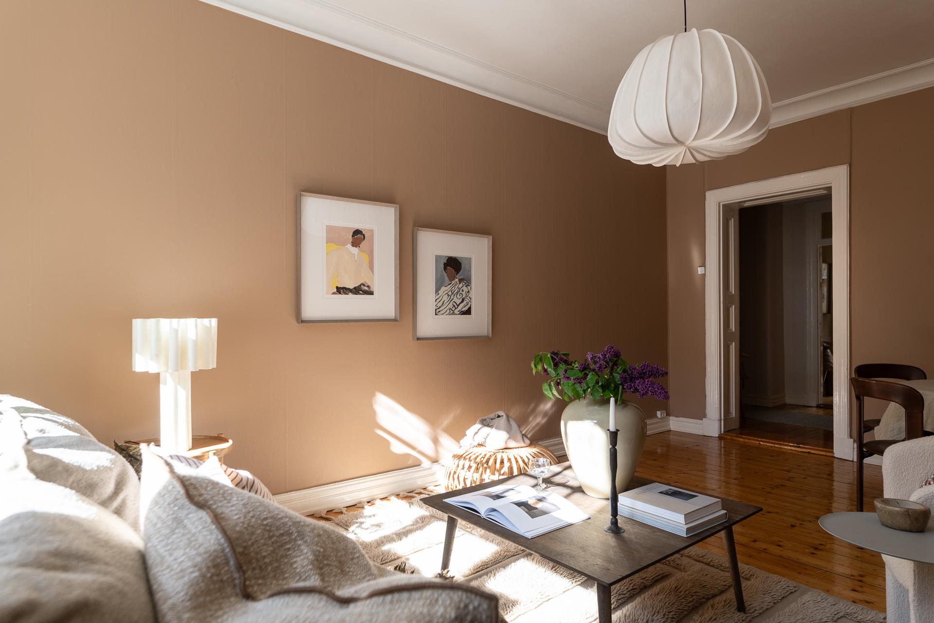 Till höger om hallen ligger vardagsrummet, vilket just nu badar i ljus under eftermiddagarna tack vare läget i väster. Det är svårt att inte uppmärksamma fönstren lite extra, 114 år gamla i originalutförande och sådär spräckliga och finstämda som gamla rutor är. Ett treluftsfönster med överljus där spröjset ger hela 18 rutor upptill och tre stora nertill. Ljuset faller helt magiskt på brädgolvet där solkatterna borrar sig långt in i lägenheten. Gjutjärnsradiatorn står tungt och stolt där den står och skänker både värme och ett estetiskt mervärde. Rummet ramas också in av den nätta stuckaturen, fotlisterna och foder som allt är från byggåret 1912. Här är det enkelt att möblera tack vare rummets utformning, och ni rymmer med lätthet både soffgrupp, tv-möbel och om man önskar ett matsalsbord. Väggarna är helt nyumålade i färgen "Peachy" från Jotun.