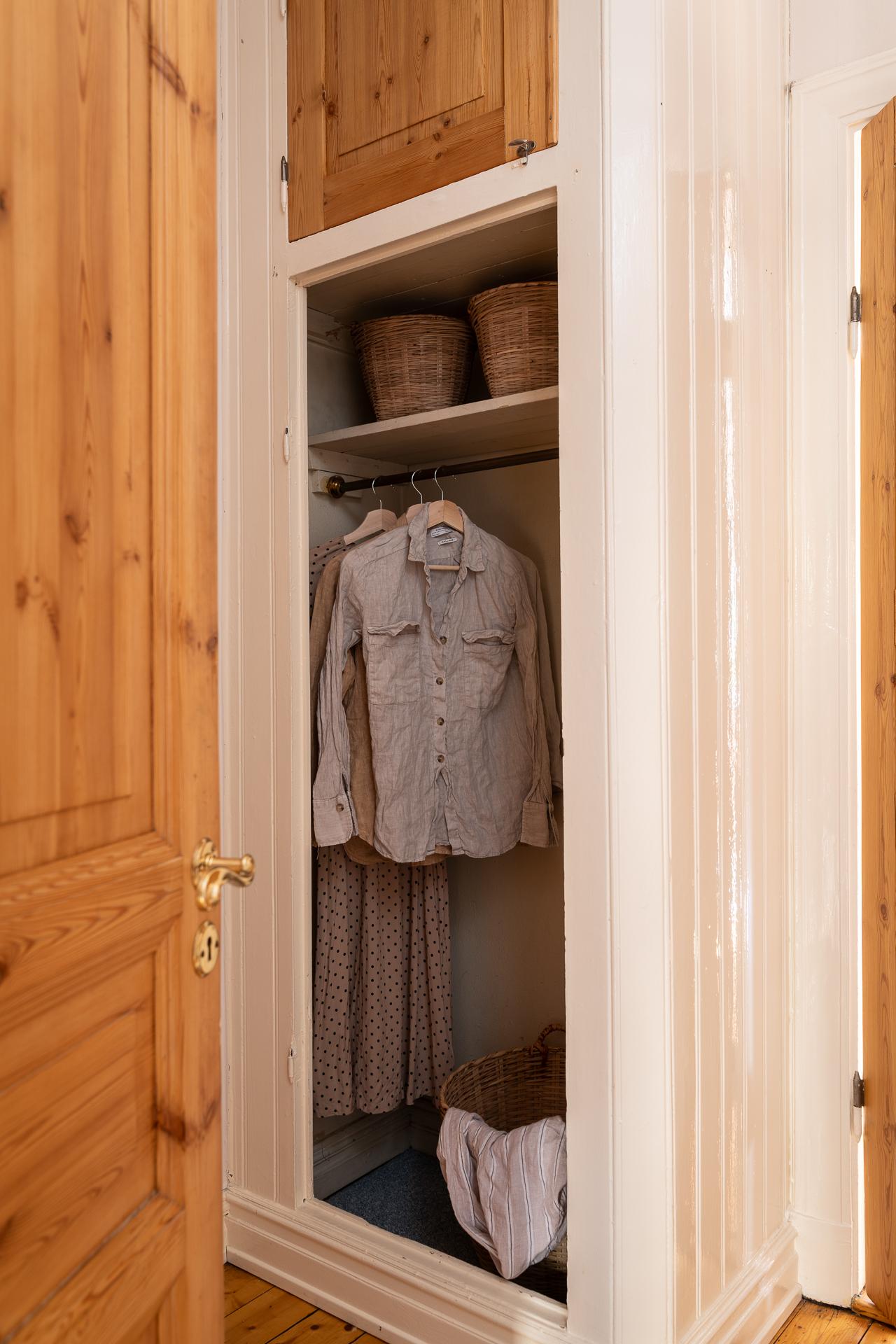 Hallen tar genast för sig med med dörrar gångar som leder vidare till samtliga rum i bostaden. Här finns gott om förvaring, både med plats för en avhängningsplats till vänster där både jackor och skor får plats, men också de inbyggda garderoberna. Spegeldörrarna är trärena och bra som de är, men är också enkla att måla ifall man önskar.