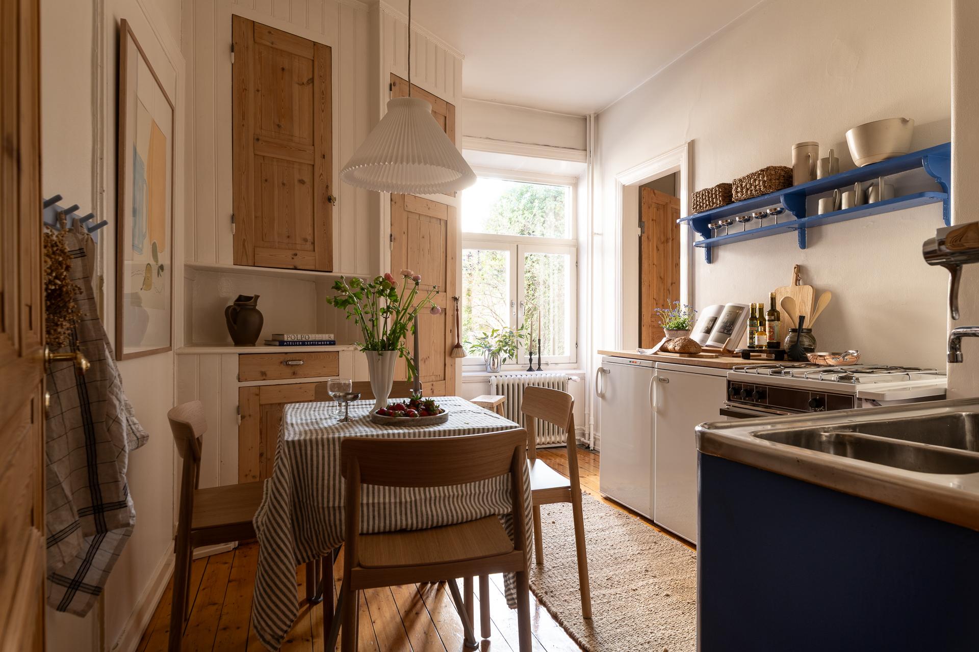 Med ingång från både hall och sovrum ligger köket. Ett kök med en stor dos själ och en stark identitet och samtidigt en potential som är skyhög. Perfekt så som det är med hörnskafferi och serveringsskåp, pärlspont och platsbyggda skåp å ena sidan. Andra kanske ser en tom canvas med chans att rita upp det nya köket som man alltid drömt om. Eller kanske något mittemellan, behåll stommar och grund och tillföra en något modernare touch. Oavsett vad ni landar på är det en fin plats att blicka ut över gården och dess grönska. Knäpptyst trots det centrala läget.