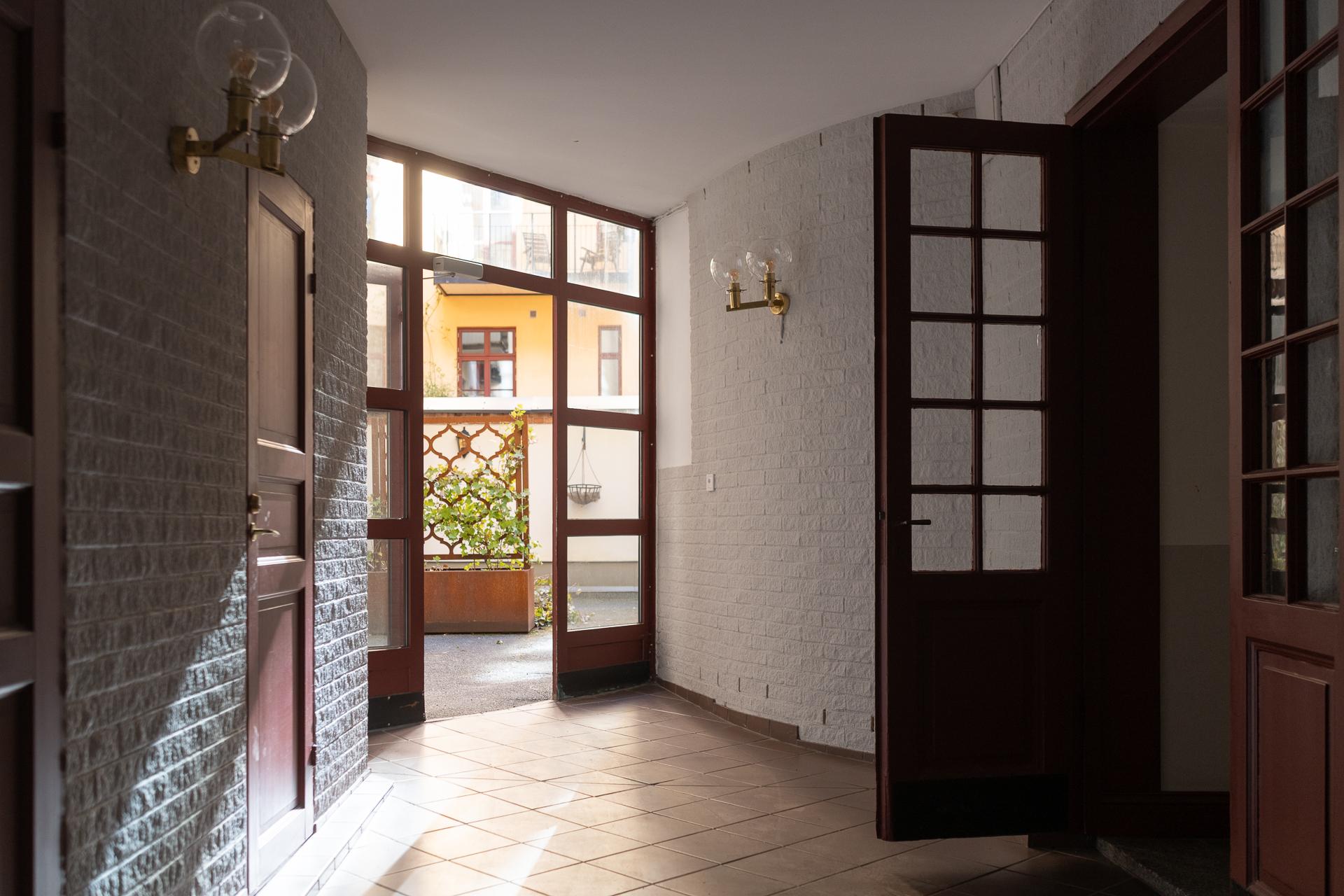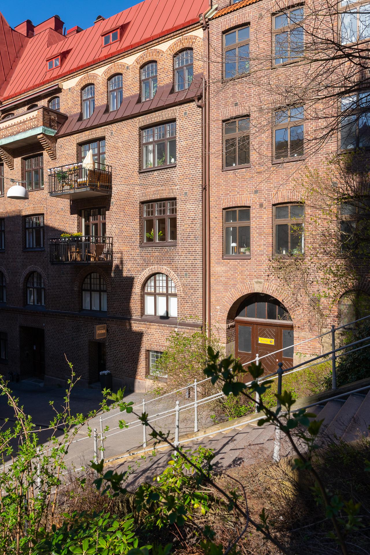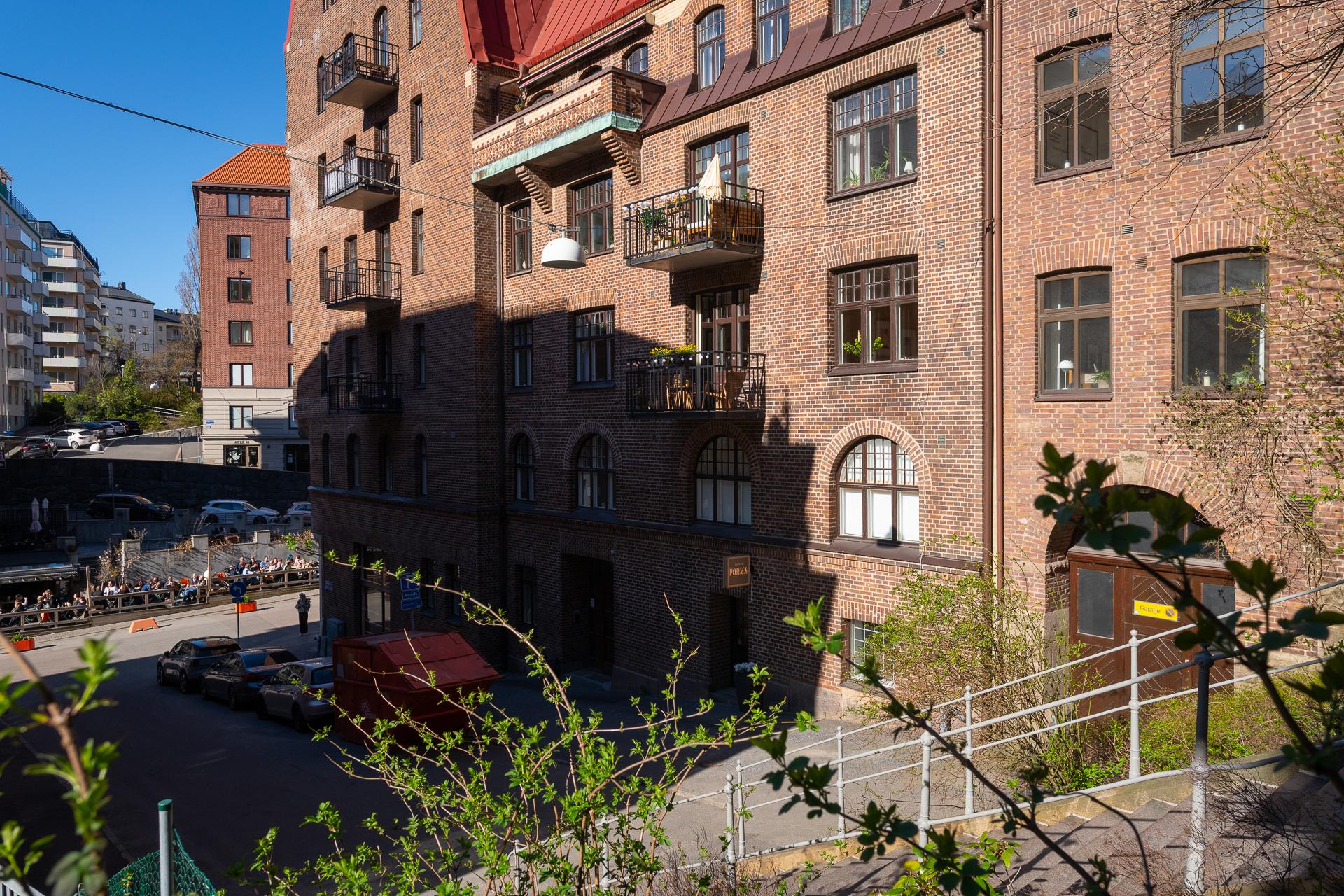 Innanför porten på Kungsgatan 9A döljer sig en mysig innergård med prydliga planteringar och grönskande buskage. Sommartid finns här sittmöbler och grillmöjligheter. Cyklar parkeras under tak på gården samt även i källaren. Föreningens tvättstuga ligger på bekvämt avstånd i källaren. Den är utrustad med två tvättmaskiner, två torktumlare samt ett torkskåp. Till lägenheten hör ett stort vindsförråd.