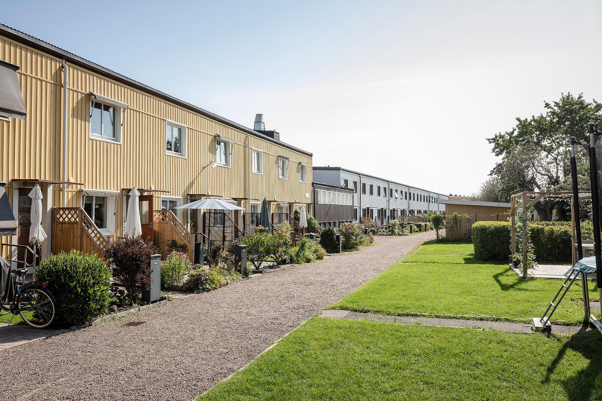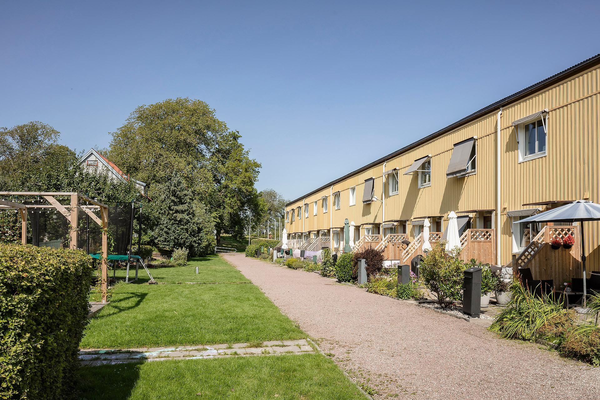 Charmigt radhus i bostadsrättsform med två uteplatser som vetter åt både öster och väster, vilket gör att solen kan följas från morgon till kväll under årets varmare månader. Planlösningen är yteffektiv och väl genomtänkt, där kök och vardagsrum samspelar i ett öppet och luftigt flöde på entréplanet. Husets rundade trappa i mitten blir ett vackert arkitektoniskt inslag och ger rummet karaktär. På övervåningen finns två sovrum och ett badrum, medan källarplanet erbjuder ett generöst extrarum som kan användas som gästrum, arbetsrum, TV-rum eller lekrum.