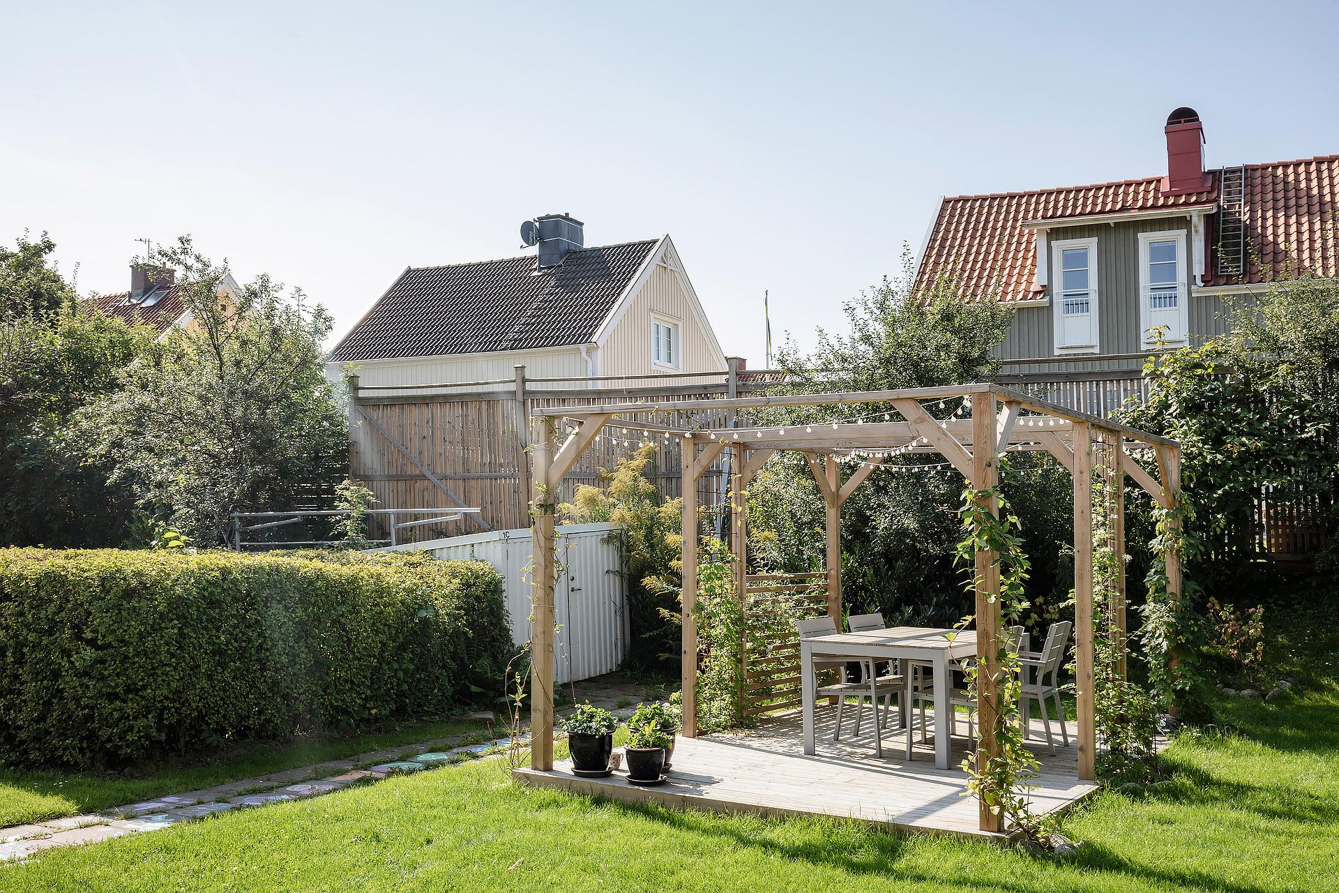 Bostaden disponerar två uteplatser med nyttjanderätt, en på vardera sida av huset. Framsidan är belagd med stenplattor och vetter mot föreningens gröna gård där solen når fram under eftermiddag och kväll. Baksidan har trätrall och en mer avskild känsla, med plats för utemöbler, grill och odling i krukor eller mindre planteringar.