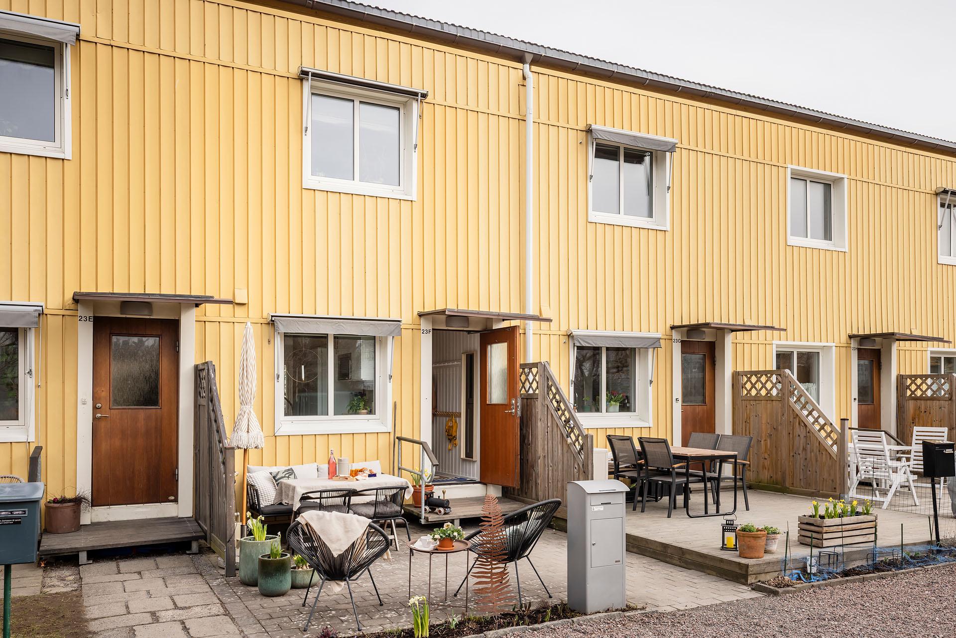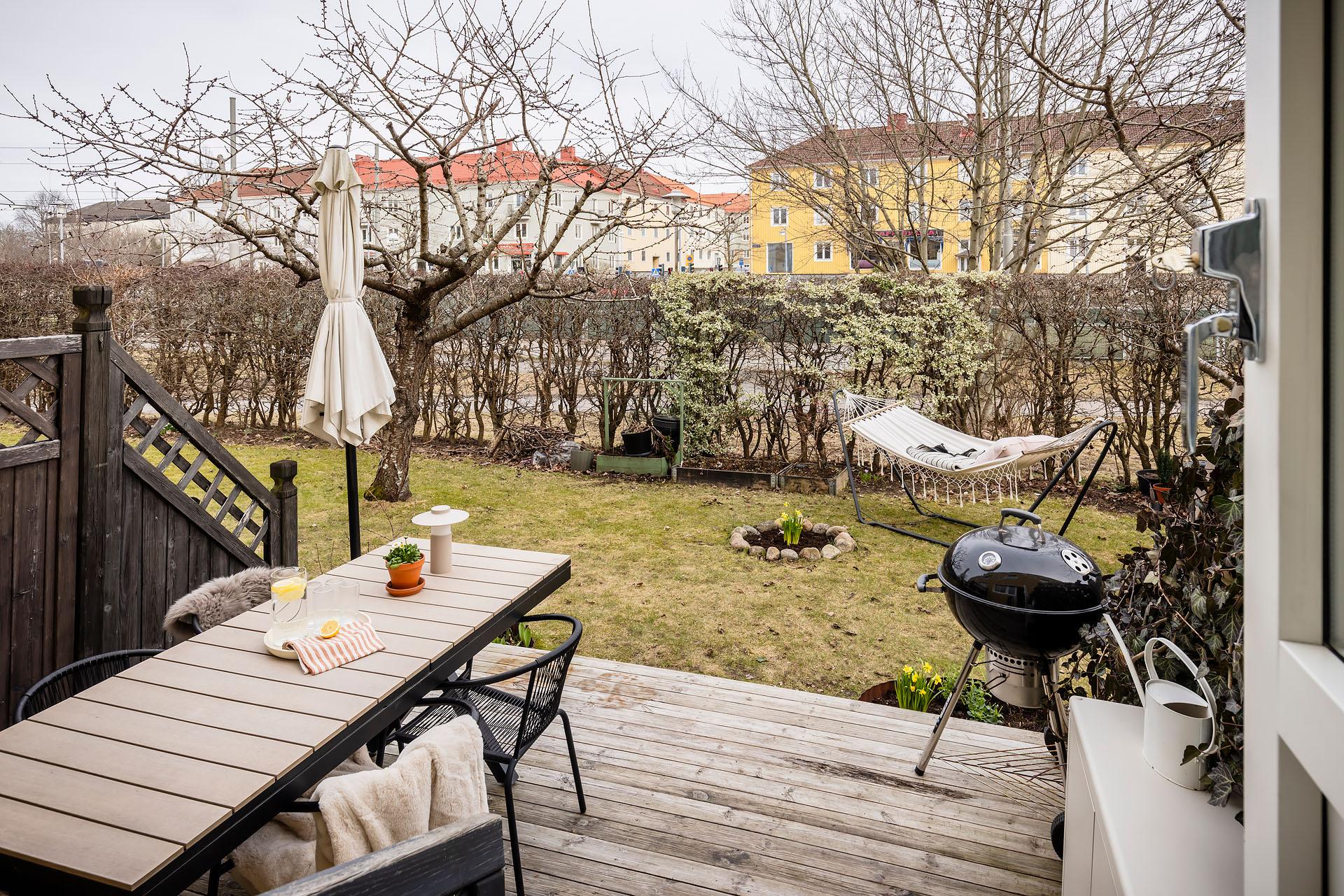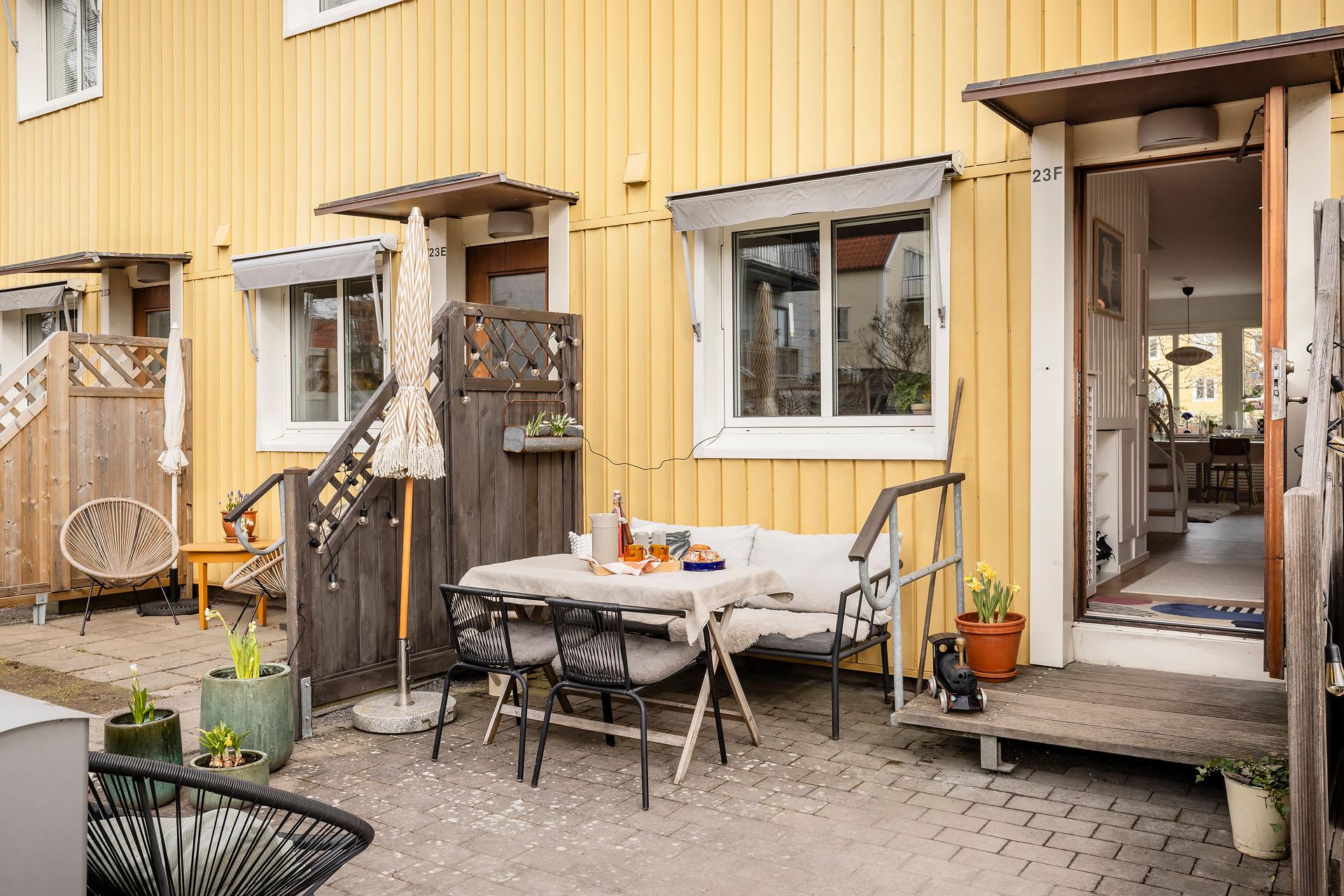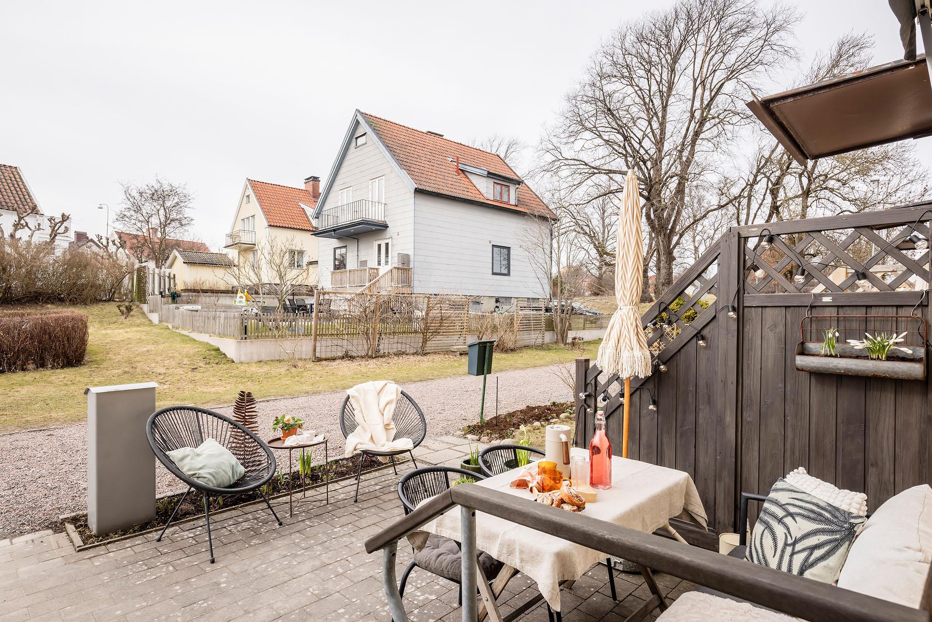 - Balkong/Uteplats: Ja. Direkt utgång till två egna uteplatser, den ena i öster och den andra i väster. Uteplatserna nyttjas med nyttjanderättsavtal.