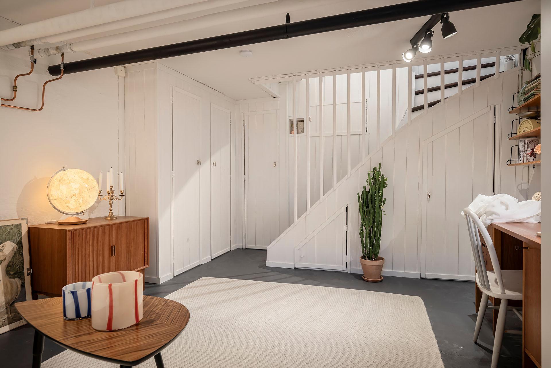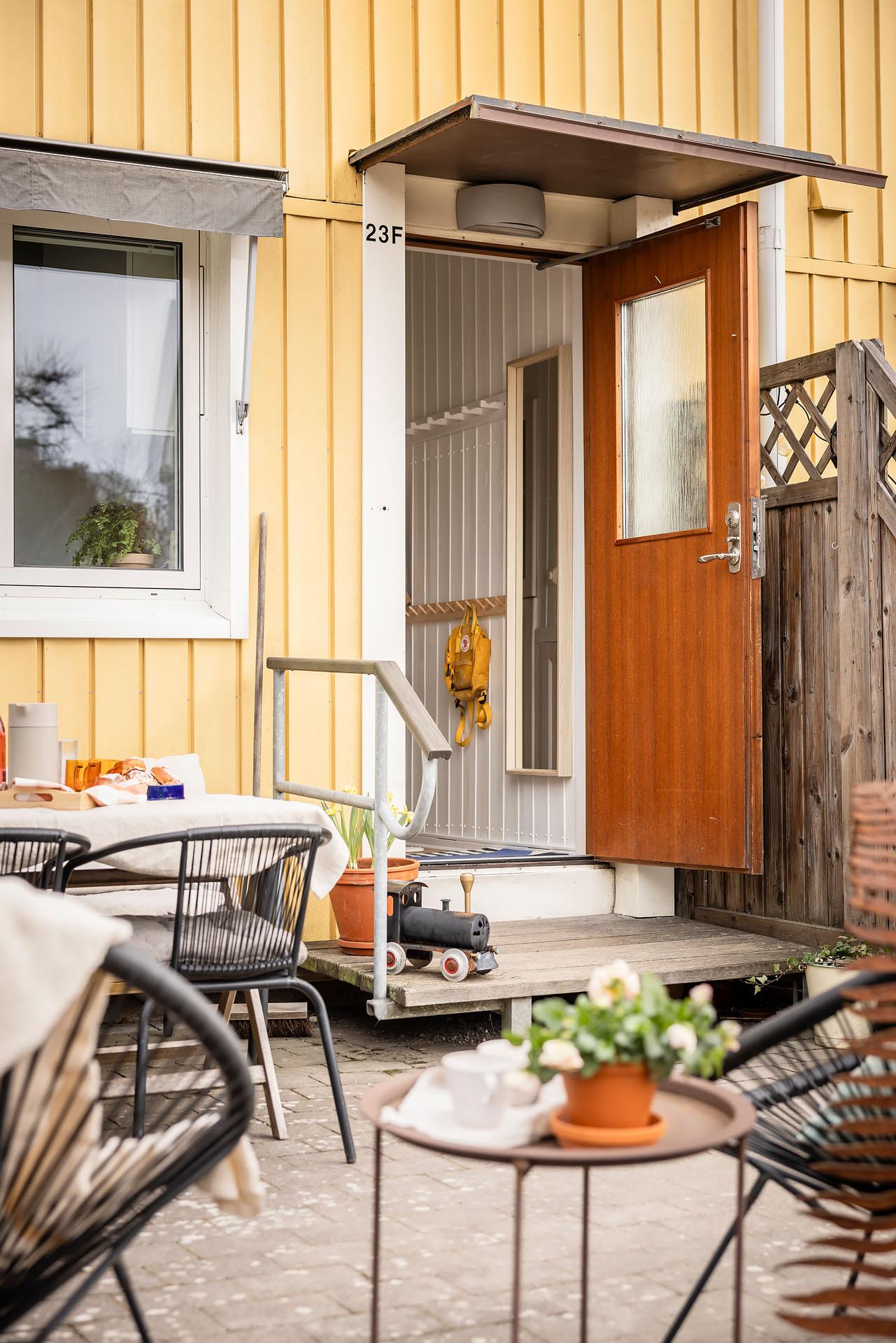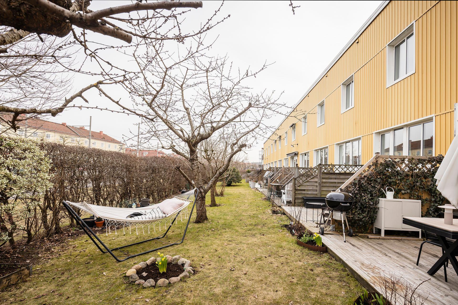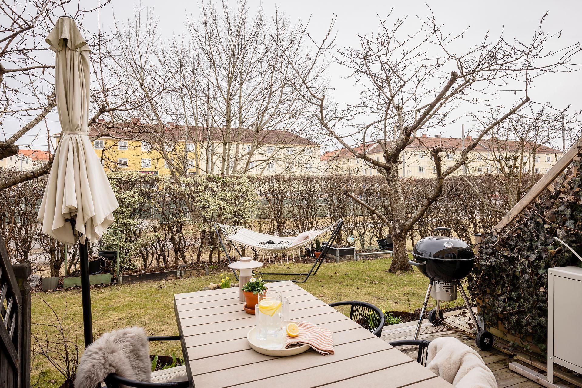 - Balkong/Uteplats: Ja. Direkt utgång till två egna uteplatser, den ena i öster och den andra i väster. Uteplatserna nyttjas med nyttjanderättsavtal.