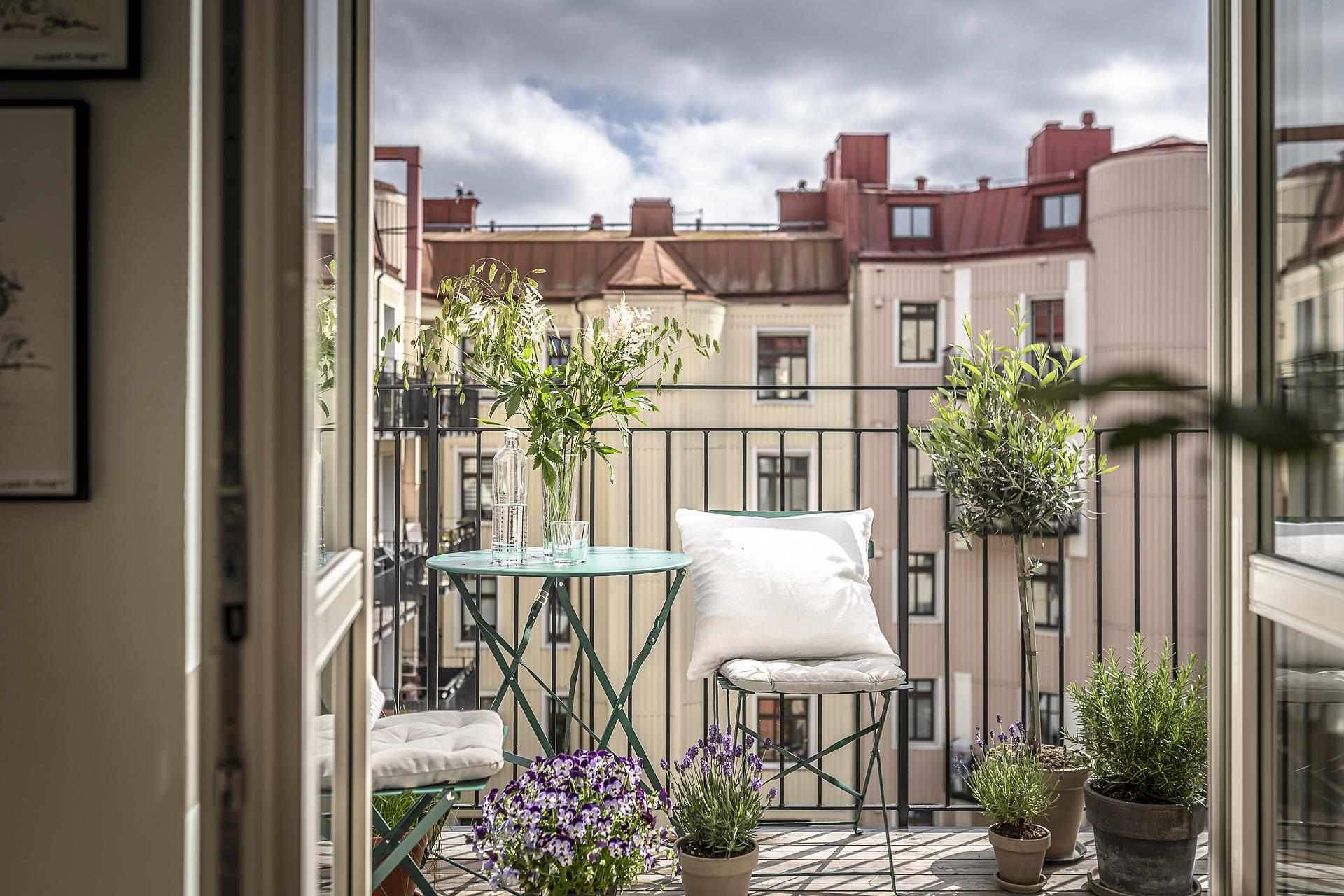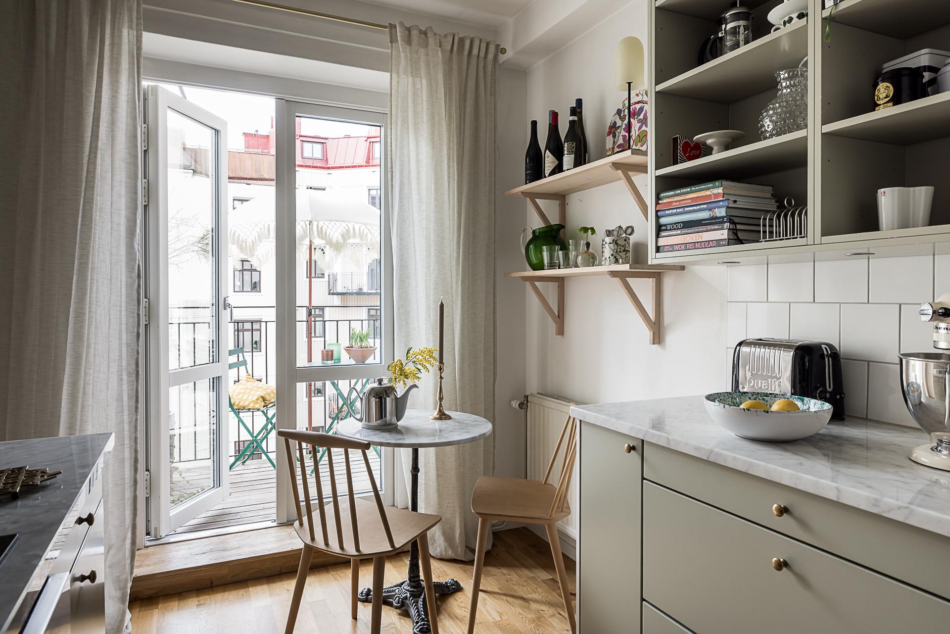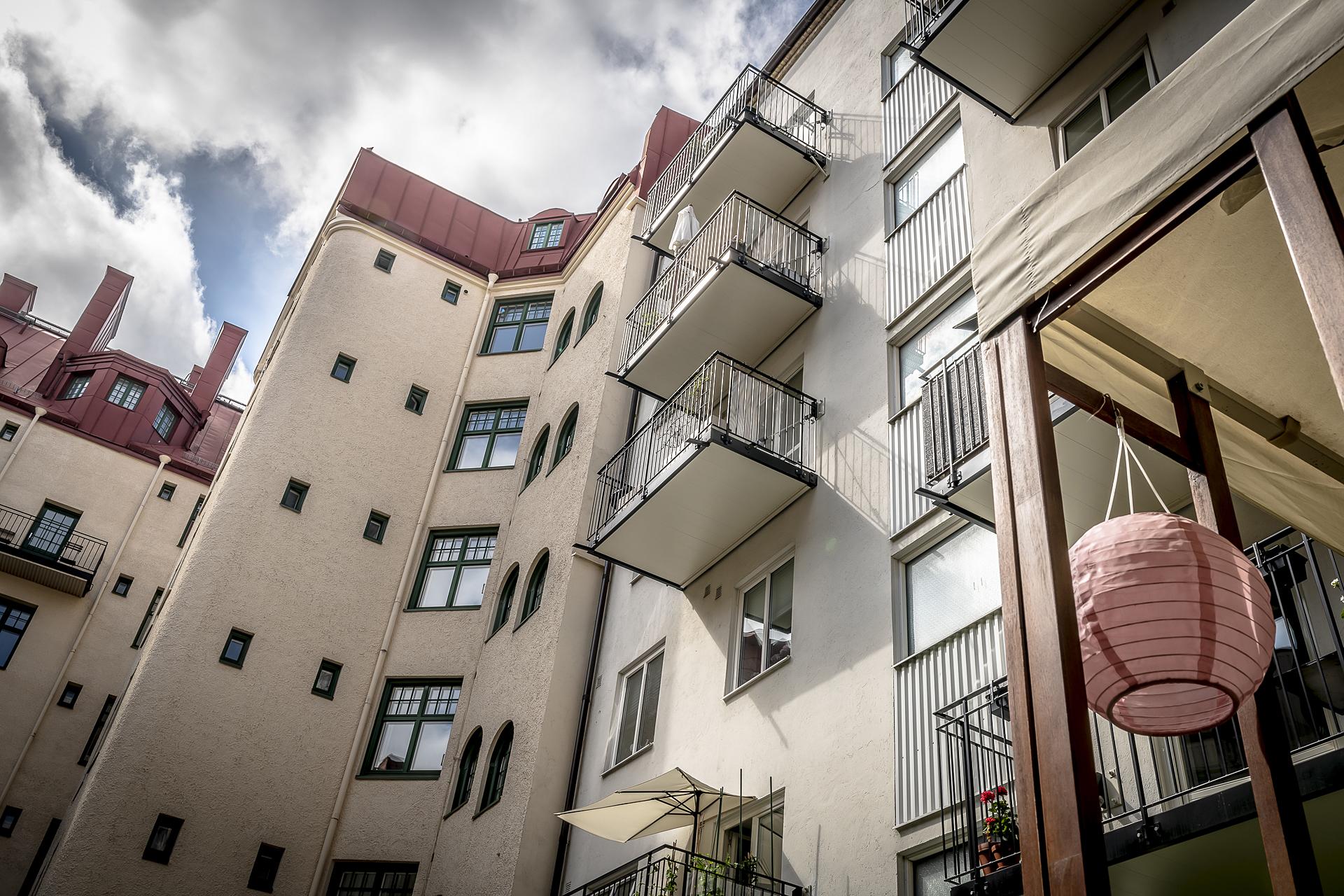 Med lugnt gårdsläge ligger köket som är en mycket trivsam plats med utgång till den fantastiska balkongen i rakt söderläge. Här uppe är himlen den närmsta grannen och balkongen blir snabbt en favorit med sitt soliga läge mot den öppna grönskande innergården. De glasade dörrarna står oftast öppna och suddar ut gränsen mellan ute och inne.