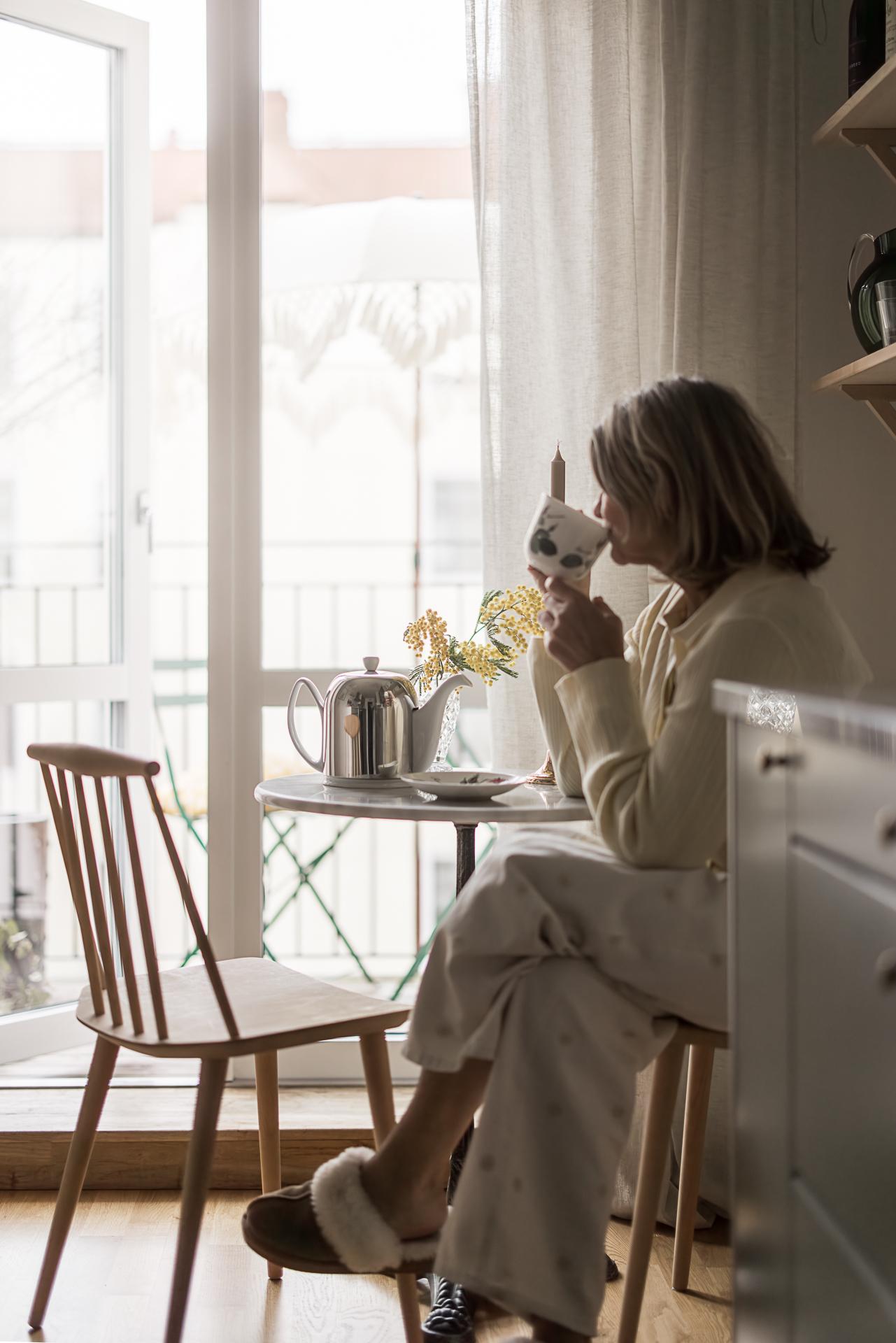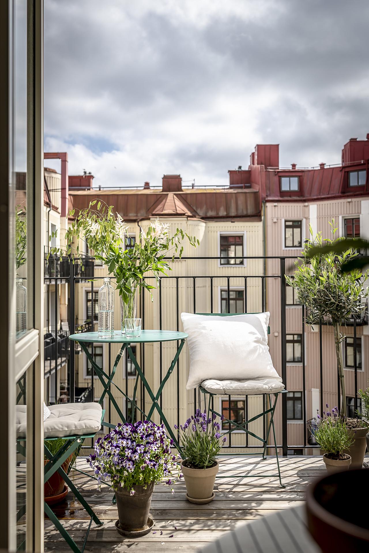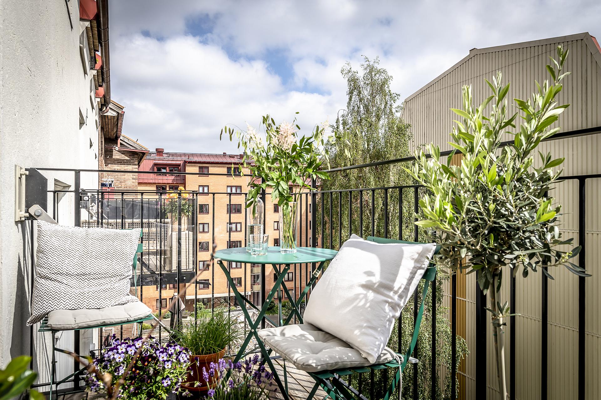 Med lugnt gårdsläge ligger köket som är en mycket trivsam plats med utgång till den fantastiska balkongen i rakt söderläge. Här uppe är himlen den närmsta grannen och balkongen blir snabbt en favorit med sitt soliga läge mot den öppna grönskande innergården. De glasade dörrarna står oftast öppna och suddar ut gränsen mellan ute och inne.