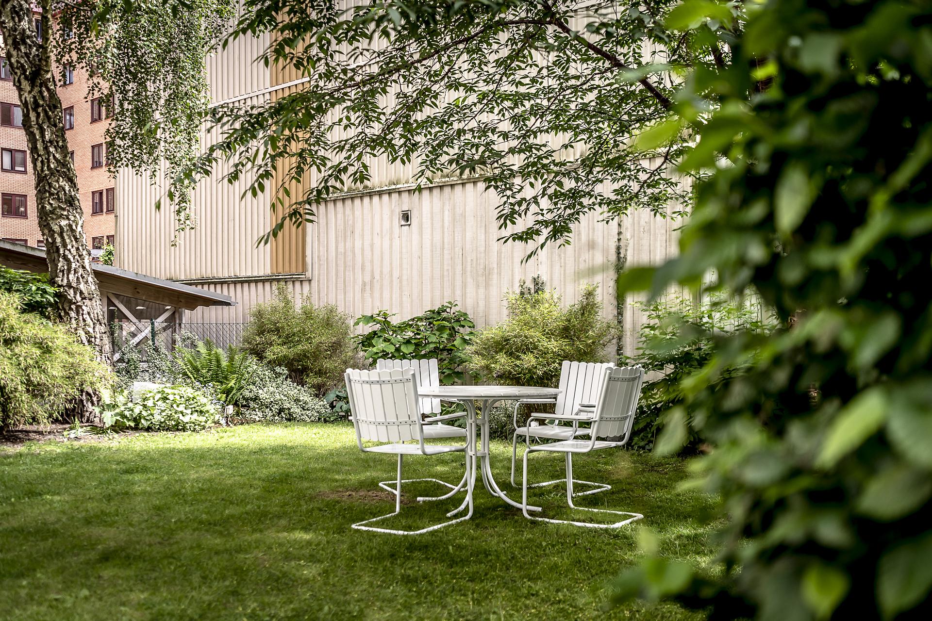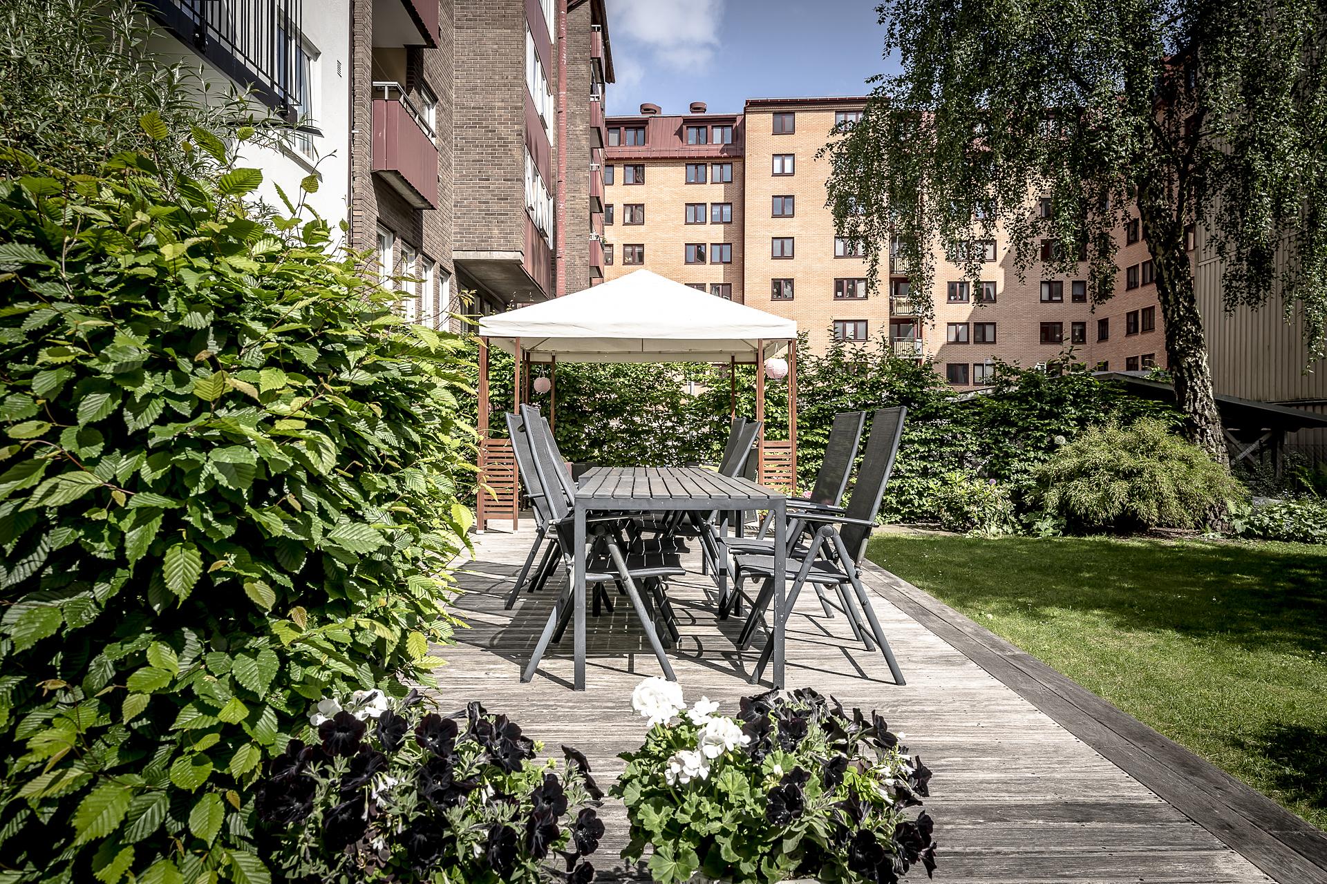 På baksidan av fastigheten finns en gemensam stor innergård som används flitigt av de boende i huset. Innergården är öppen och rymlig med gräsmatta, diverse planteringar, utemöbler, grill mm. Dessutom finns här cykelställ och miljöstation med källsortering.
