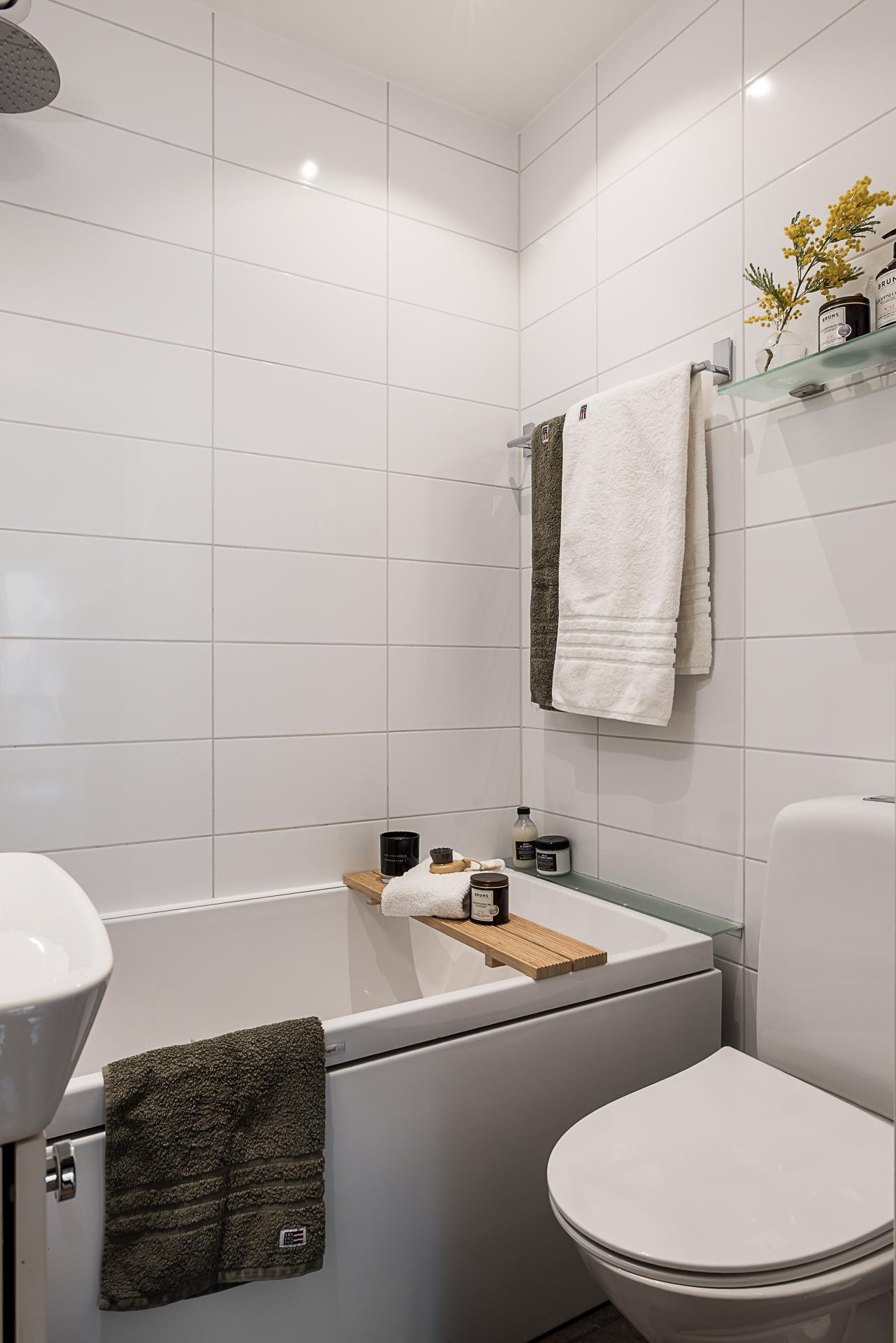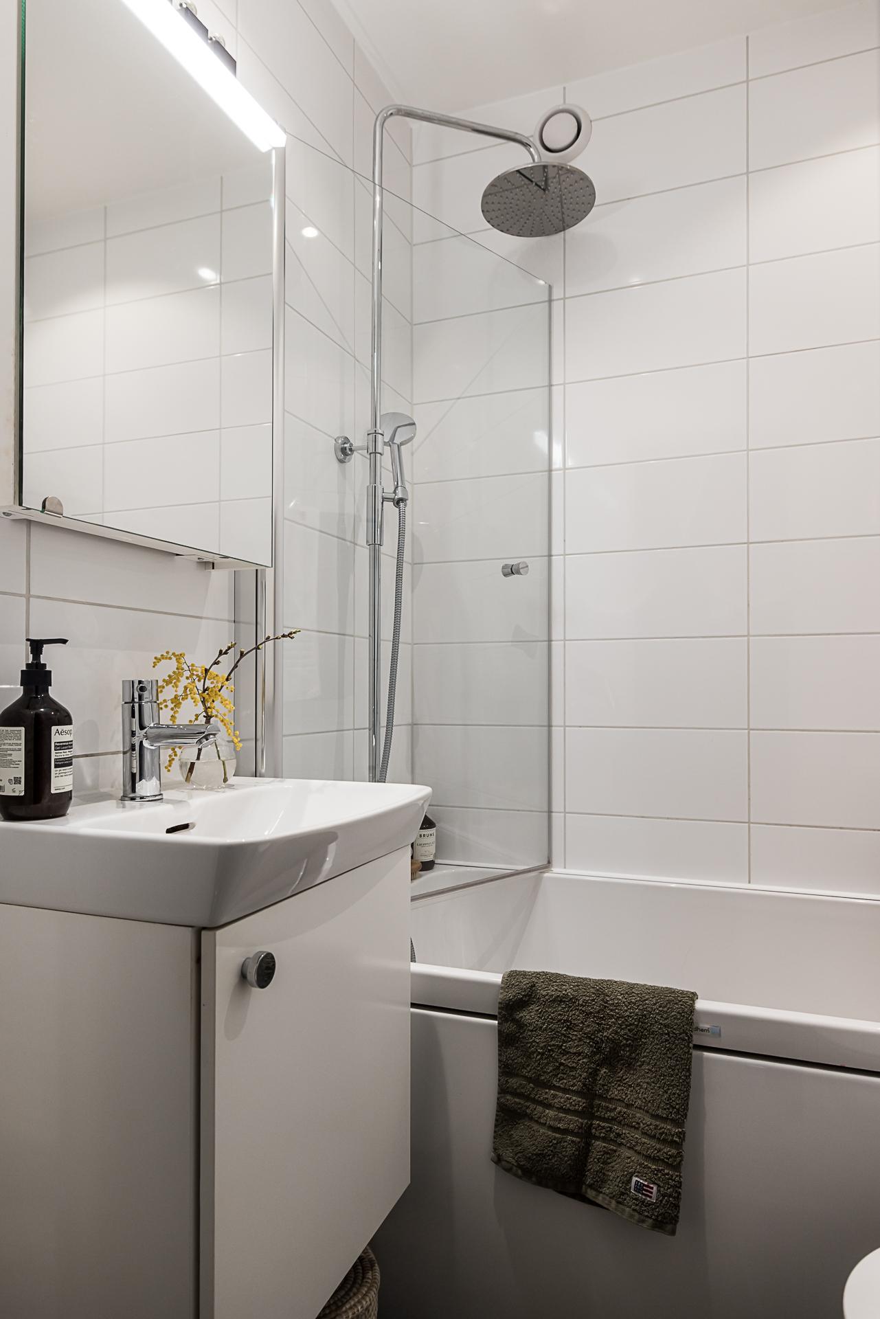 Det här stilrena badrummet renoverades 2020 och erbjuder en modern och harmonisk miljö där varje detalj är noggrant genomtänkt. Väggarna är helkaklade i klassiskt vitt som tillsammans med den grå klinkern på golvet skapar en tidlös och elegant känsla. Den behagliga golvvärmen ger extra komfort och gör badrummet lika skönt under kalla vintermorgnar som efter en lång dag. Här finns ett badkar avskilt med en stilren glasvägg. Den vita kommoden med handfat erbjuder bra förvaring och kompletteras av ett praktiskt spegelskåp ovanför som ger både förvaring och bra ljus vid morgonrutinerna. Mittemot kommoden finns wc-stolen placerad på ett funktionellt och lättillgängligt sätt, vilket skapar ett välplanerat badrum där både estetik och funktion möts.