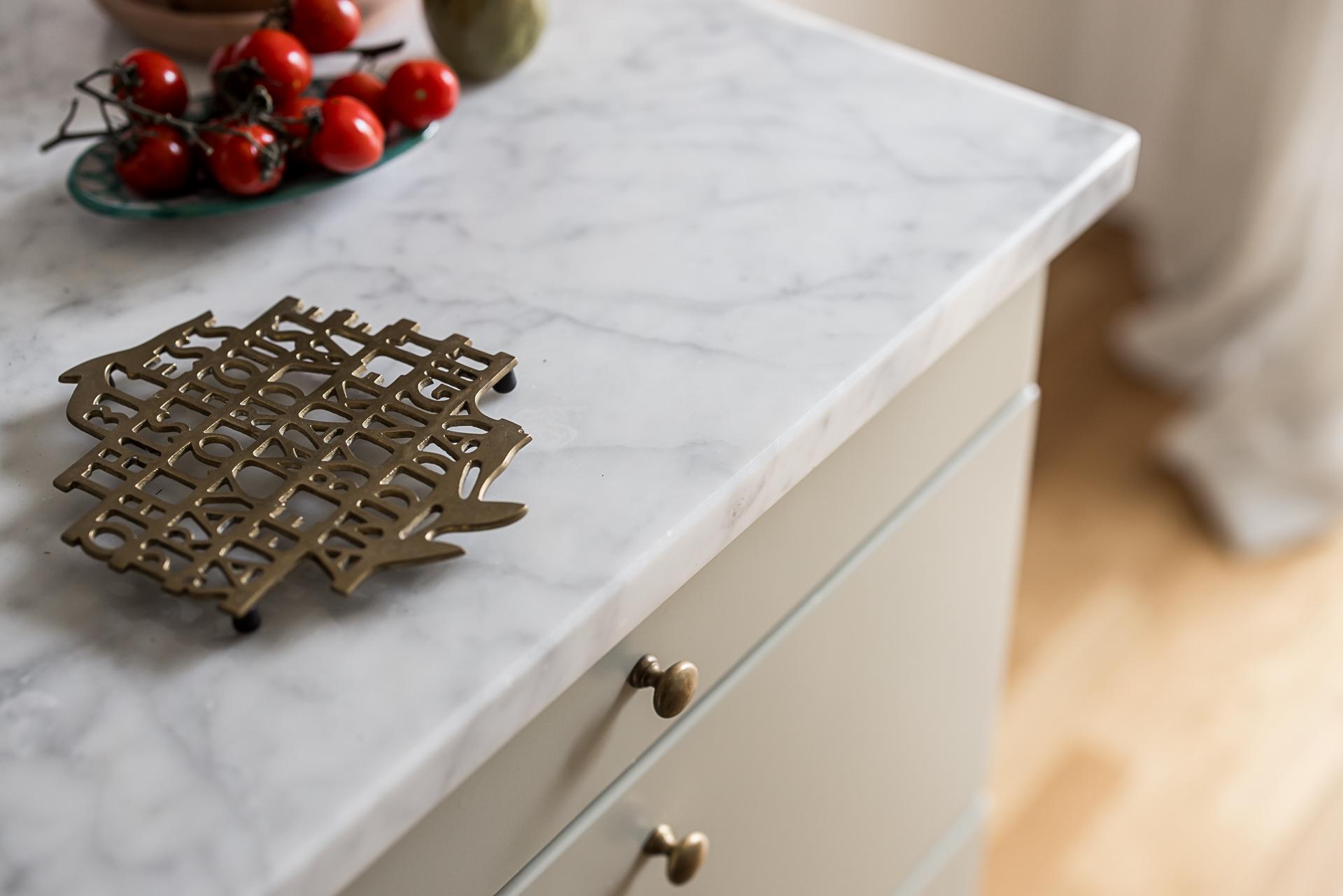 Köket från Puustelli går i lindblomsgrönt och kombineras fint med bänkskivor i kvartskomposit som för tankarna till carraramarmor samt vitt kakel ovanför arbetsbänkarna. Här finns gott om arbetsytor, diskho i rostfritt och integrerad diskmaskin. Förvaringen är generös längs två väggar och köket är utrustat med induktionshäll, ugn, fläkt samt kombinerad kyl/frys. Under 2020 uppdaterades köket med ny spis och diskmaskin. Väggarna är målade i en ljus ton och på golvet ligger en parkett som likt övriga rum slipades 2025. Intill de glasade balkongdörrarna finns plats för ett matbord. Har man större bjudningar äter man med fördel i matsalen.