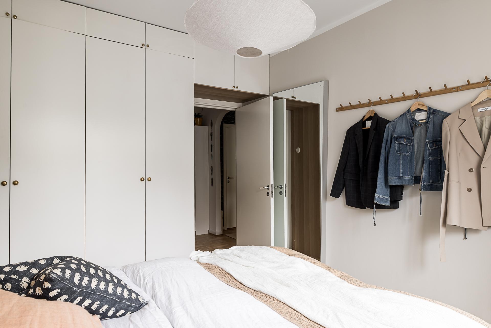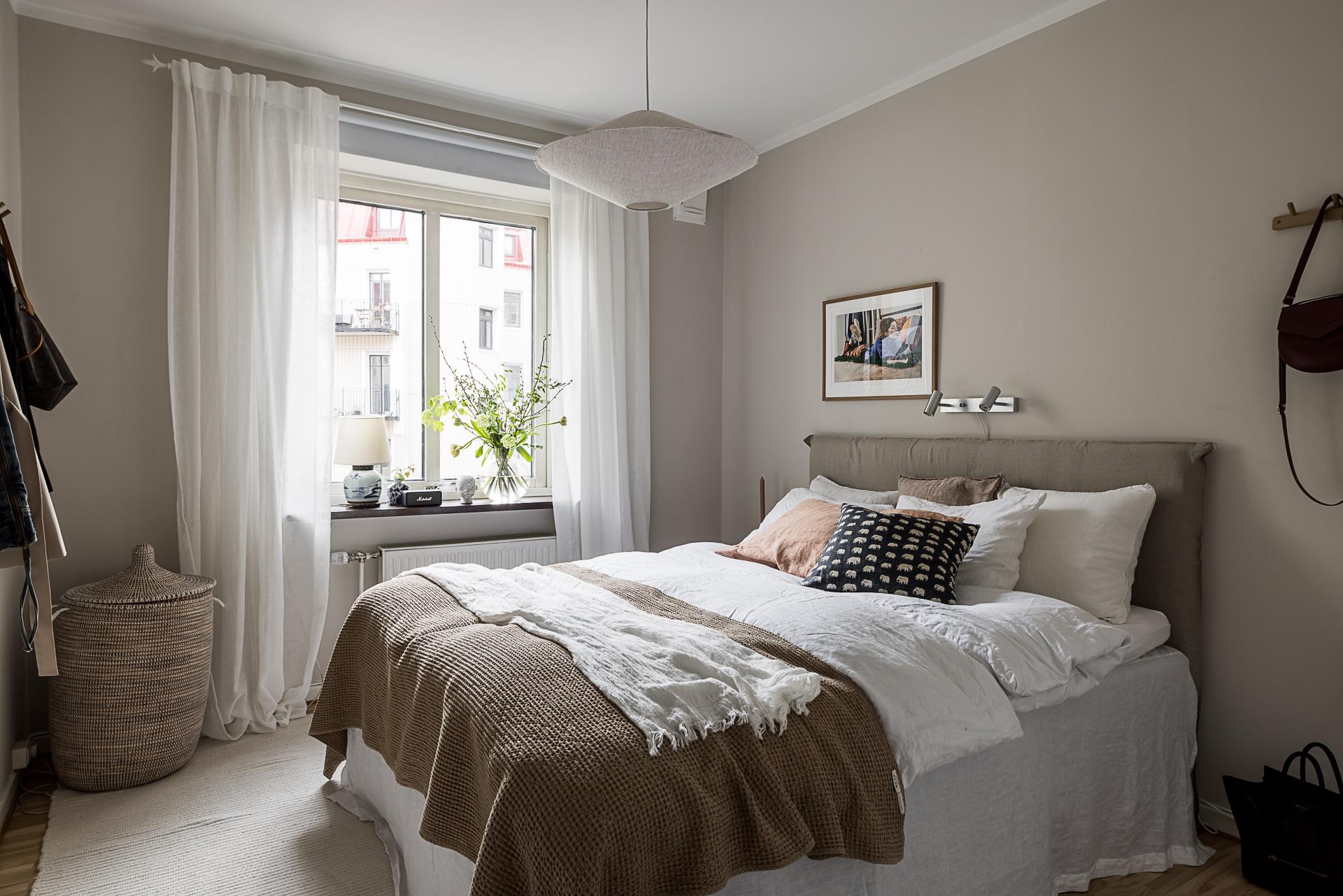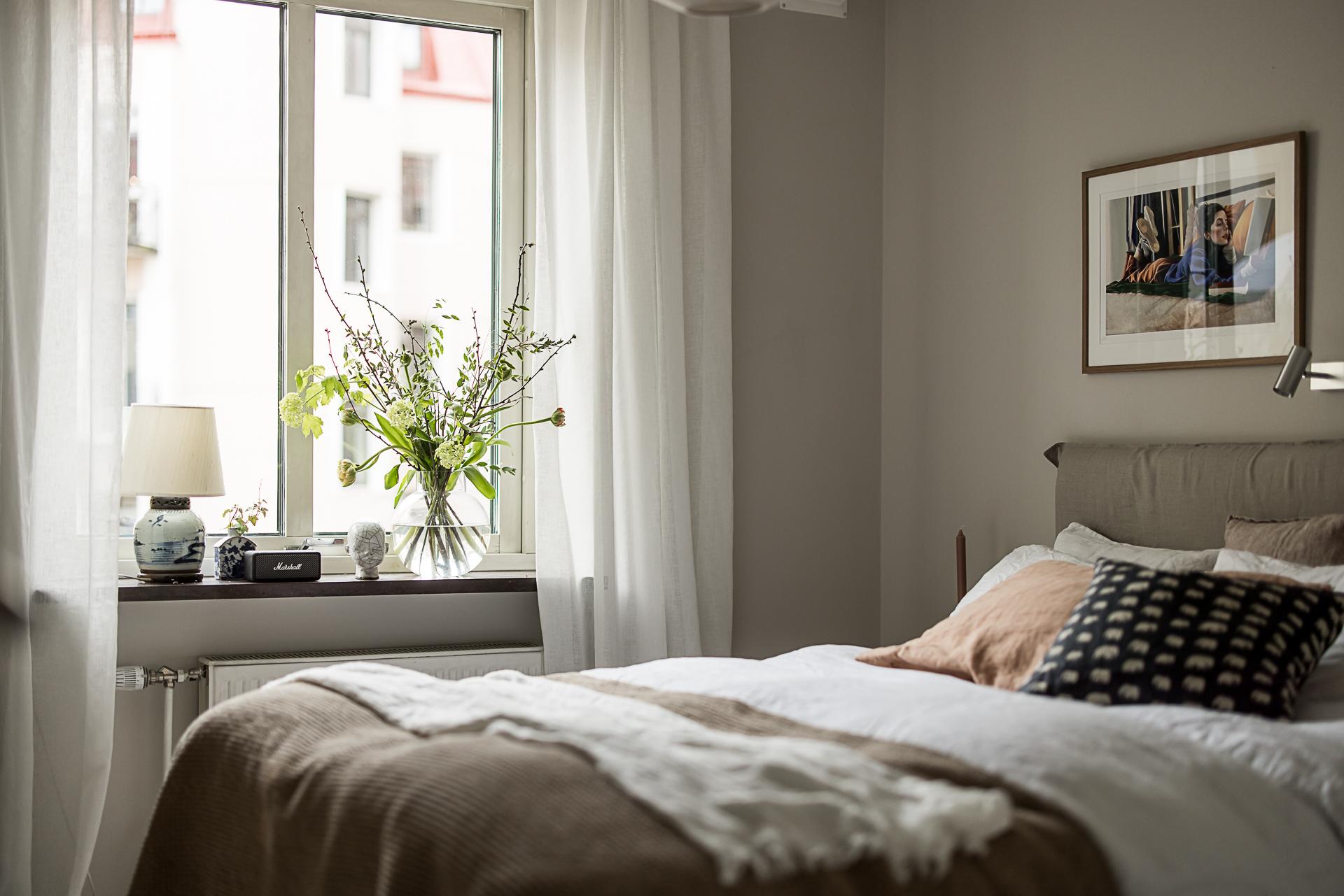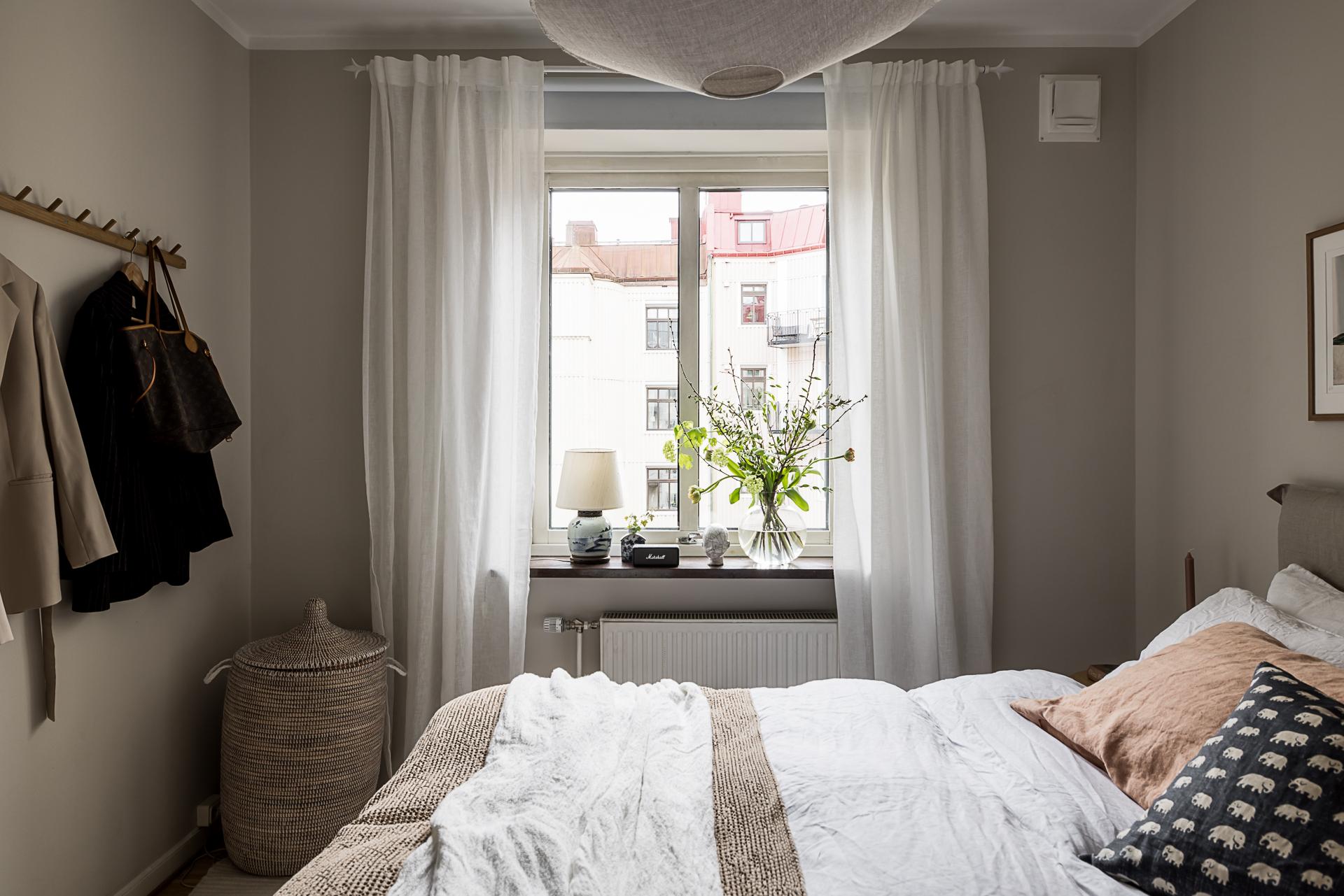 Mot gården ligger det rofyllda sovrummet. Stämningen är vilsam, precis som sig bör i ett sovrum. Läget mot söder gör det ljust och hemtrevligt. Det vackra nyslipade parkettgolvet i original är både skönt att gå på och en fröjd för ögat. Här finns plats för en stor dubbelsäng med tillhörande sängbord och möjlighet till hur mycket förvaring som helst. Idag finns här en länga garderober längs ena väggen. Väggarna är nymålade i en varm beige ton och det höga fönstret med djupa fönsterbrädor av sten ramar fint in grönskan utanför.