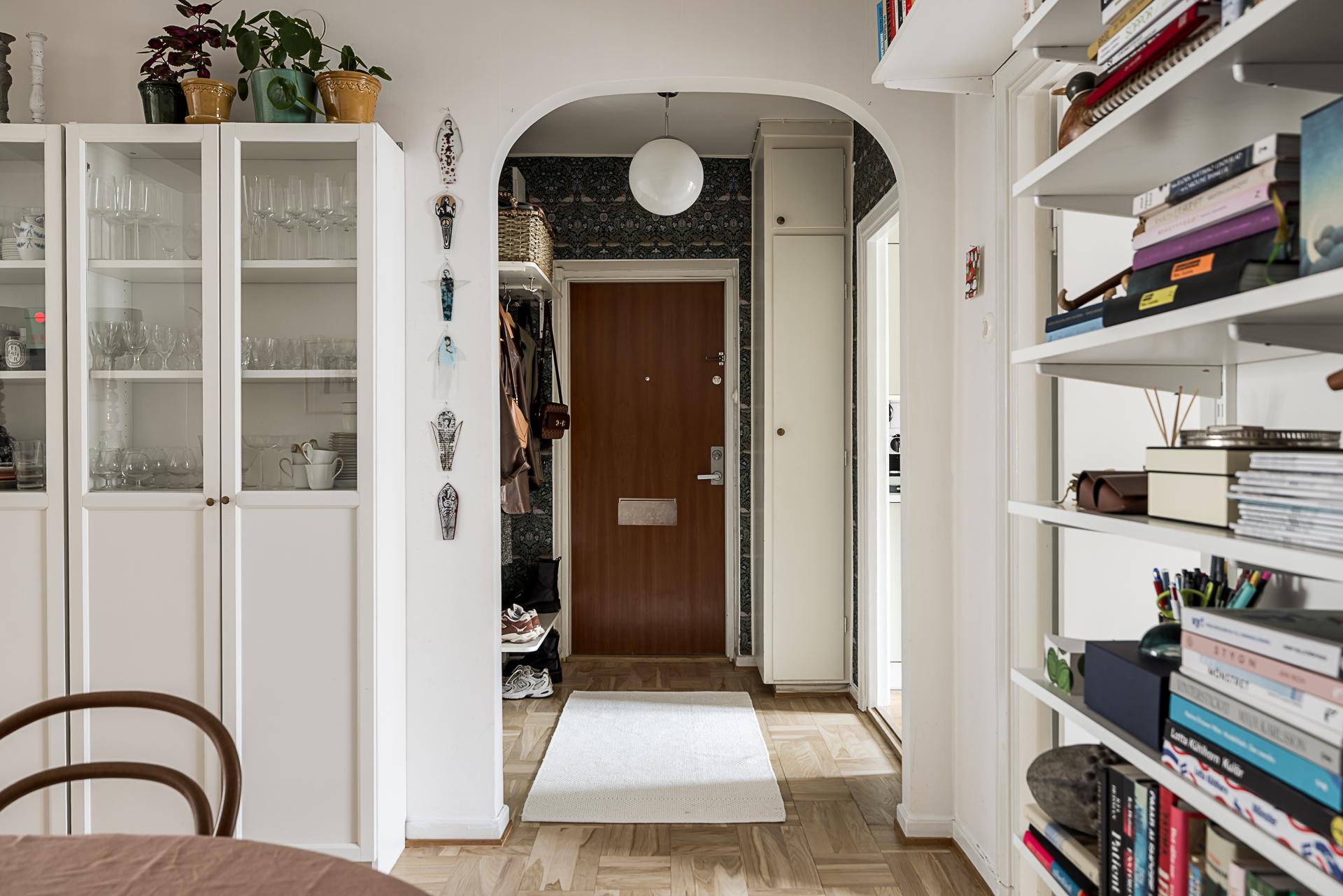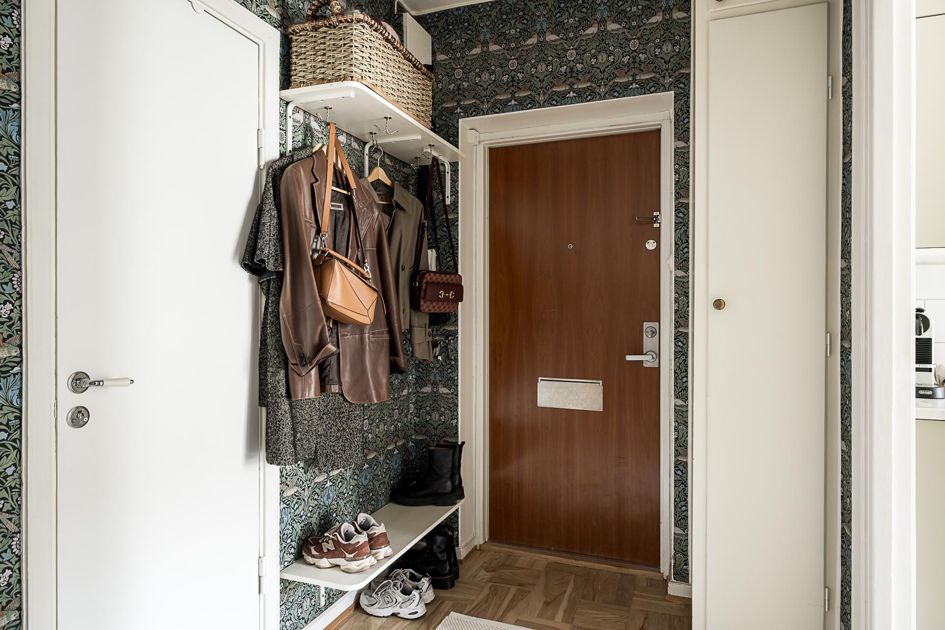 Redan i trapphuset slås man av hur välbehållet huset är. Det är varsamt och tidstypiskt renoverat. När du stiger innanför dörren i lägenheten välkomnas du av en rymlig hall som är tapetserad med tapeten ”Birds” från Midbec Tapeter. Här finns det avhängningsmöjligheter och gott om plats för skor. Den mönstrade tapeten i dov grön framhäver fint ekparketten i original.