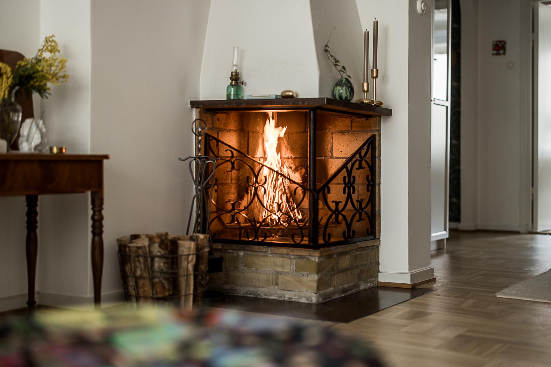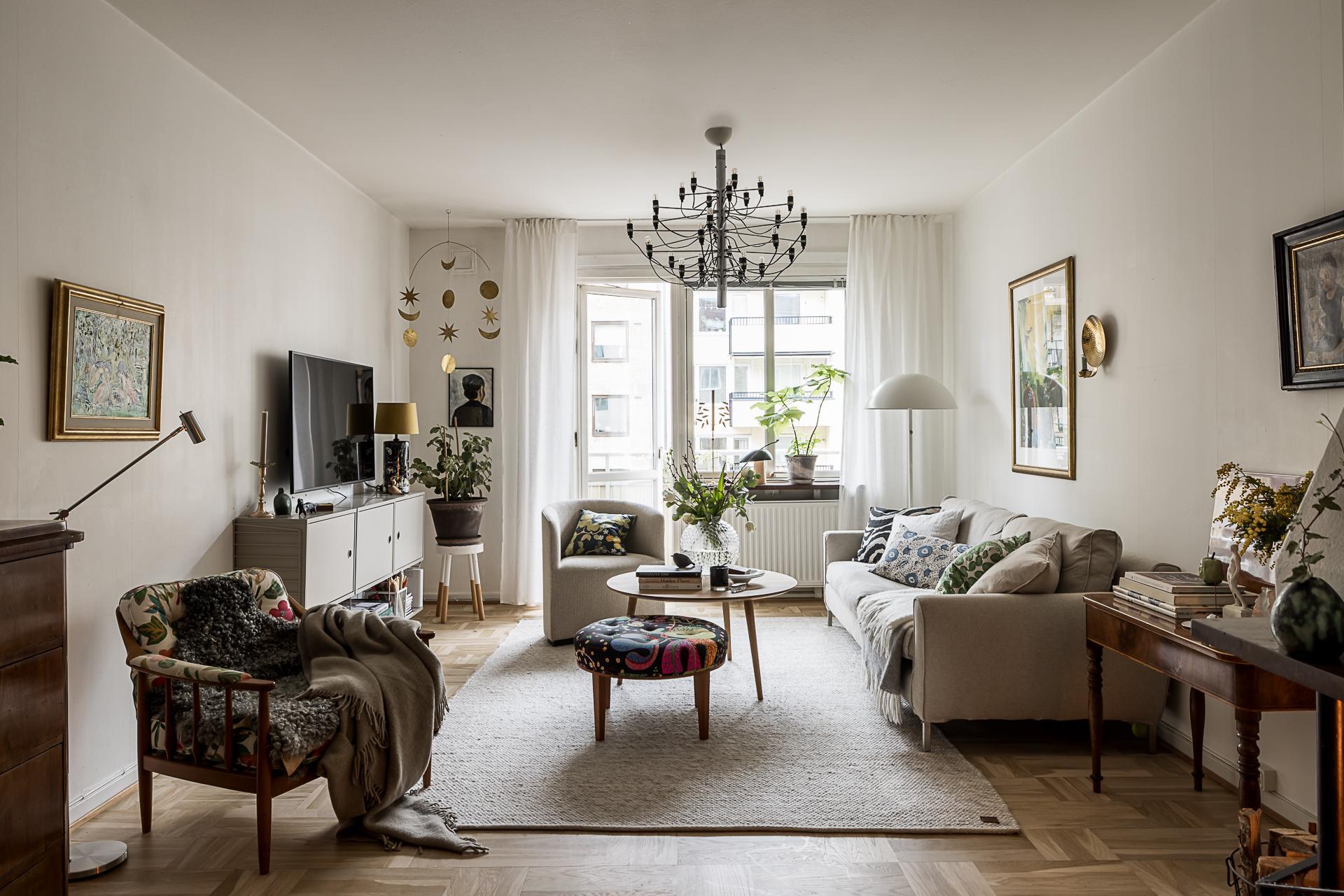 Med fönster mot Nordenskiöldsgatan ligger det luftiga vardagsrummet – ett generöst sällskapsrum med gott om plats för både soffgrupp och större möblering. Det stora fönsterpartiet släpper in rikligt med ljus och skapar en härligt öppen känsla i rummet. Intill fönstret finns en glasad balkongdörr som leder ut till en av lägenhetens två balkonger. Hur många hem kan egentligen skryta med två balkonger? Här möts du av en vy med härlig storstadspuls, där blicken sträcker sig ner mot Linnégatan och vidare upp mot Nordhemsgatan. I rummet finns också en öppen spis i cool funkisstil som är fullt brukbar och blir en naturlig mittpunkt. Väggarna är målade i en mjuk beige ton och flera tidstypiska detaljer har bevarats, såsom djupa fönsternischer med vackra stenskivor och parkettgolv i ek. Tillsammans ger det rummet både karaktär och en varm, inbjudande atmosfär.