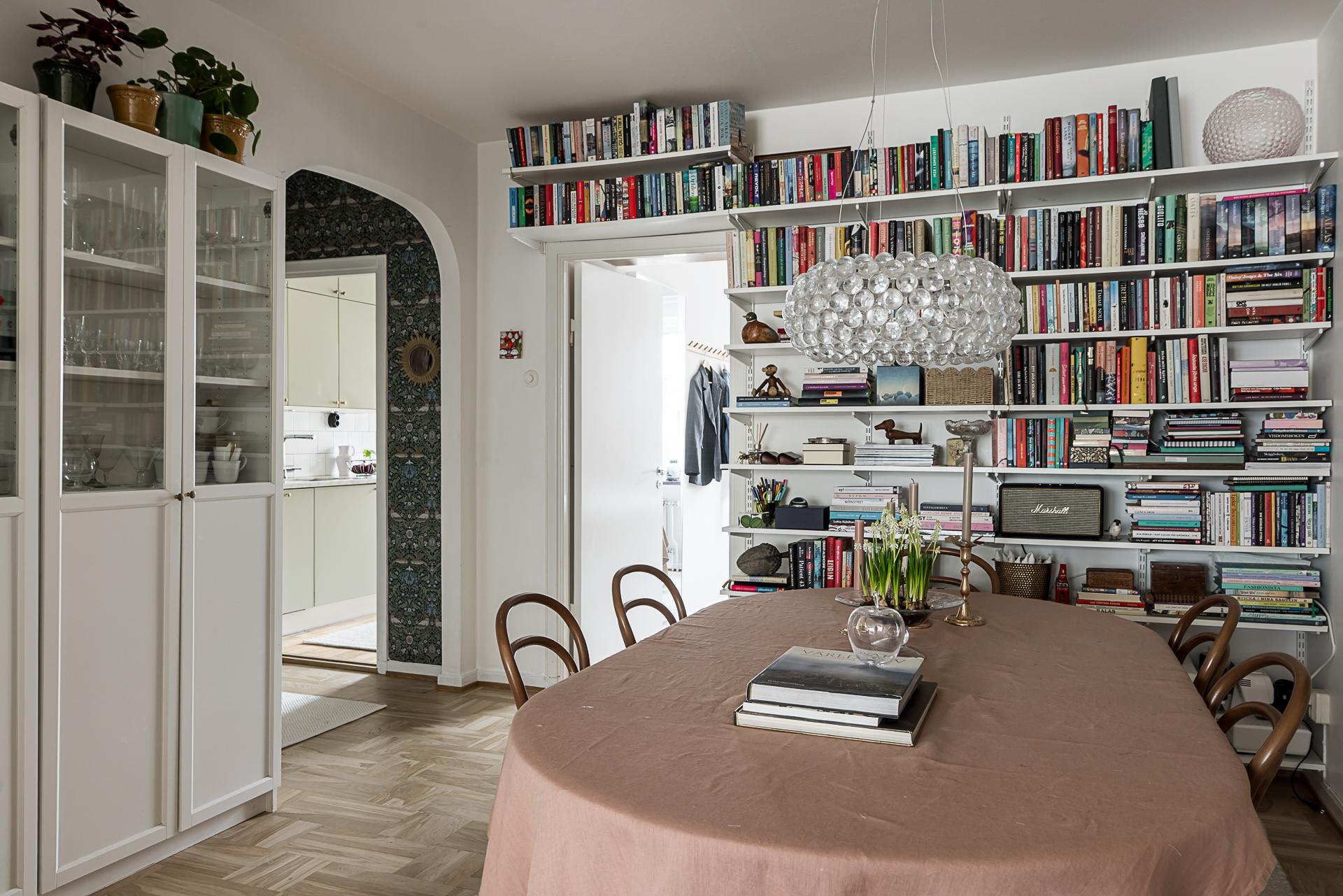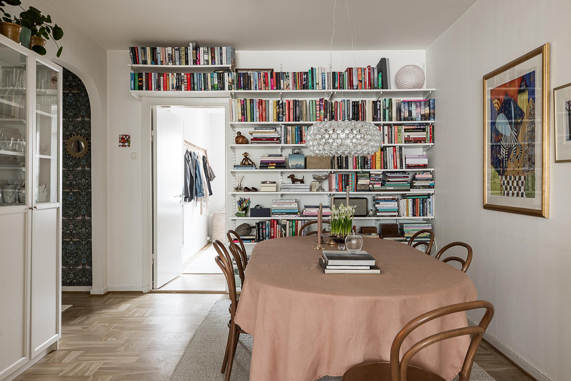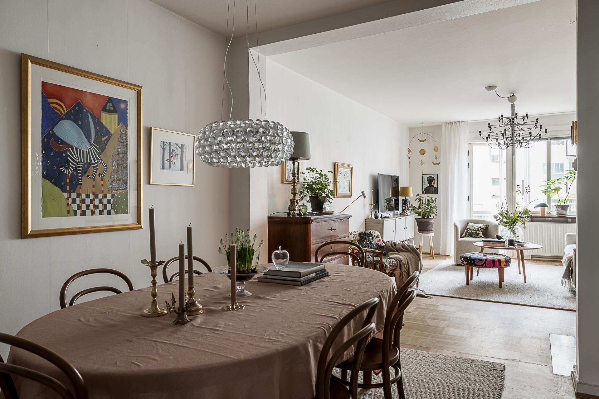 Mitt i bostaden finner du detta nav som idag fungerar som matsal. Här finns plats för många gäster. Även gott om plats för bokhyllor eller förvaring och vackra stilleben längs med väggarna. Golvet pryds av samma fina originalparkett som i hallen. Samtliga golv slipades 2025.