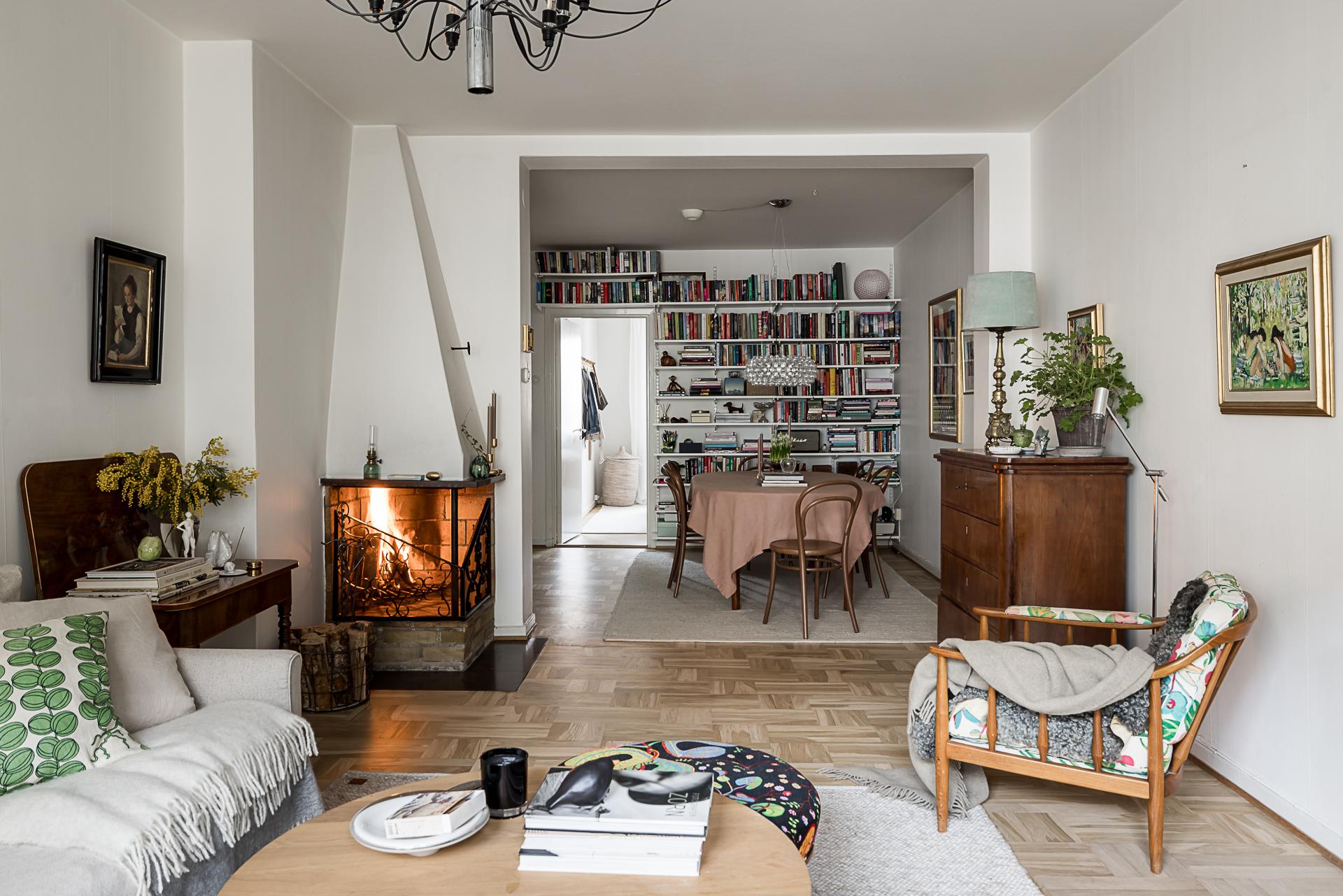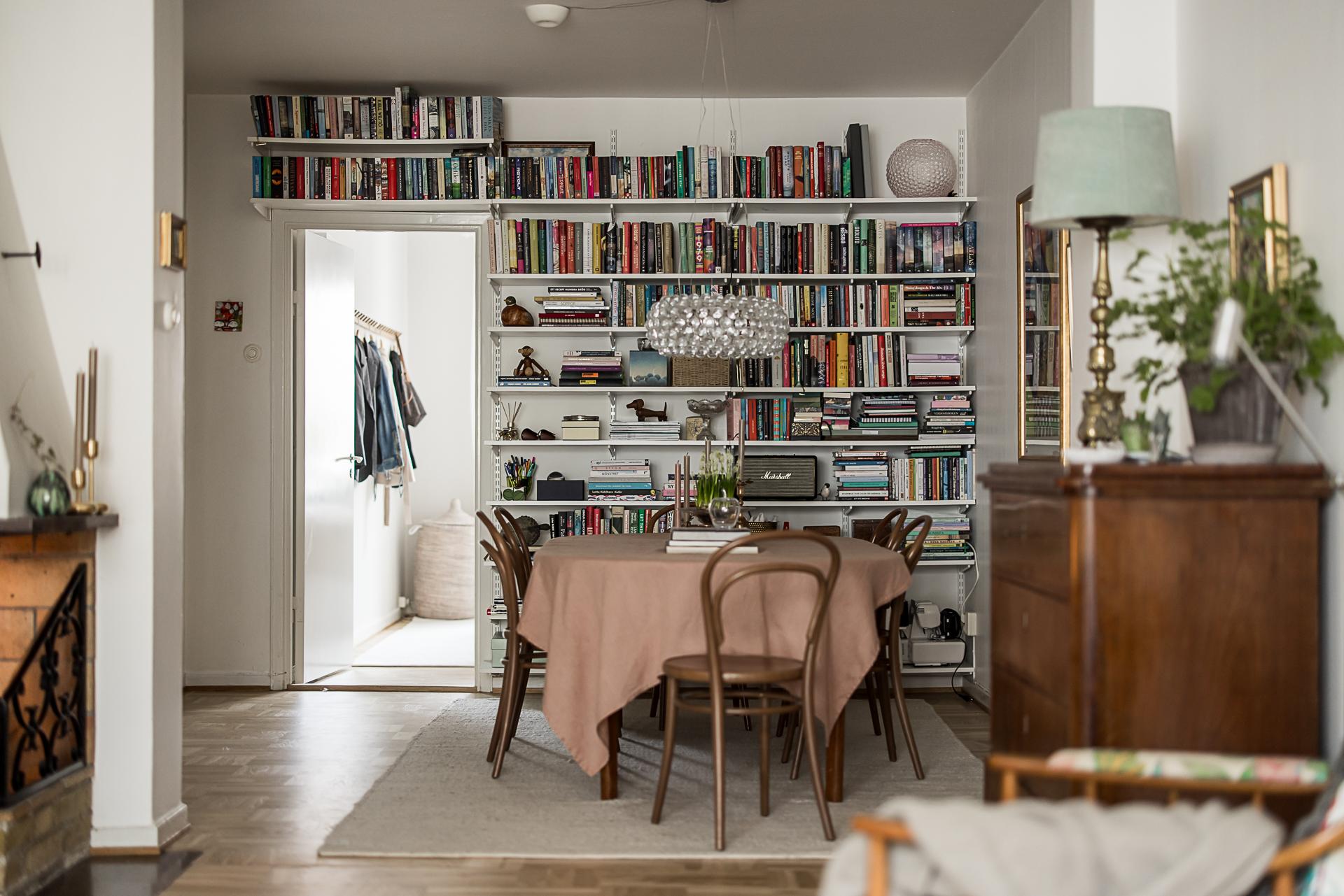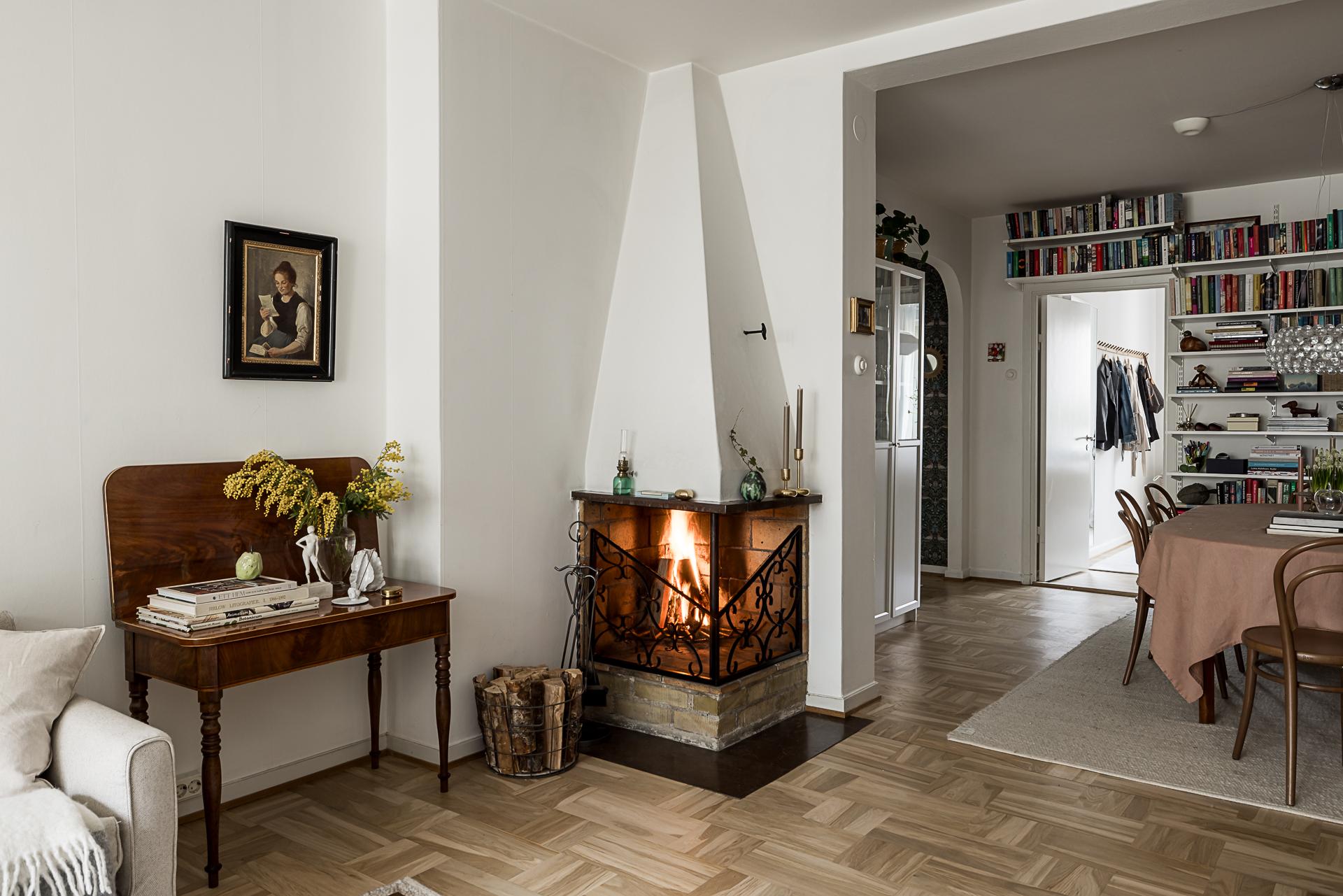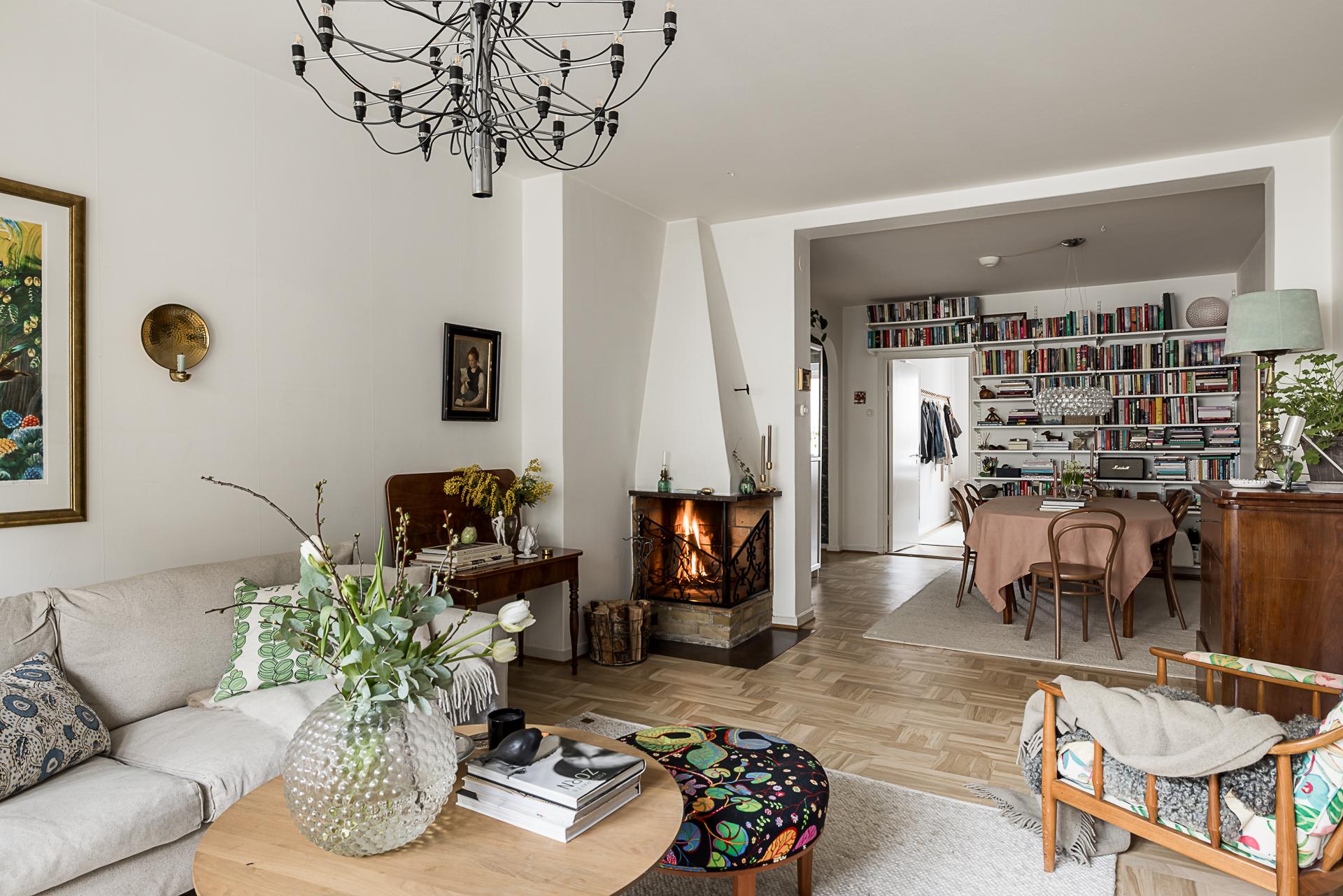 Mitt i bostaden finner du detta nav som idag fungerar som matsal. Här finns plats för många gäster. Även gott om plats för bokhyllor eller förvaring och vackra stilleben längs med väggarna. Golvet pryds av samma fina originalparkett som i hallen. Samtliga golv slipades 2025.