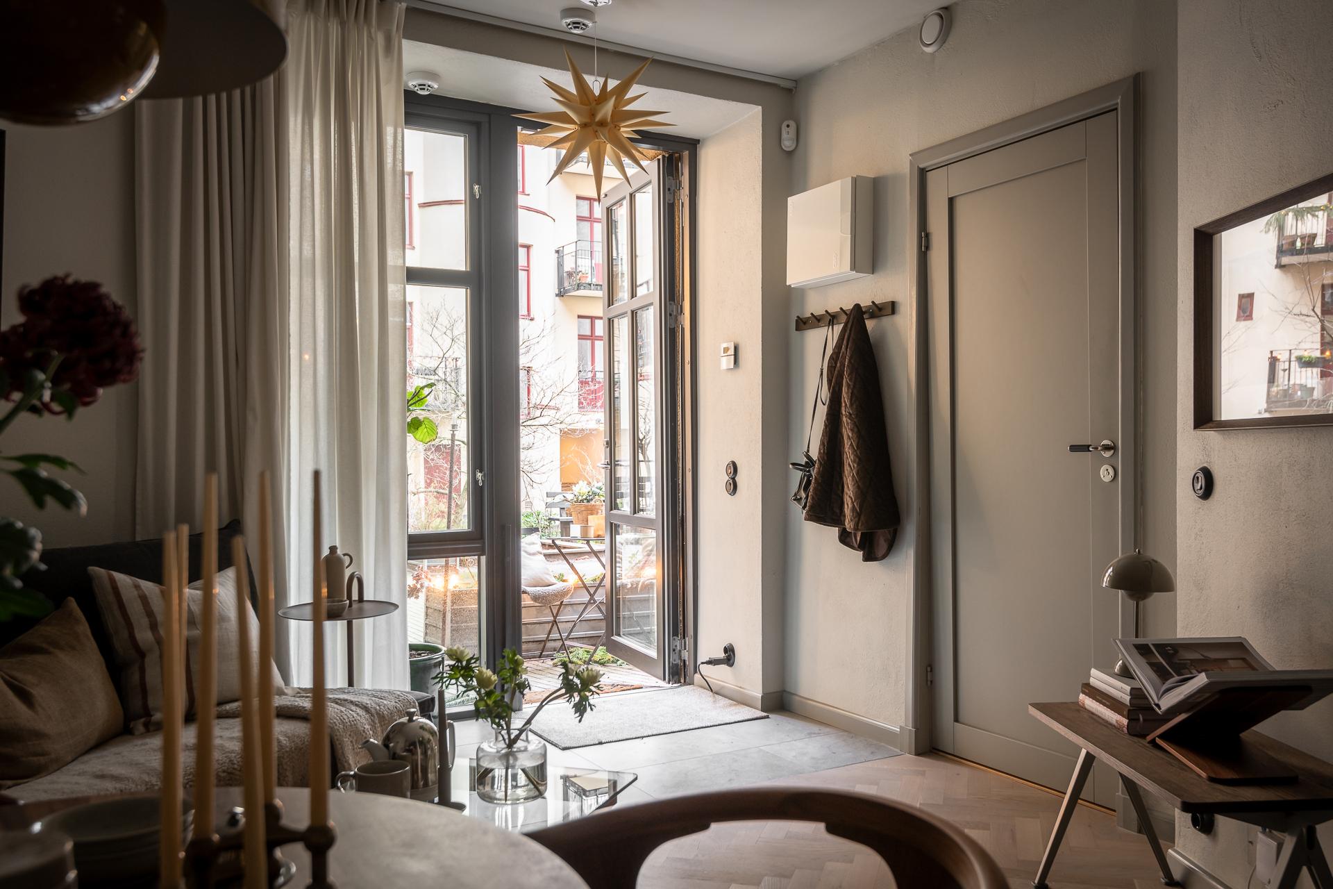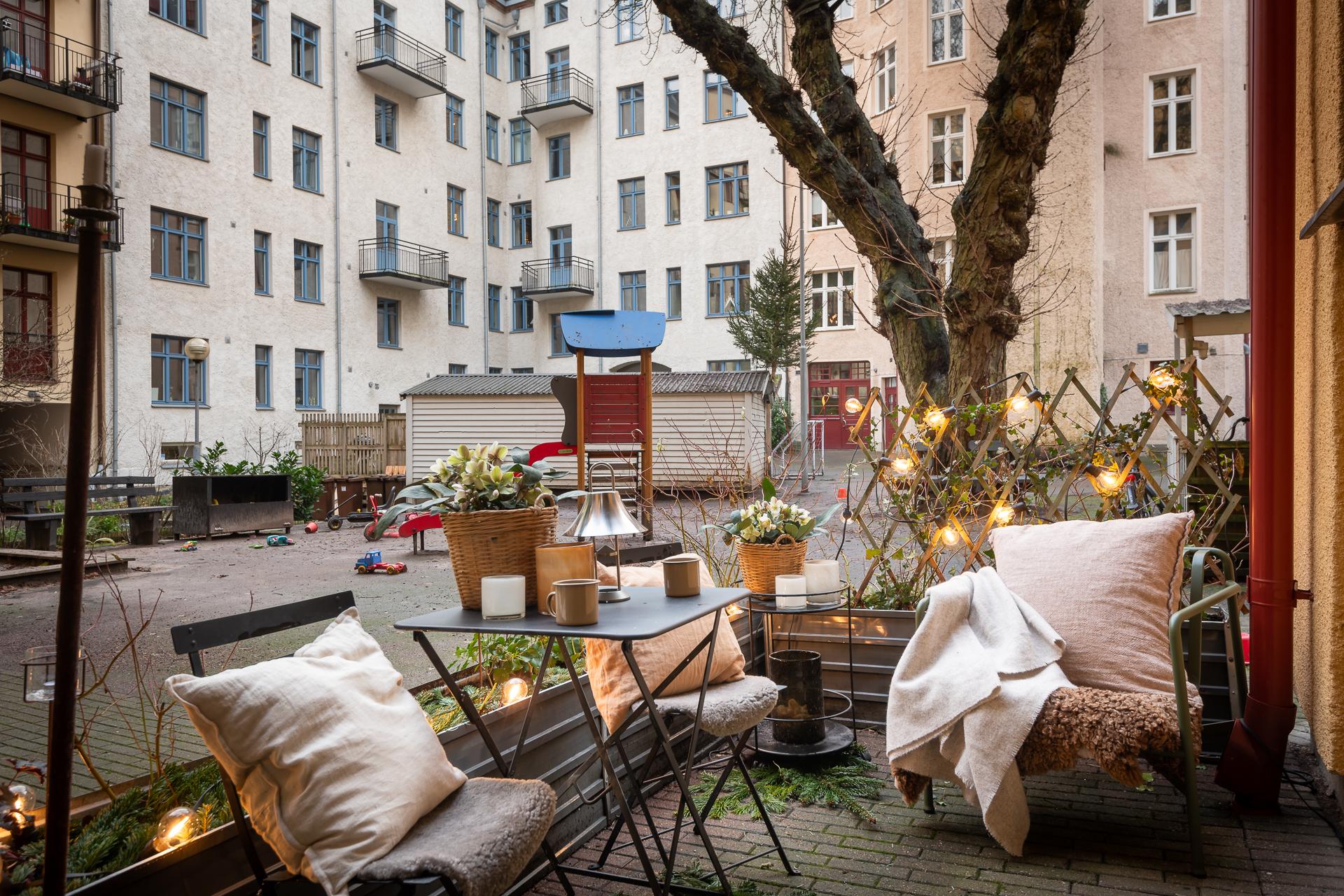 Lugnet på gården är slående och att ha direkt ingång från gården med uteplats ger en känsla av town house. Precis intill ståtar ett av Linnéstadens äldsta kastanjeträd med sin grönska. Välkommen in!