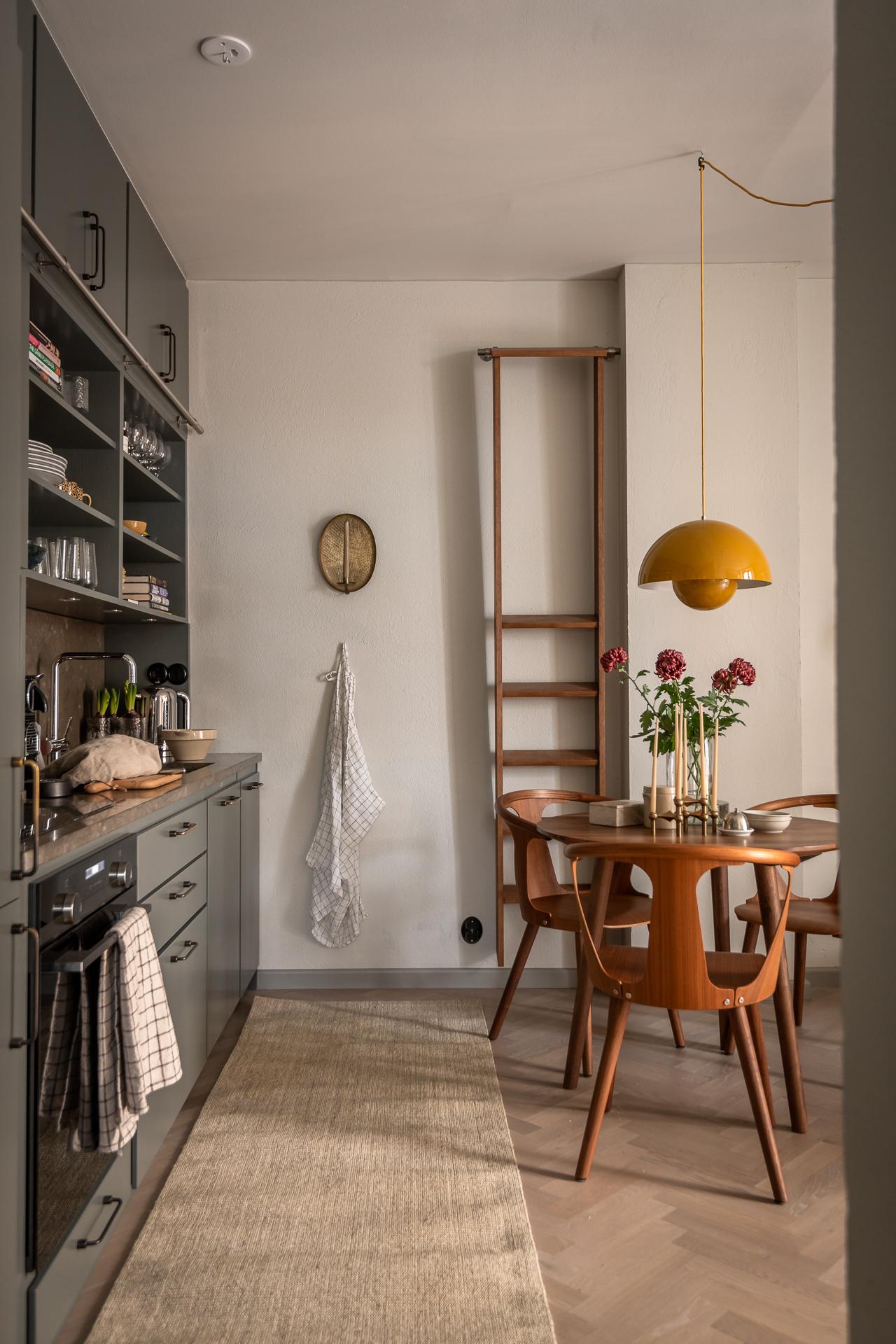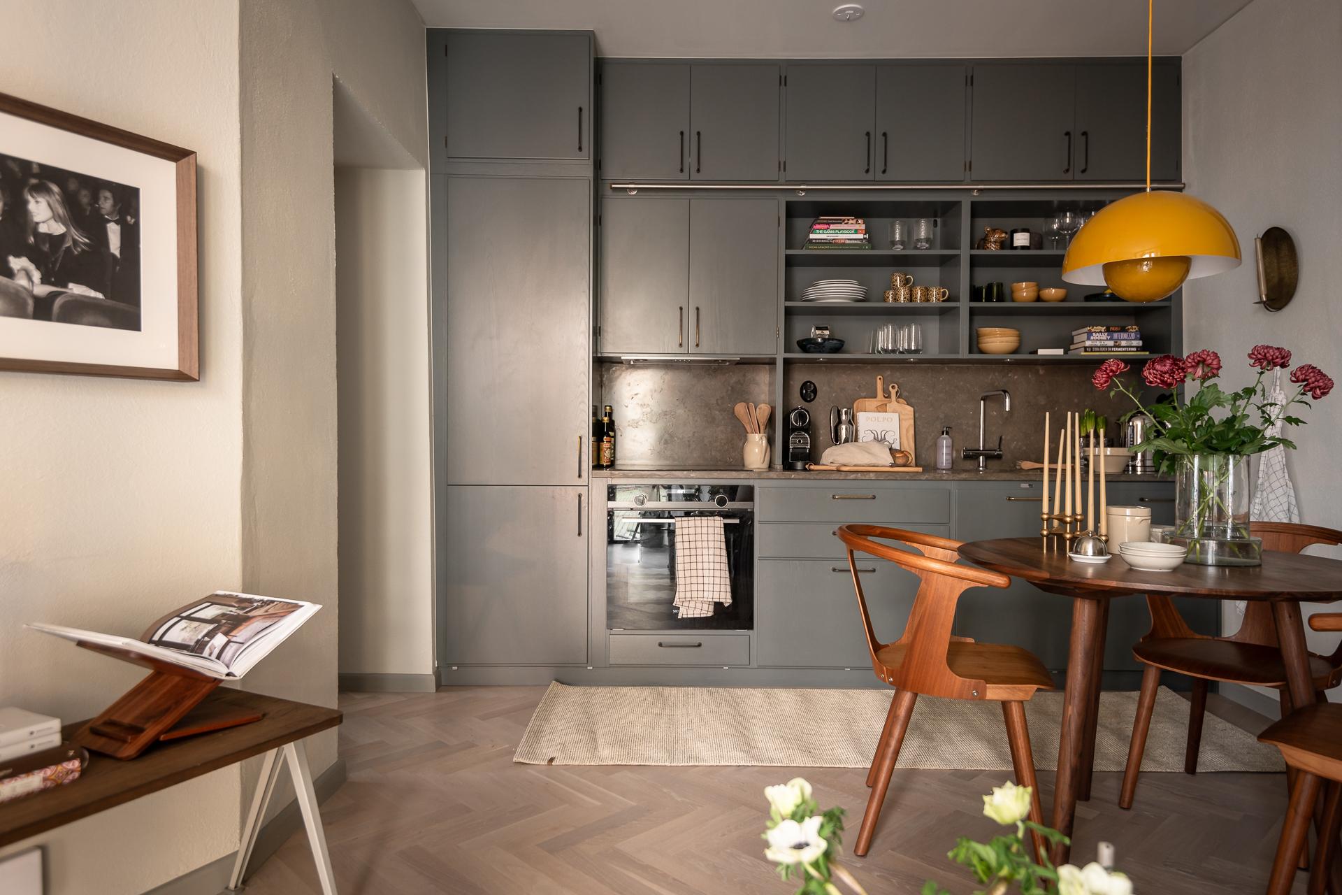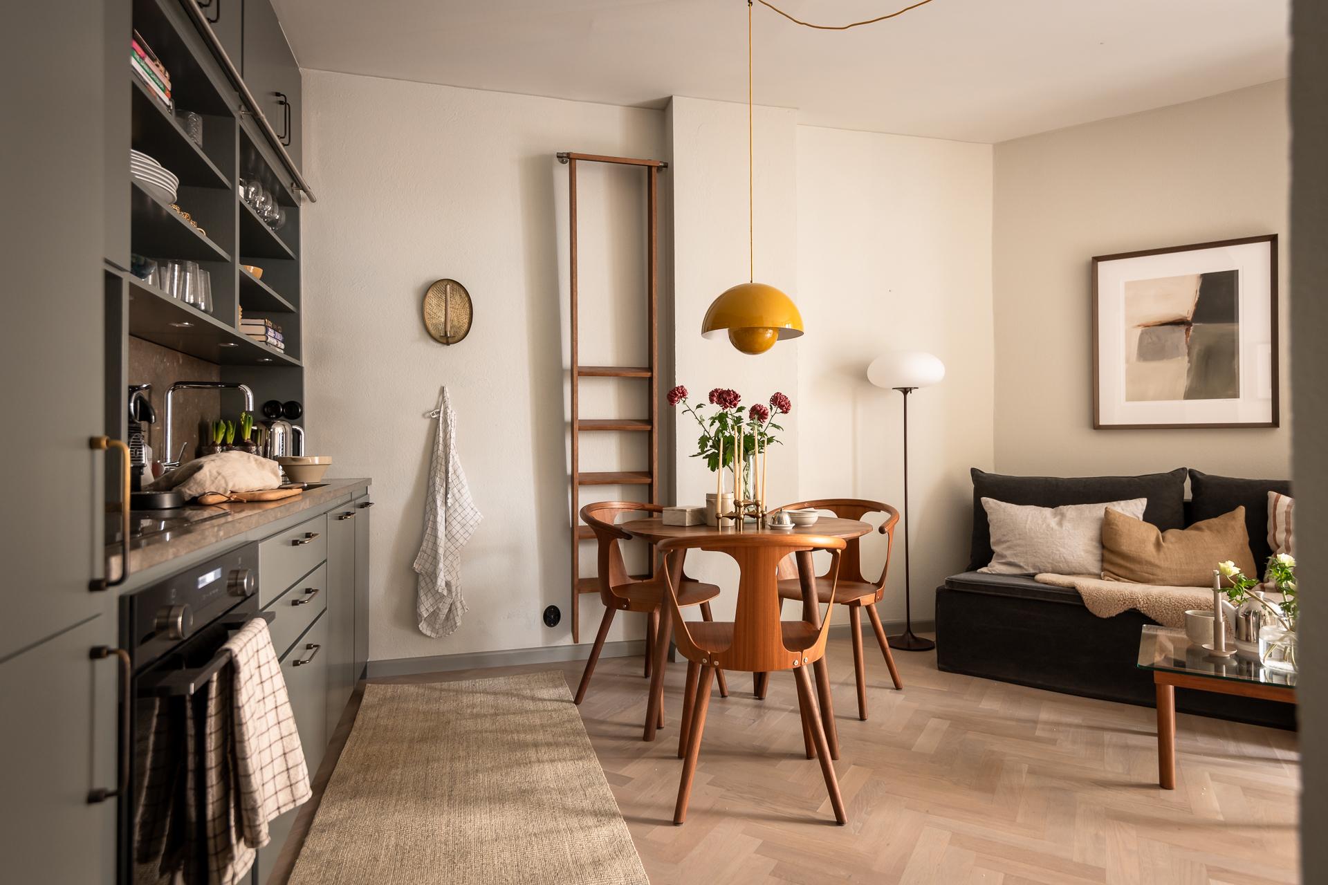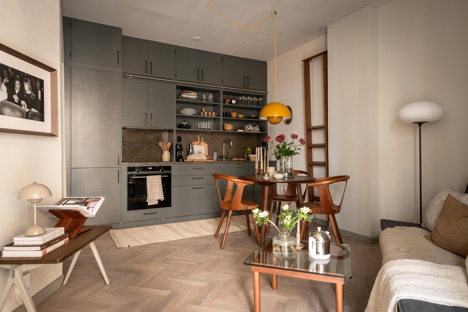På golvet innanför dörren ligger en kalkstensliknande klinker från välrenommerade Bricmate. Resten av lägenheten har ett ekparkettgolv i klassisk fiskbensläggning. I det kombinerade vardagsrummet och köket ryms allt som kan önskas. Det vackra köket är som ett smycke i sig, tidlöst och helt anpassat för just detta hem. För att smidigt nå överskåpen plockar du fram din stege i massiv ek. Bara en sådan sak! Bänkar och stänkskydd är i kalksten. Diskmaskin, kyl och frys är snyggt integrerade i köksinredningen. Matplatsen rymmer 2-4 personer perfekt. Soffa och soffbord ryms också fint.