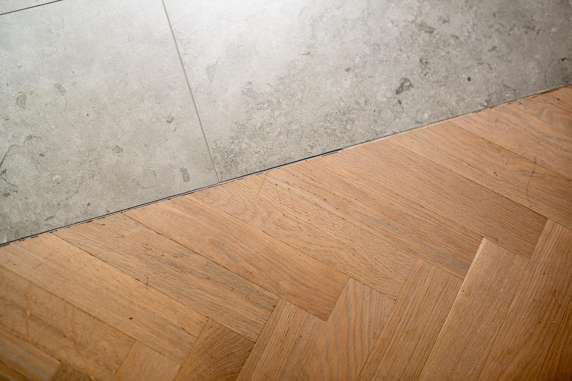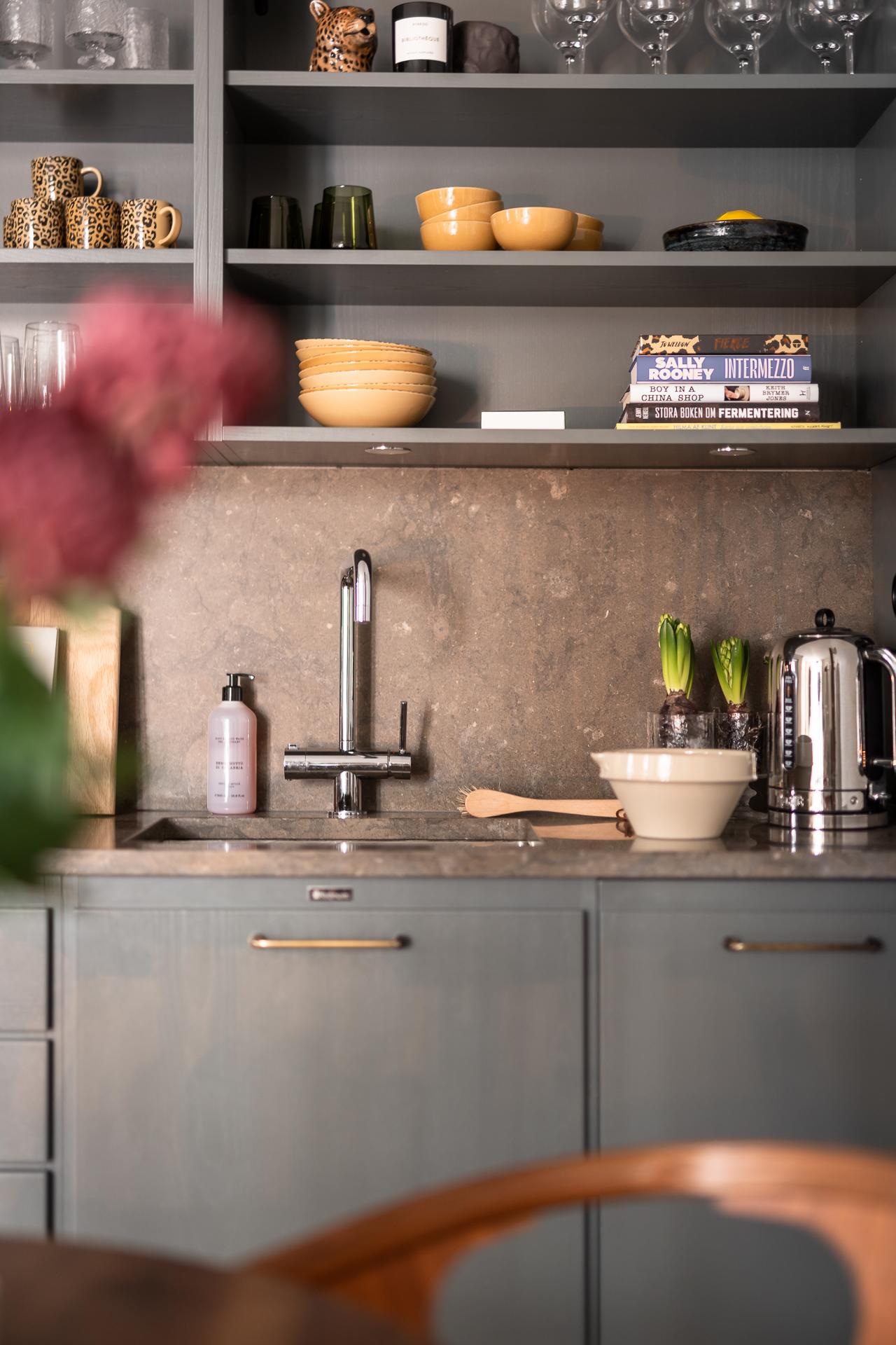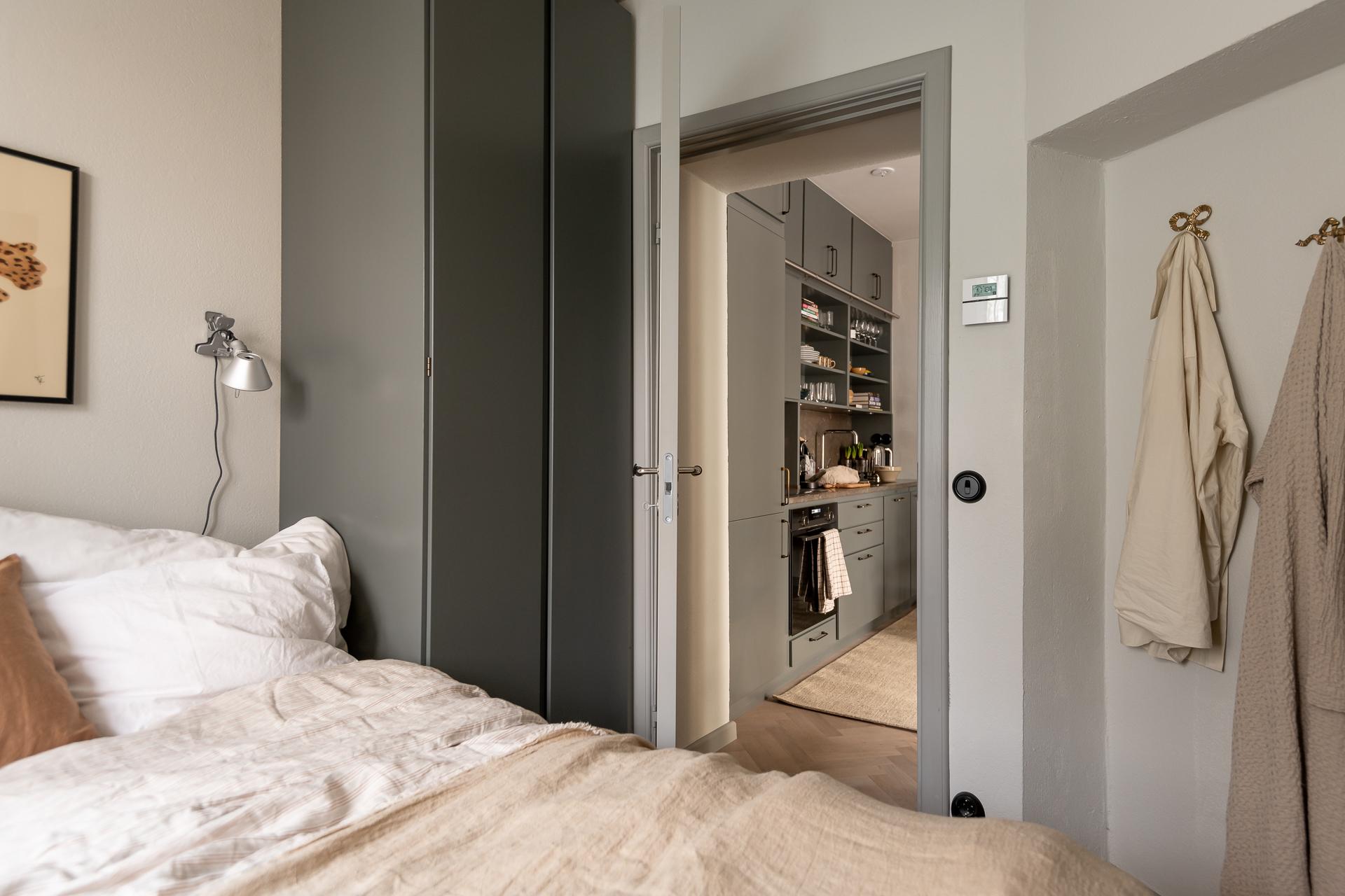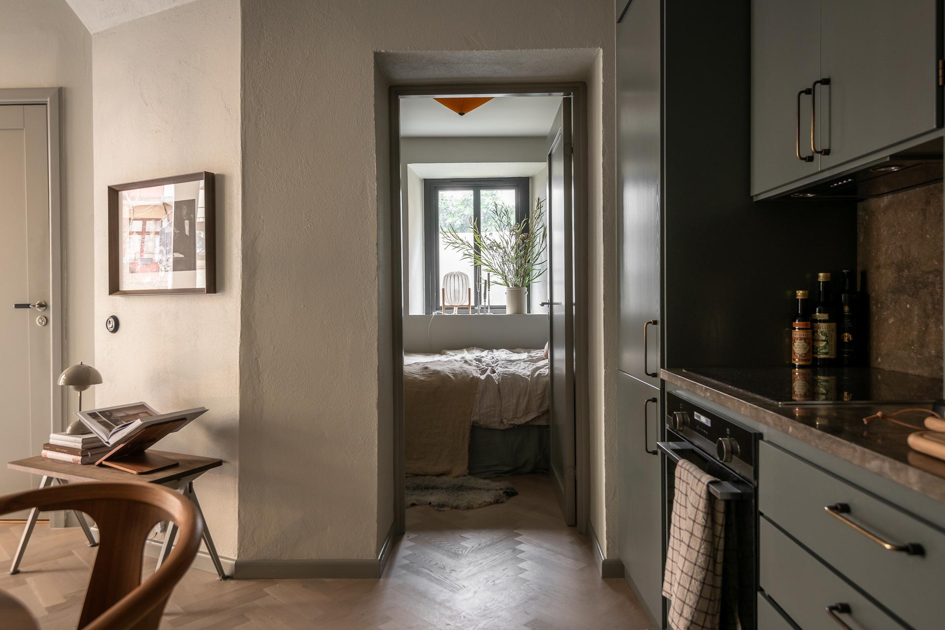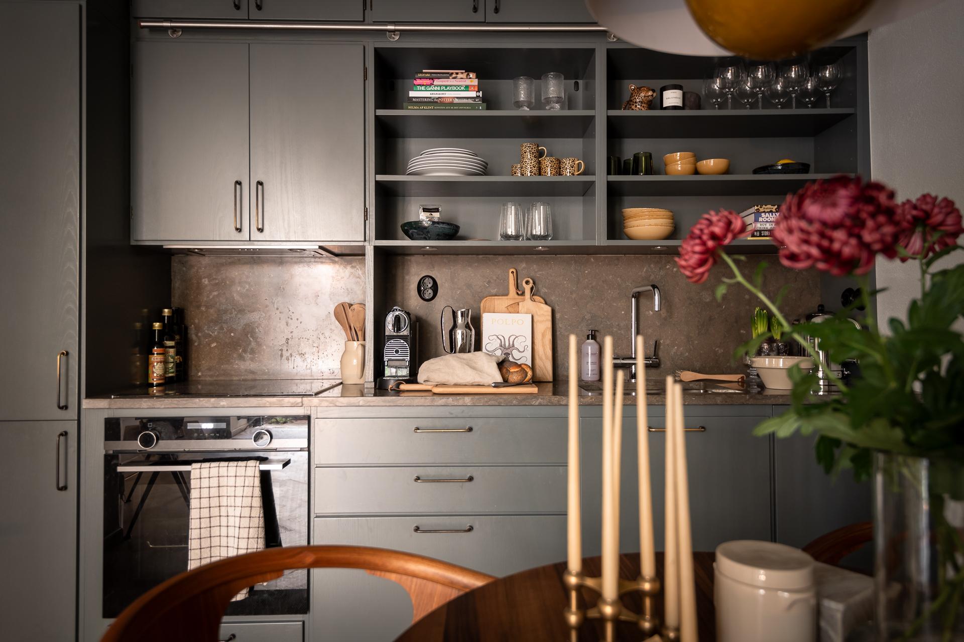På golvet innanför dörren ligger en kalkstensliknande klinker från välrenommerade Bricmate. Resten av lägenheten har ett ekparkettgolv i klassisk fiskbensläggning. I det kombinerade vardagsrummet och köket ryms allt som kan önskas. Det vackra köket är som ett smycke i sig, tidlöst och helt anpassat för just detta hem. För att smidigt nå överskåpen plockar du fram din stege i massiv ek. Bara en sådan sak! Bänkar och stänkskydd är i kalksten. Diskmaskin, kyl och frys är snyggt integrerade i köksinredningen. Matplatsen rymmer 2-4 personer perfekt. Soffa och soffbord ryms också fint.