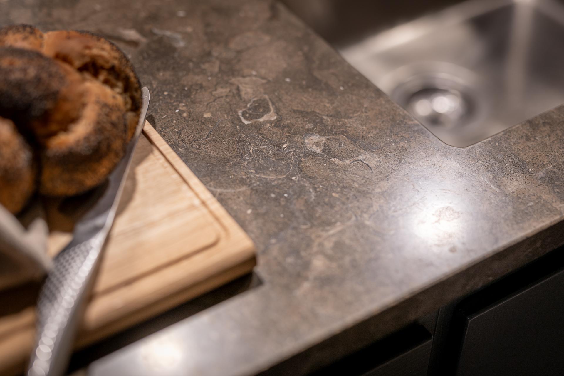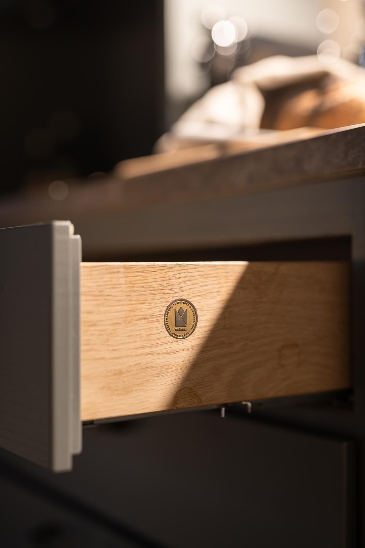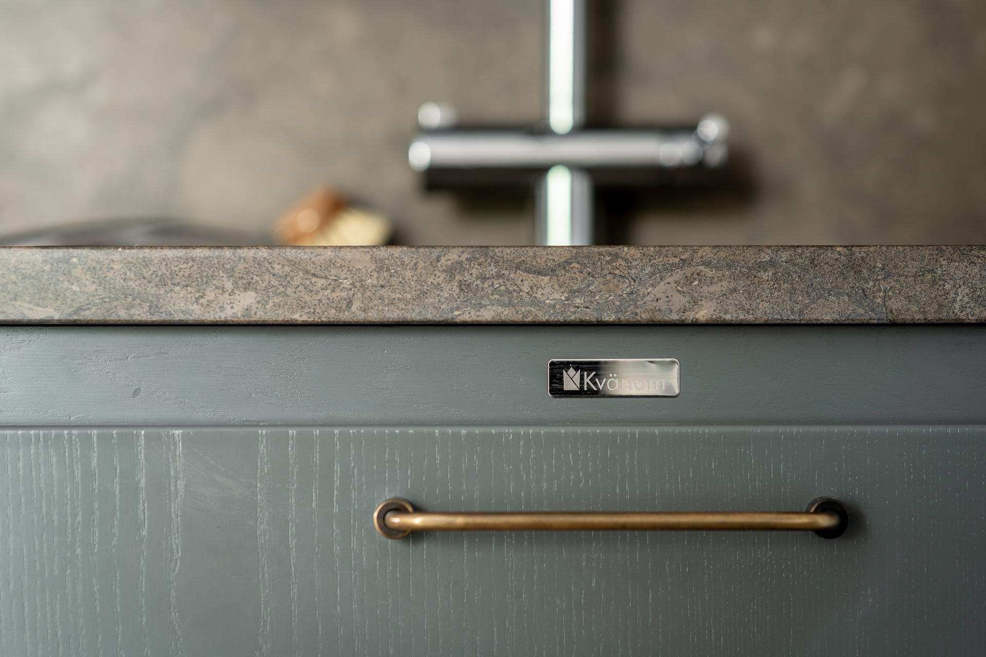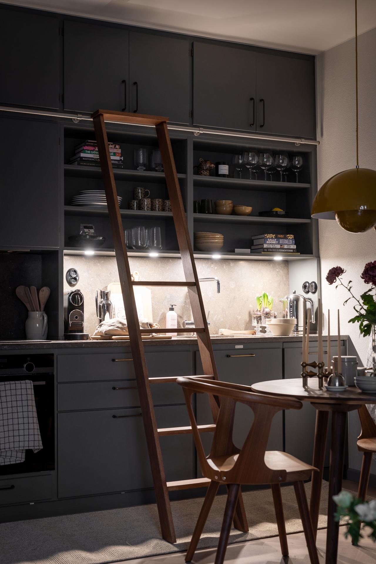 På golvet innanför dörren ligger en kalkstensliknande klinker från välrenommerade Bricmate. Resten av lägenheten har ett ekparkettgolv i klassisk fiskbensläggning. I det kombinerade vardagsrummet och köket ryms allt som kan önskas. Det vackra köket är som ett smycke i sig, tidlöst och helt anpassat för just detta hem. För att smidigt nå överskåpen plockar du fram din stege i massiv ek. Bara en sådan sak! Bänkar och stänkskydd är i kalksten. Diskmaskin, kyl och frys är snyggt integrerade i köksinredningen. Matplatsen rymmer 2-4 personer perfekt. Soffa och soffbord ryms också fint.