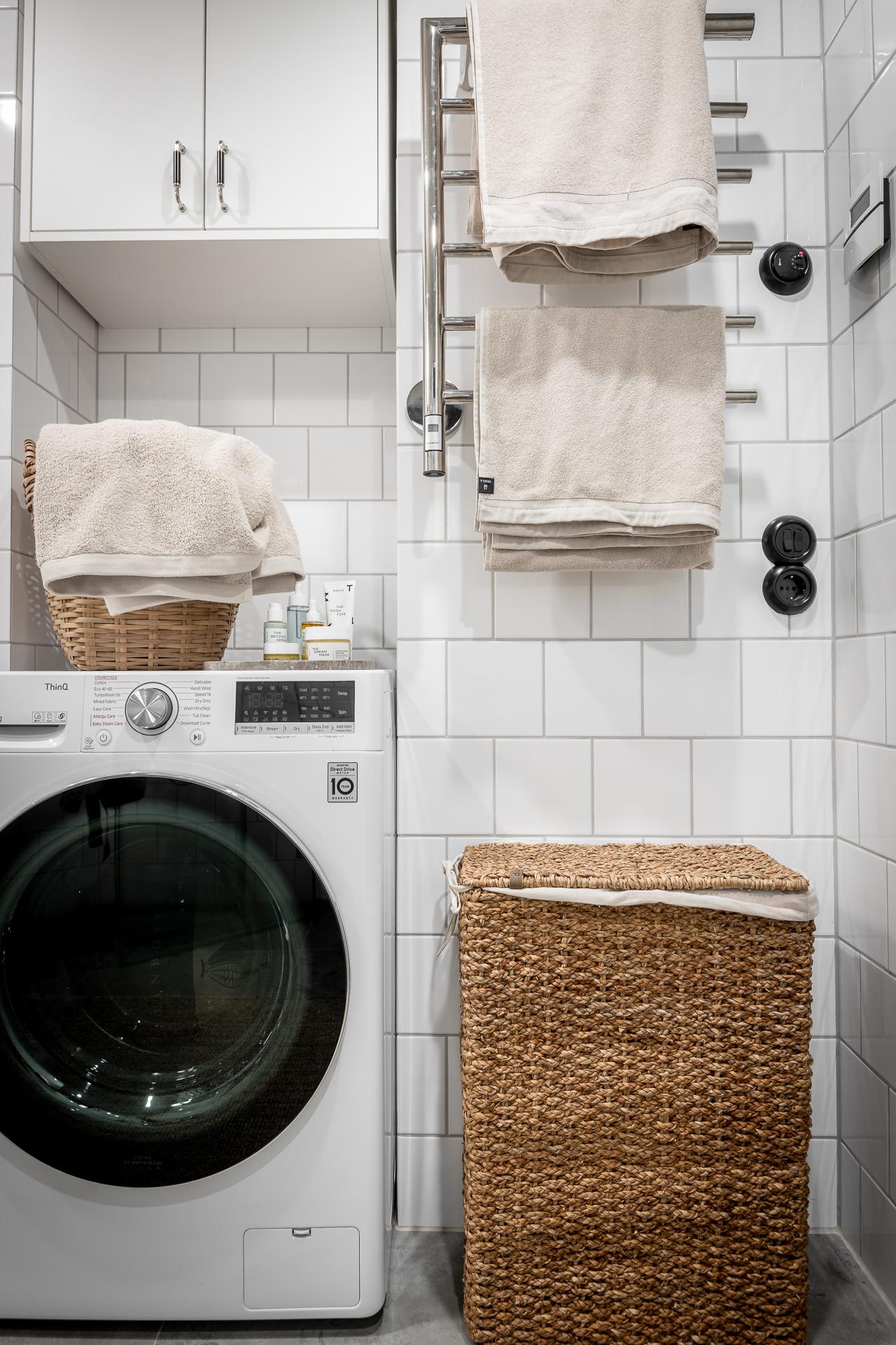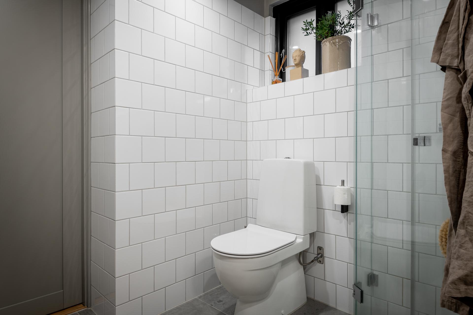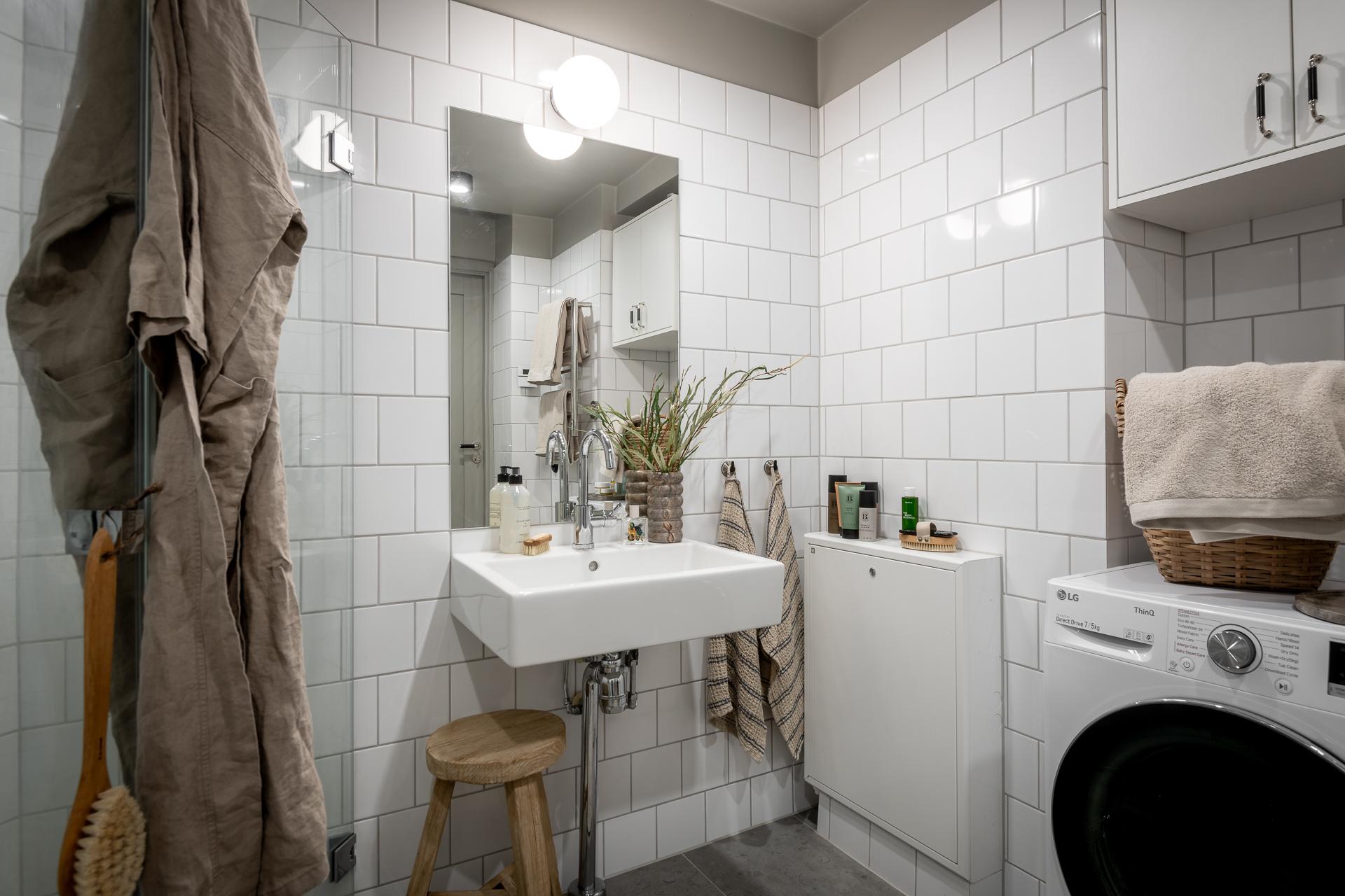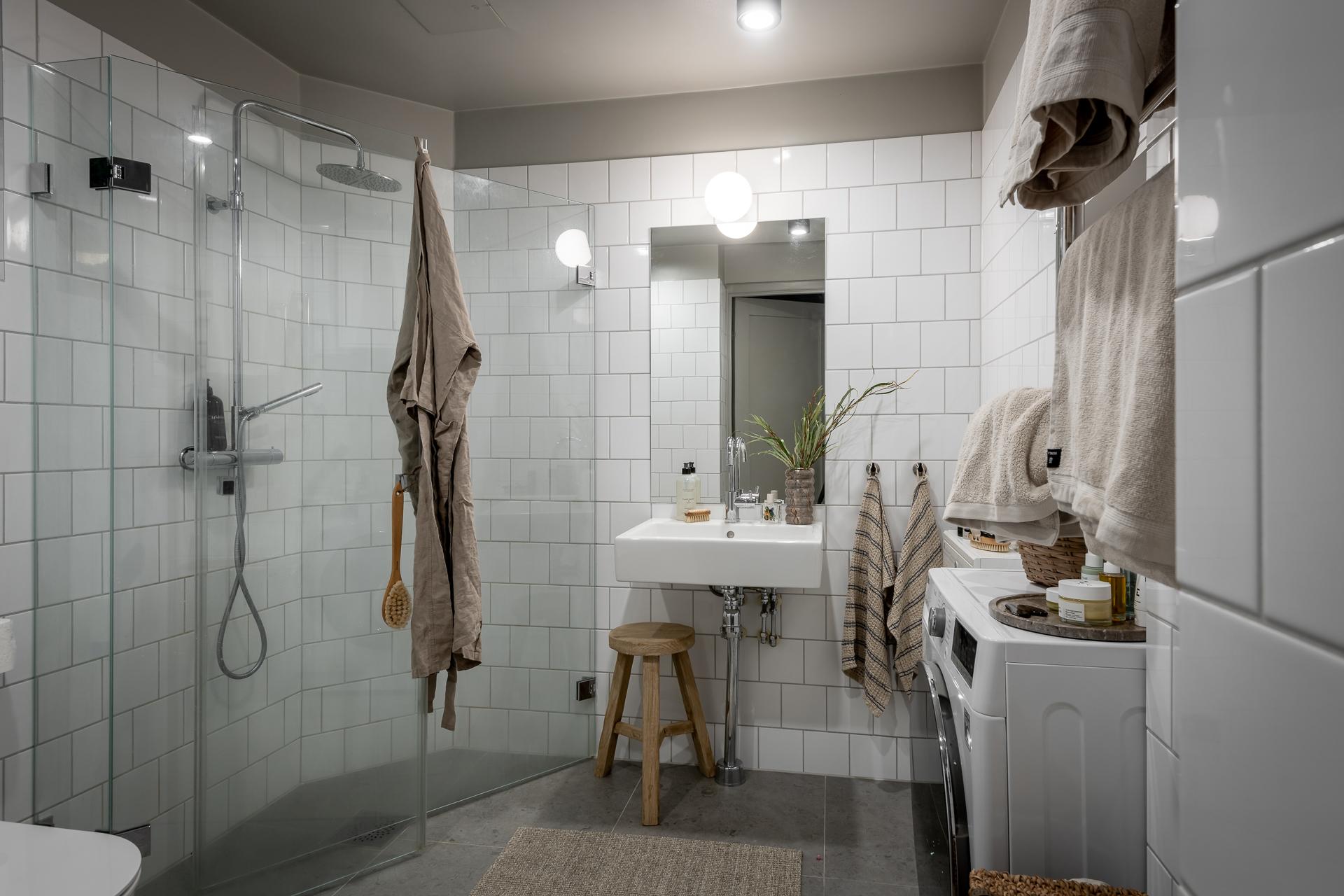 Helkaklat med klassiskt 15x15 kakel i halvt förband på väggarna och kalkstensliknande klinker på golvet. Vikväggar i glas kring duschen. Tvättställ, golvvärme, handdukstork samt kombinerad tvättmaskin och torktumlare. I nischen ovanför tvätt/tork sitter ett praktiskt skåp.