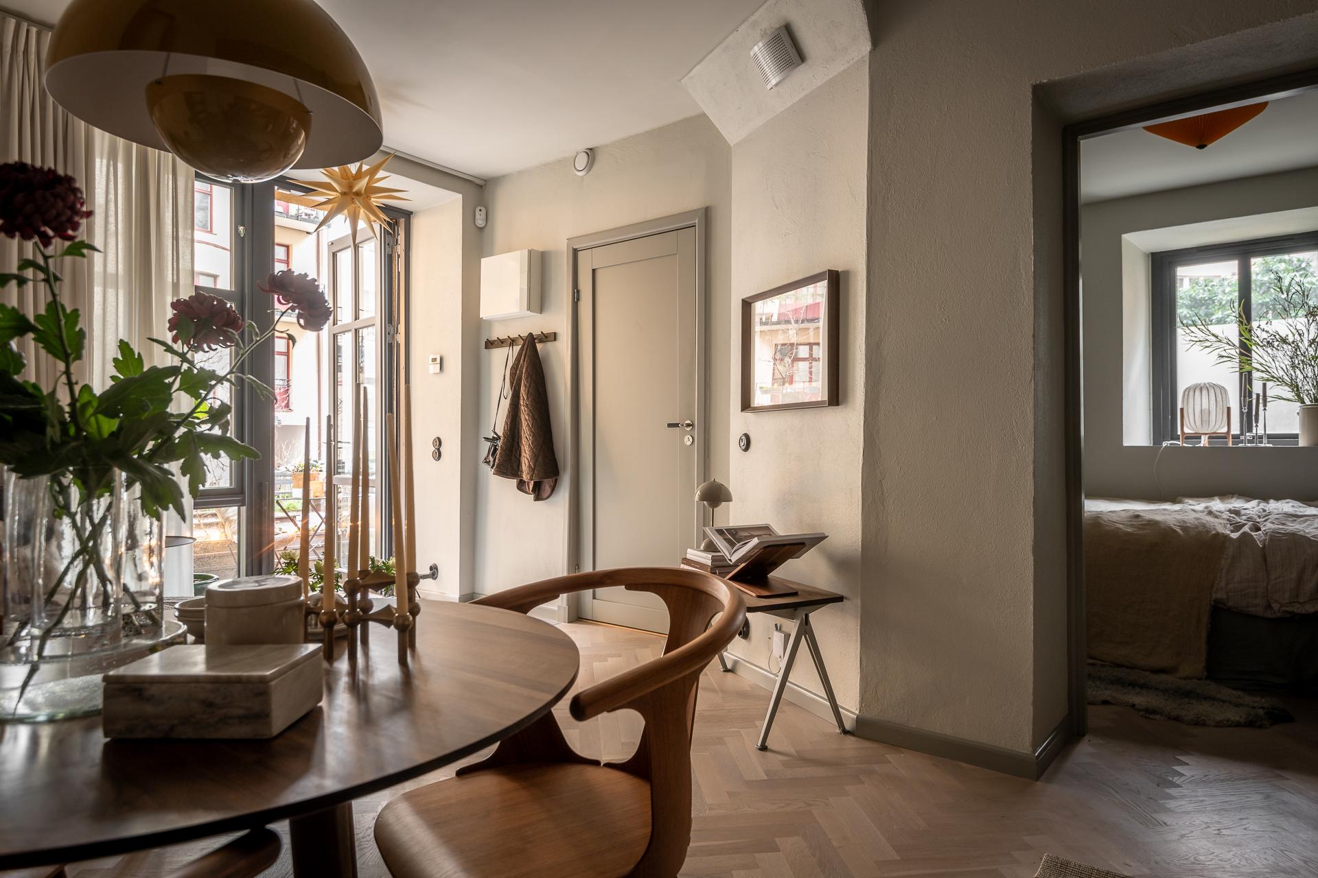 Tack vare sin mycket effektiva planlösning och höga takhöjd känns lägenheten större än vad kvadratmetrarna säger. Ljusinsläppet från det stora fönster- och dörrpartiet är härligt och man känner direkt att allt är väldigt väl genomtänkt och påkostat. Detta hem blev till 2021 i samband med att föreningen sålde och lät bygga om några av sina outnyttjade ytor.