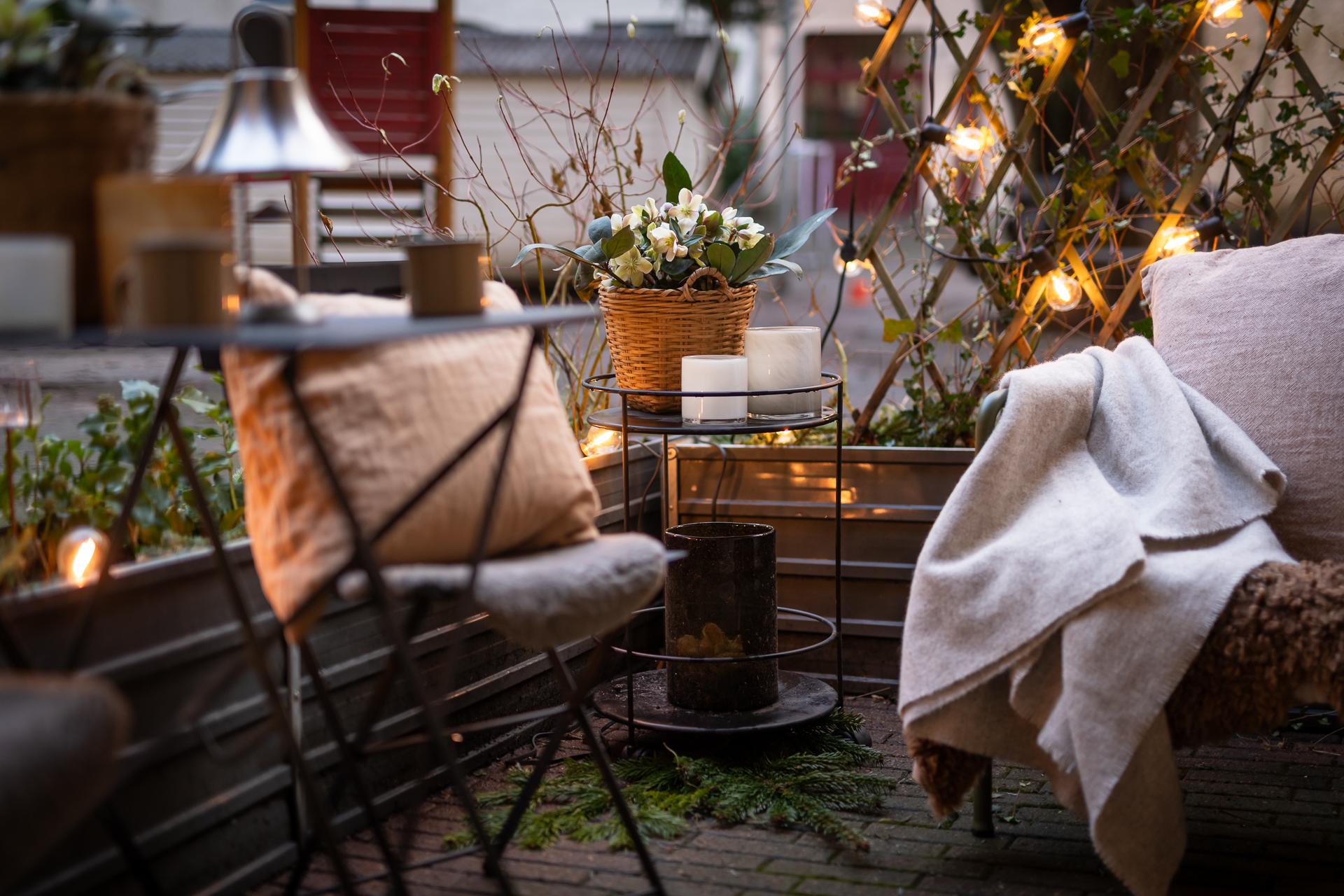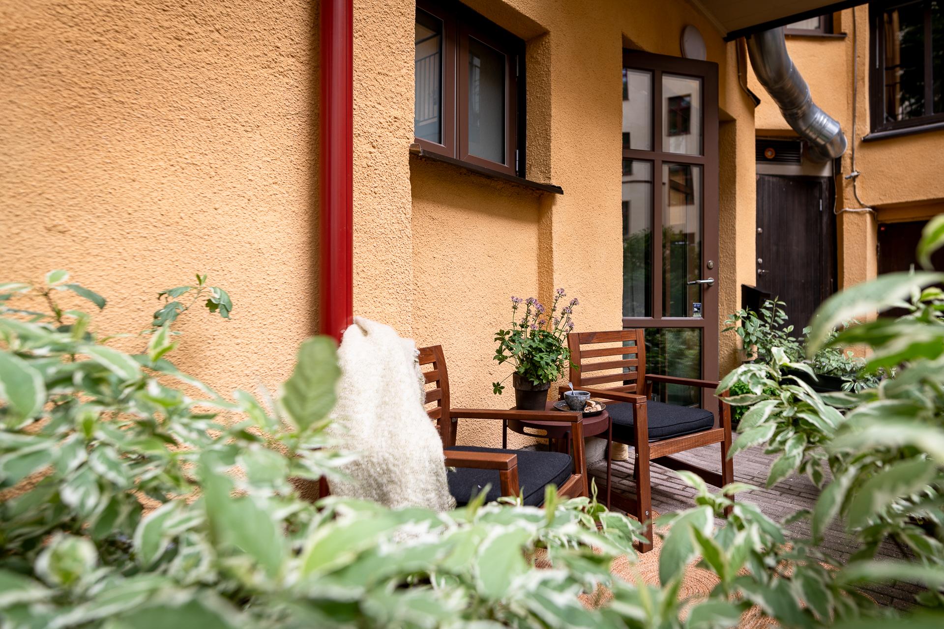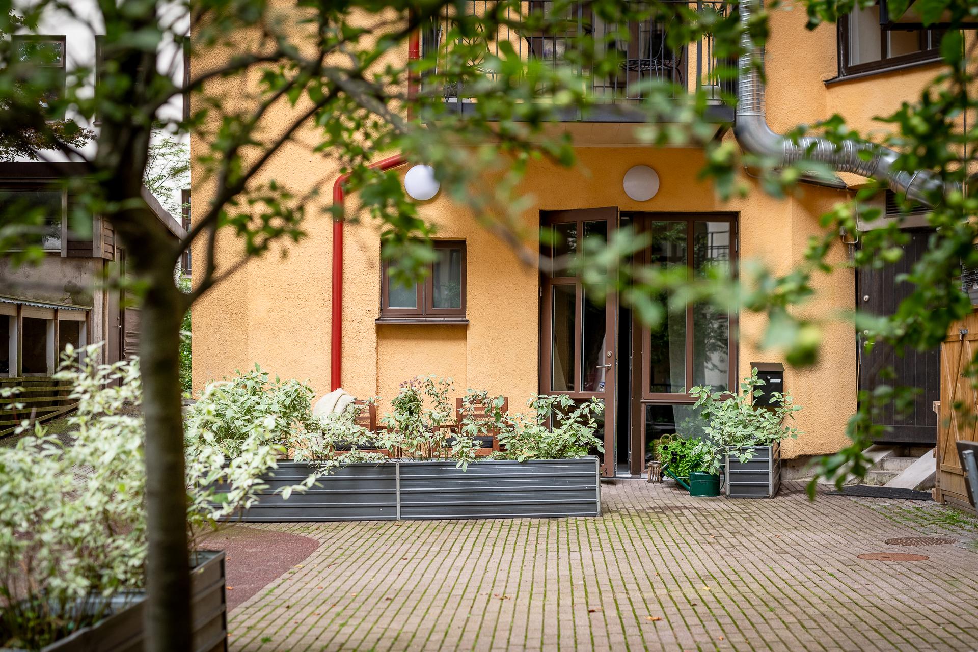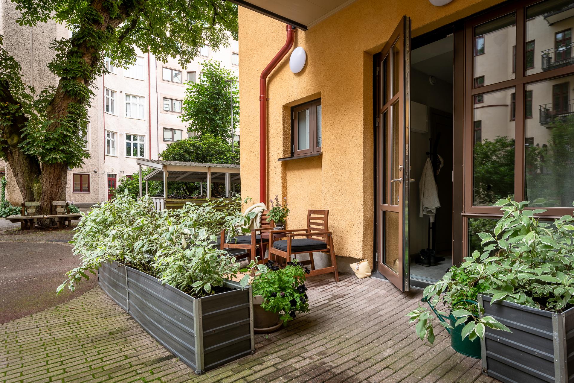 Till lägenheten hör en uteplats om sju kvadratmeter. Här kan du möblera med utemöbler och fina planteringar. Odlingslådorna som föreningen låtit ställa runt om uteplatsen ger en fin inramning och vill man ha ytterligare insynsskydd kan man sätta i spaljéer och låta någon fin klätterväxt ta plats.
