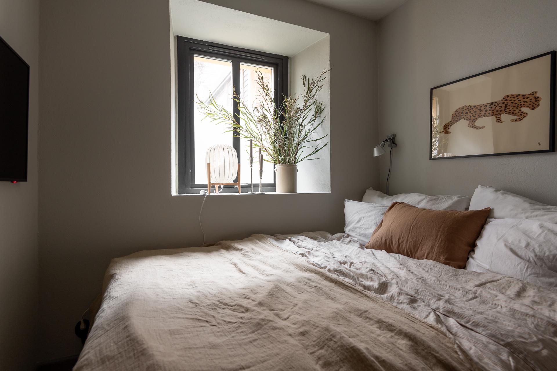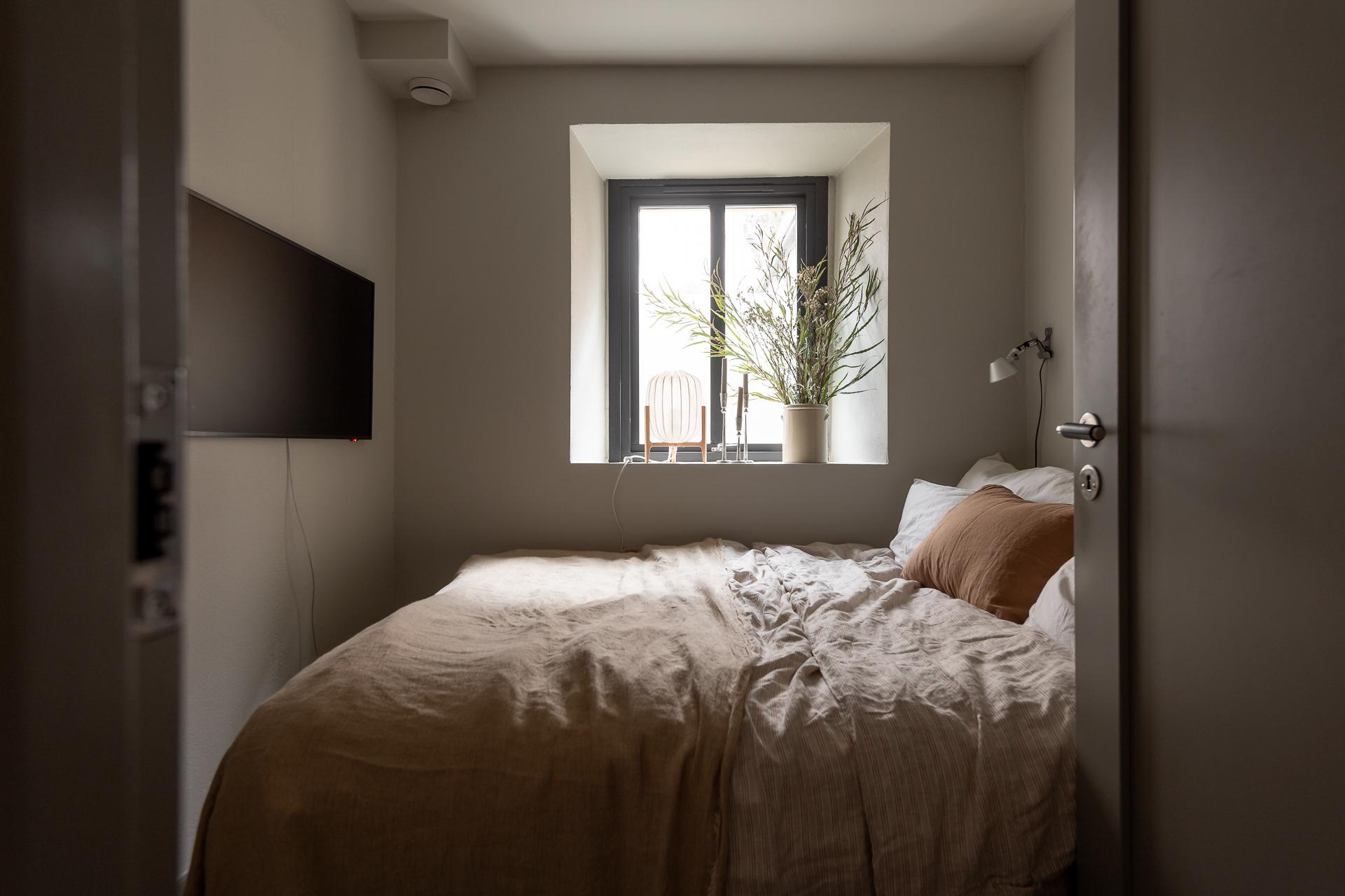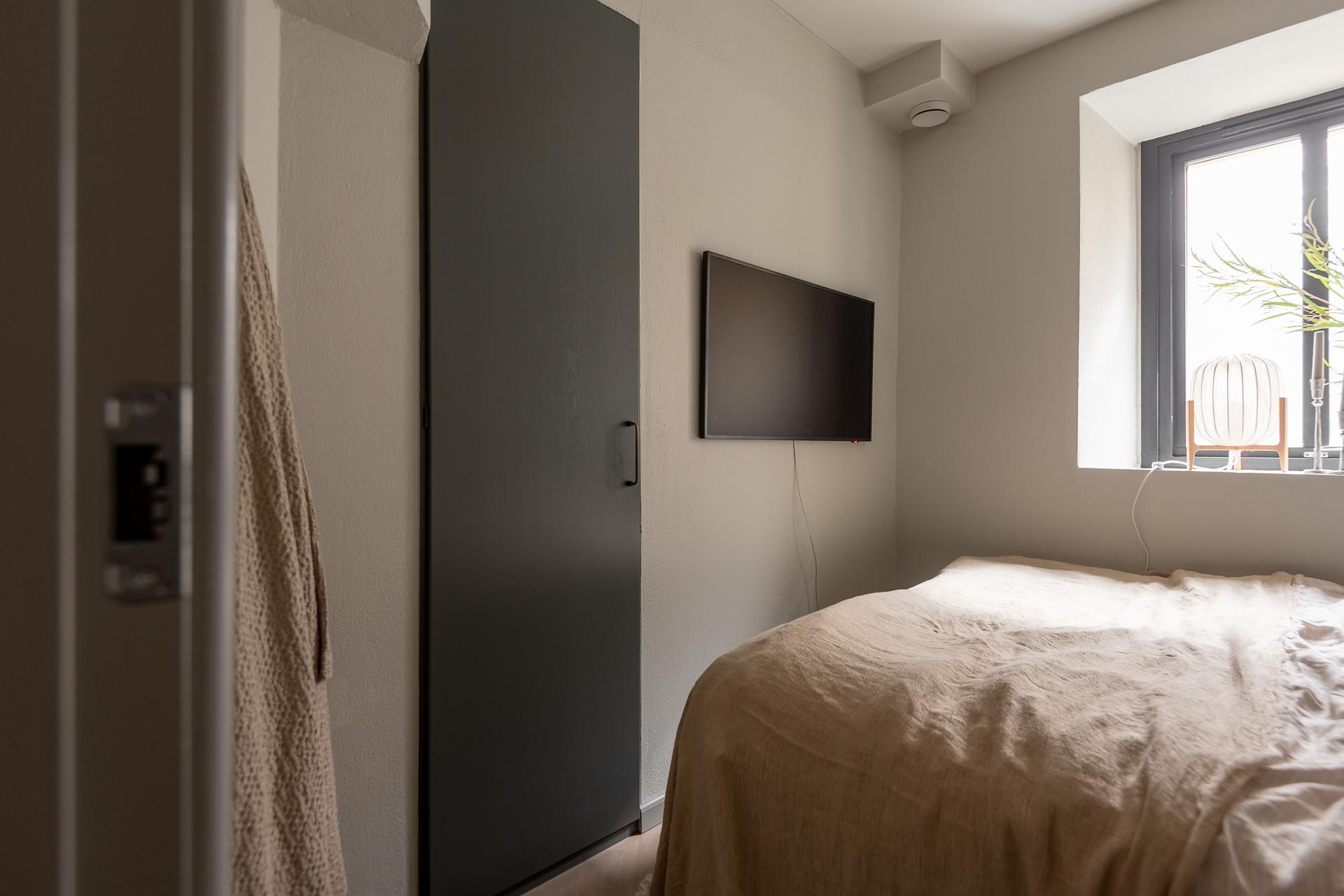 Mycket mysigt sovrum med plats för dubbelsäng. Här finns tre platsbyggda garderober.