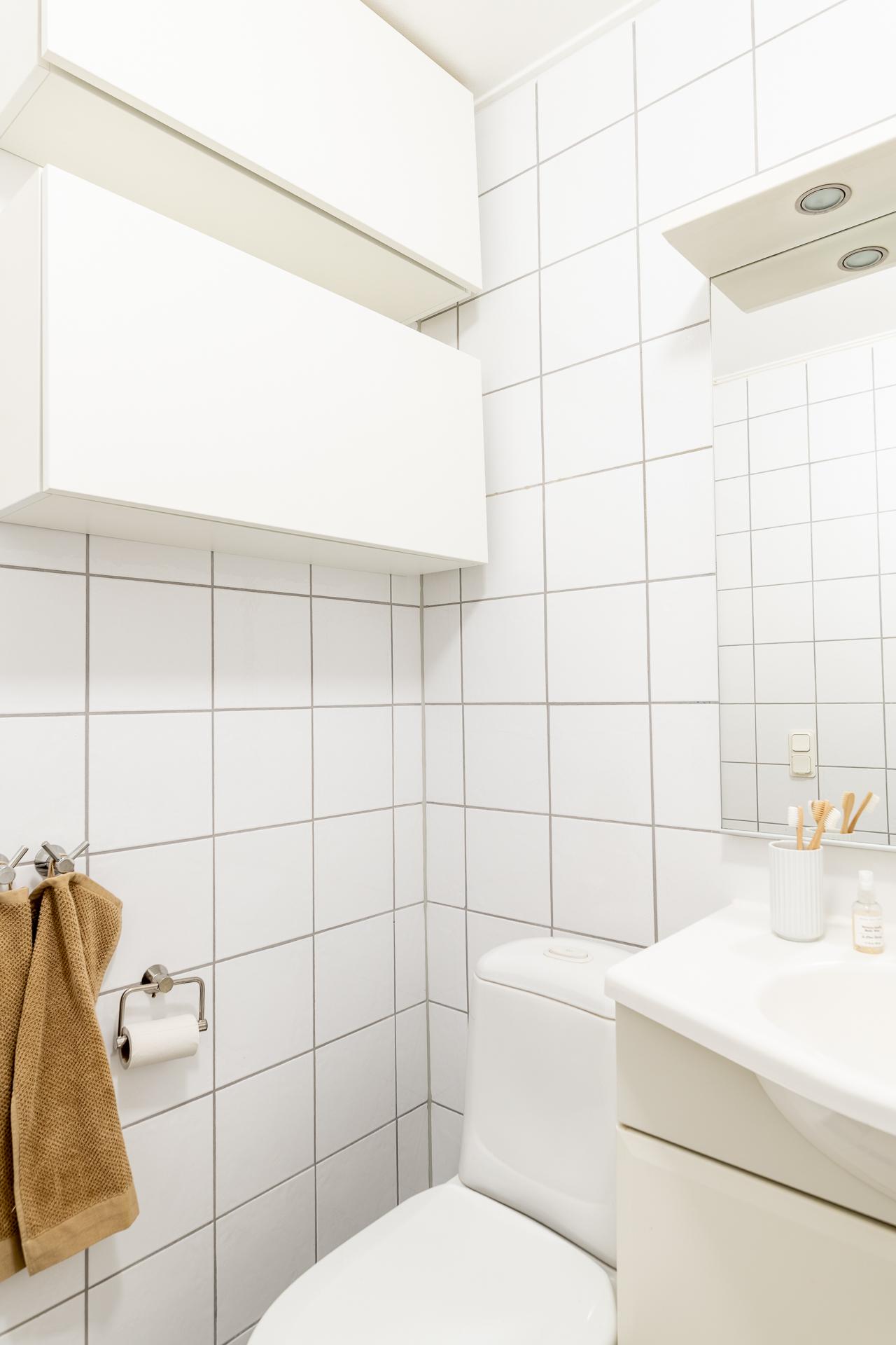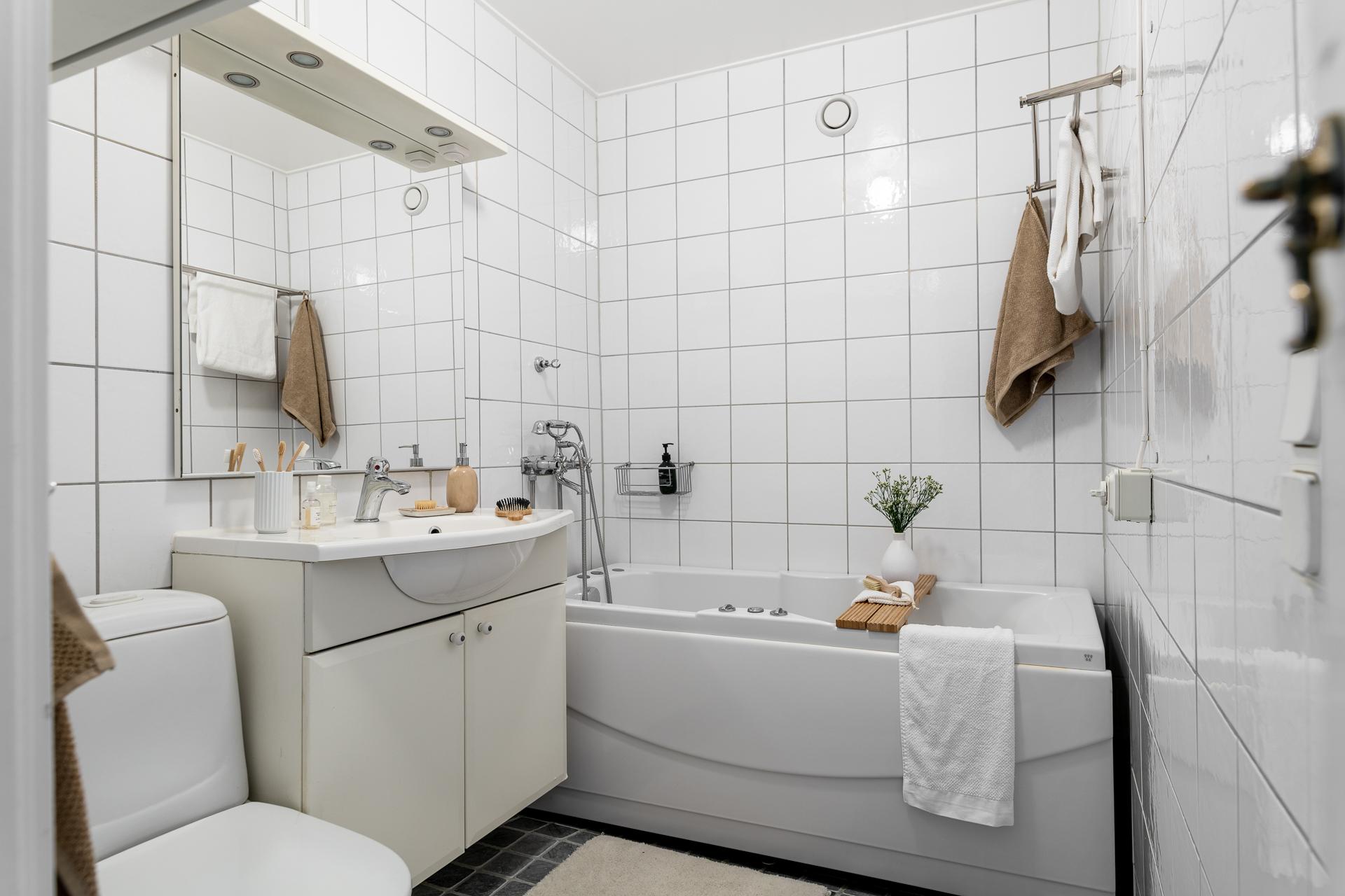 Rymligt och helkaklat badrum från 2004, med vitt kakel och grå klinker. Badkar med bubbelfunktioner, härligt avkopplande. Handfat med undersittande förvaring i vitt och ovansittande spegel med belysning. Extra skåp är uppsatta vilket ger bra förvaring för handdukar osv. Här fanns tidigare en tvättmaskin installerad och för den som så önskar kan man givetvis göra det på nytt.
