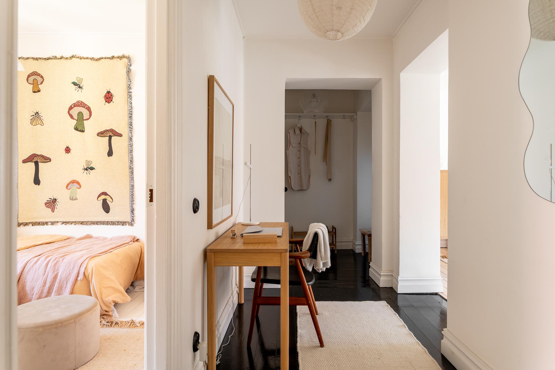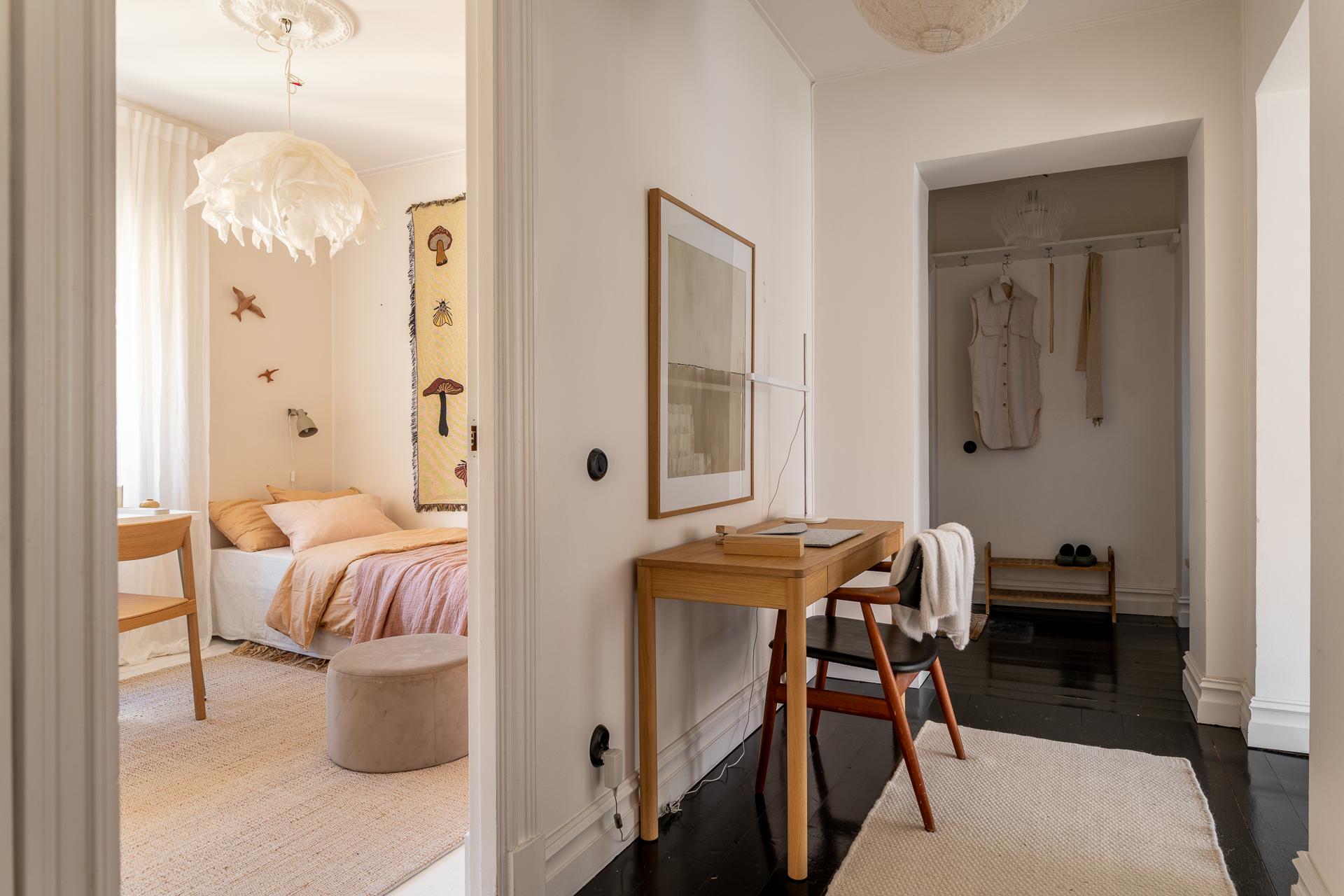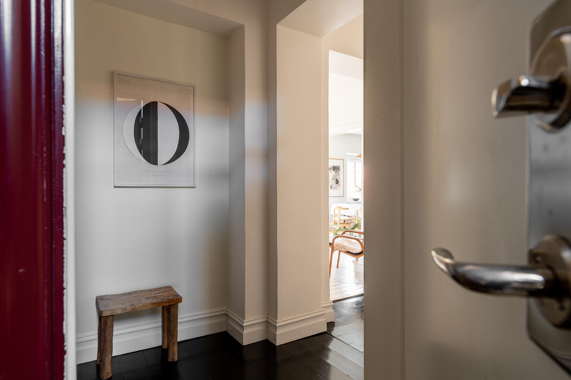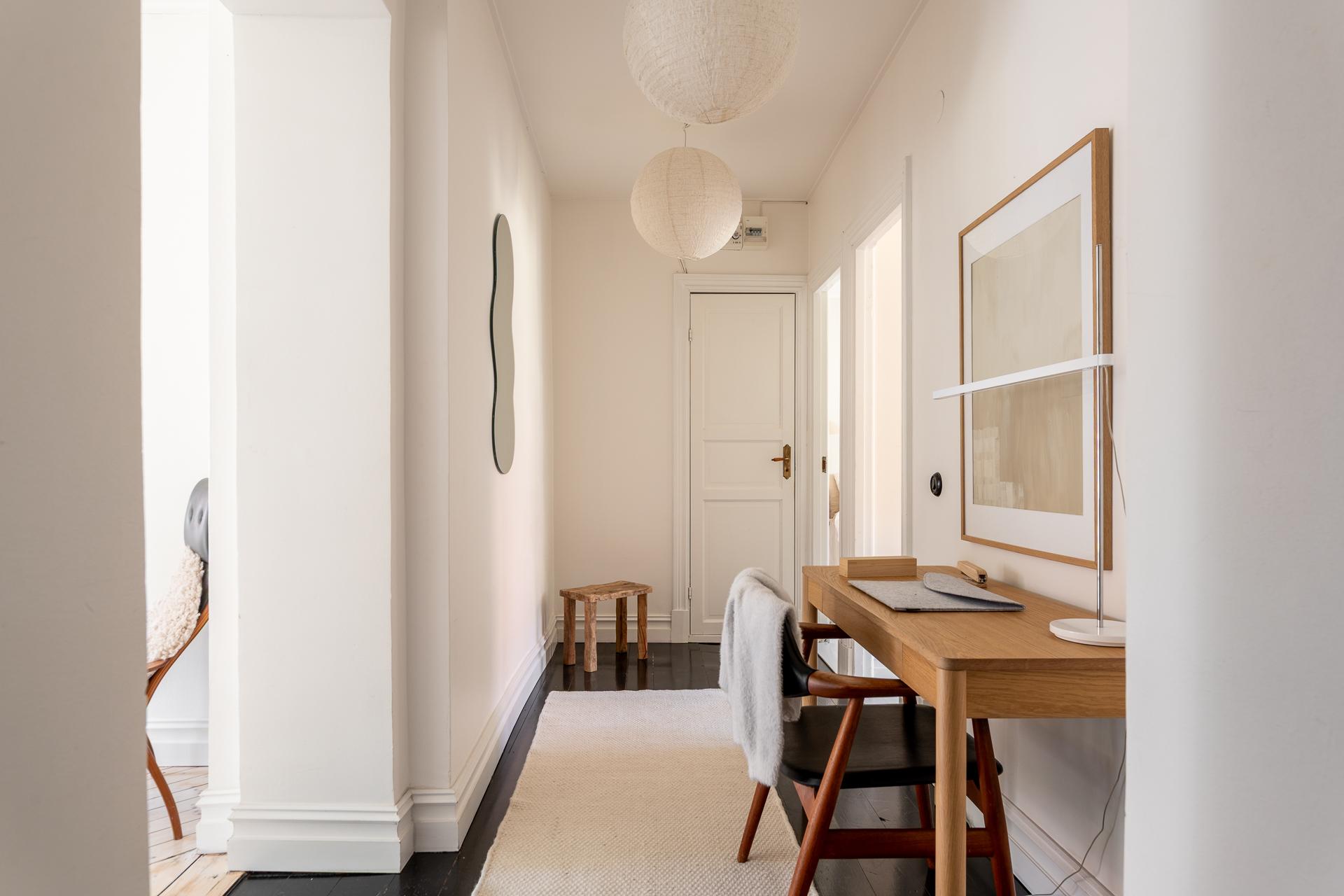 Redan när man kommer in i hallen förstår man att detta är ett hem med stil och personlighet. Den första delen av hallen passar perfekt för avhängning av ytterkläder och skor och övergår sedan i en inre hall som binder samman hela lägenheten. Här ryms en mindre arbetsplats samt ytterligare förvaring.