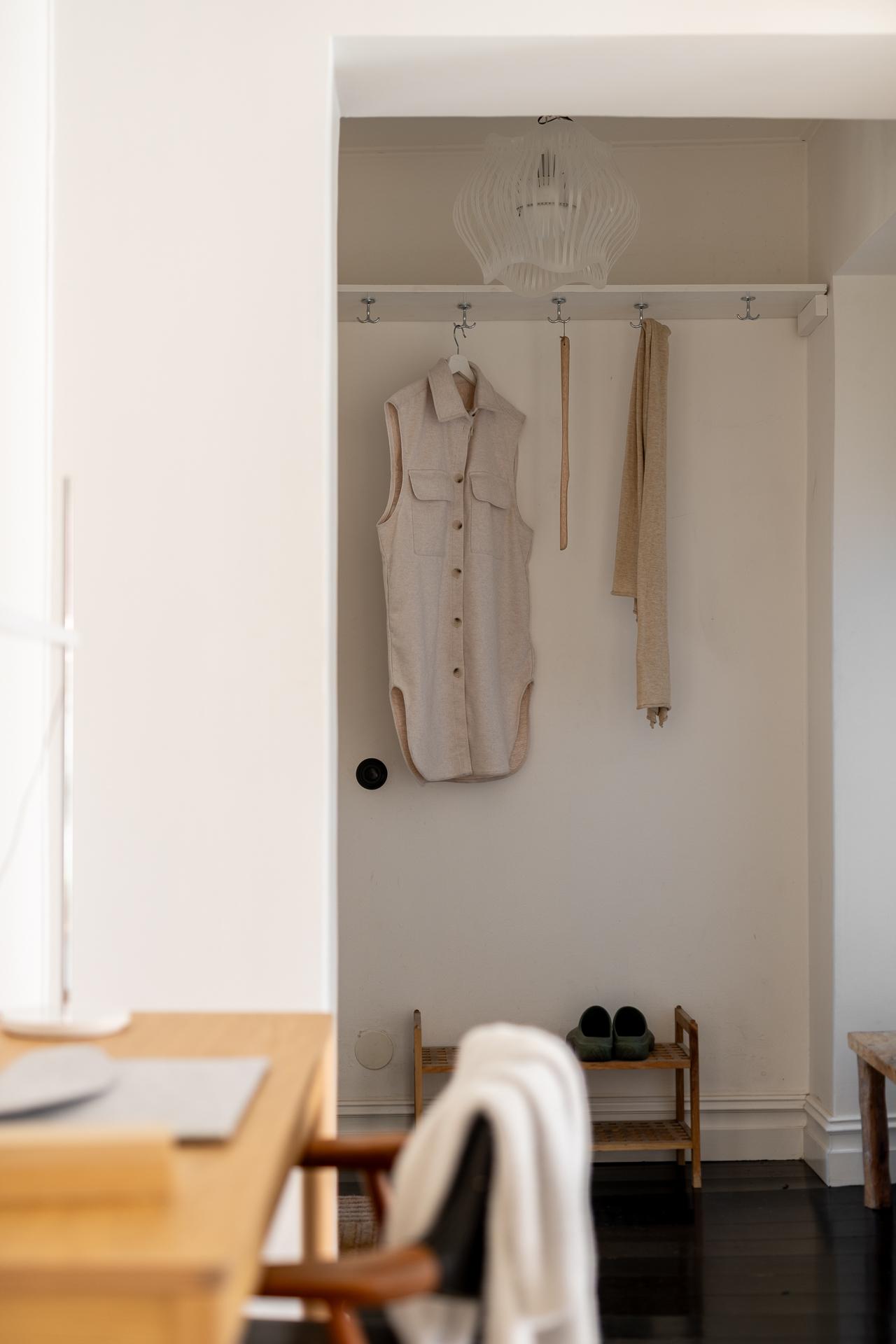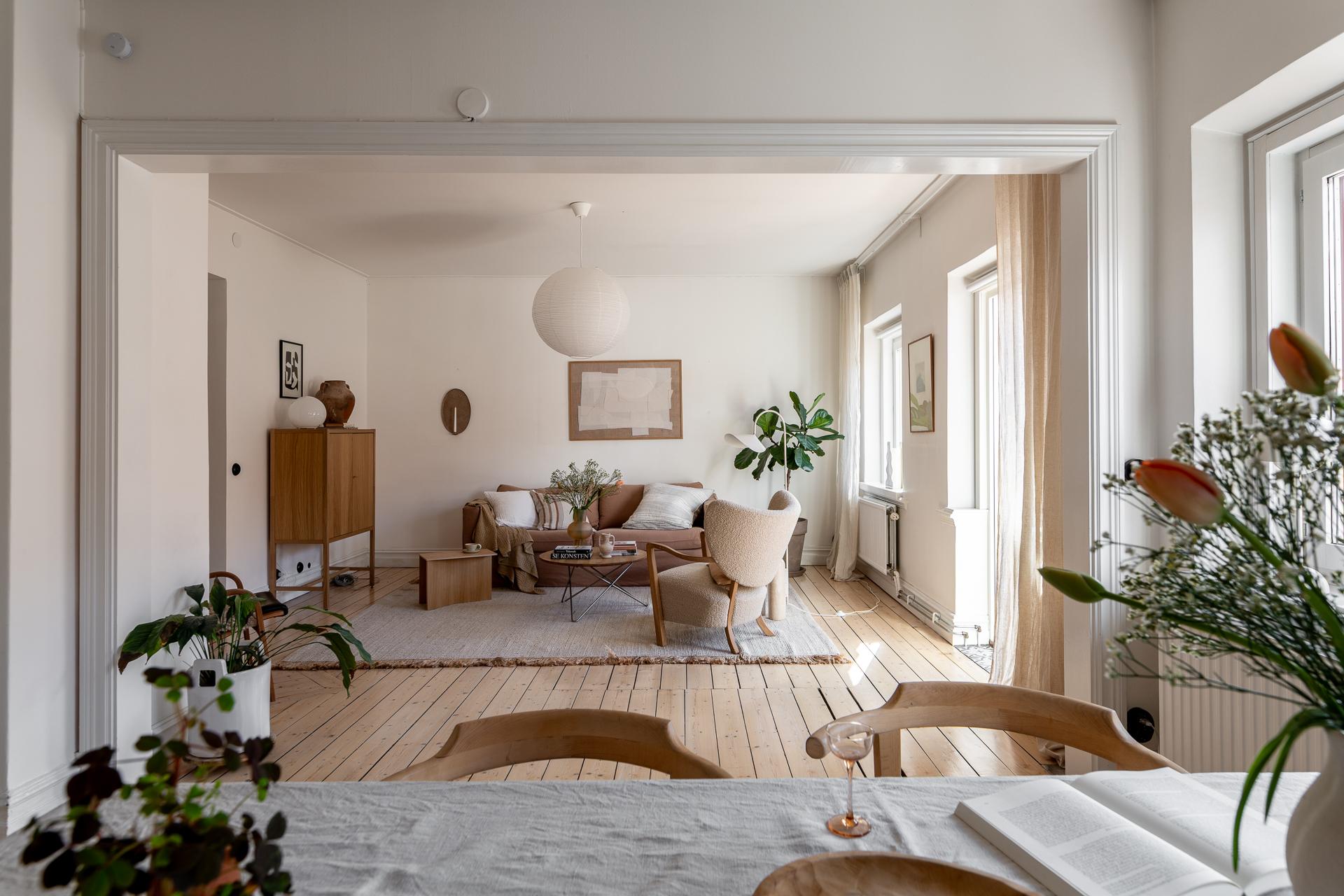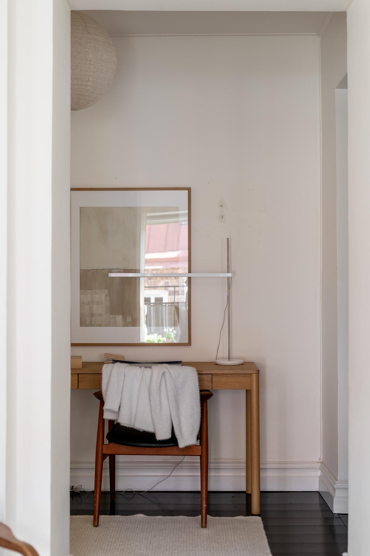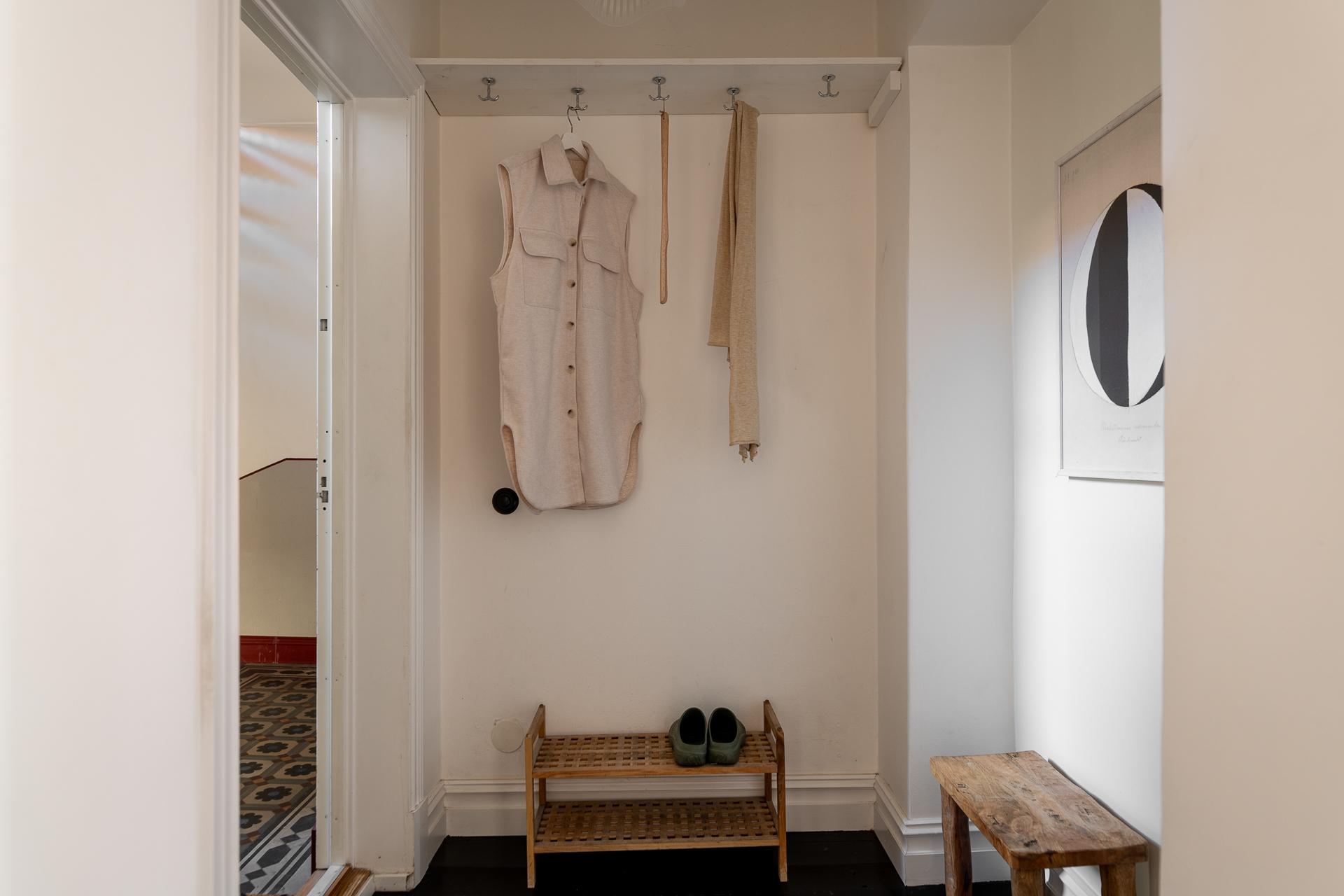 Redan när man kommer in i hallen förstår man att detta är ett hem med stil och personlighet. Den första delen av hallen passar perfekt för avhängning av ytterkläder och skor och övergår sedan i en inre hall som binder samman hela lägenheten. Här ryms en mindre arbetsplats samt ytterligare förvaring.