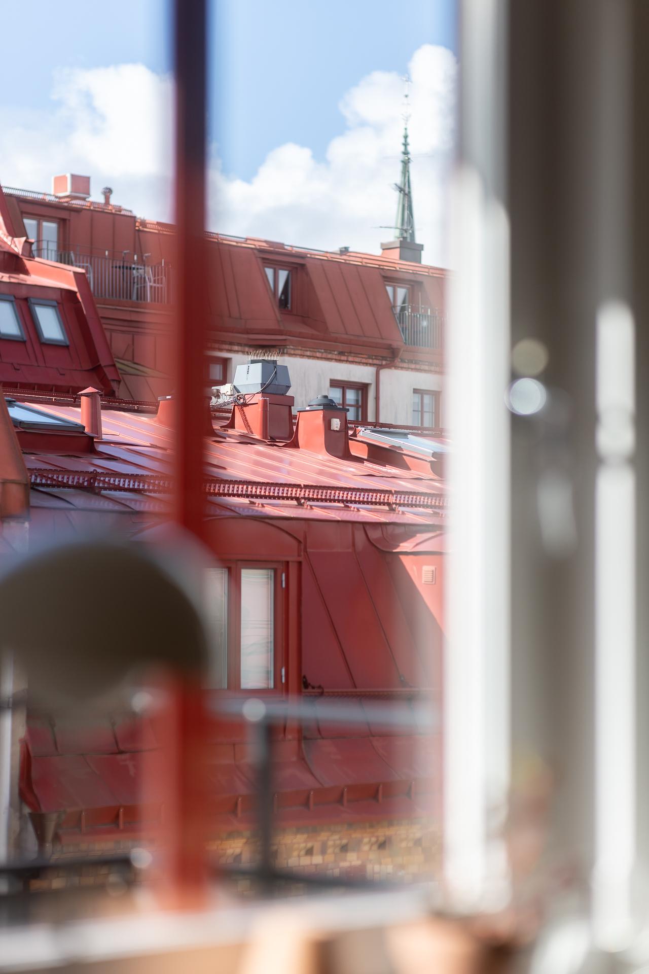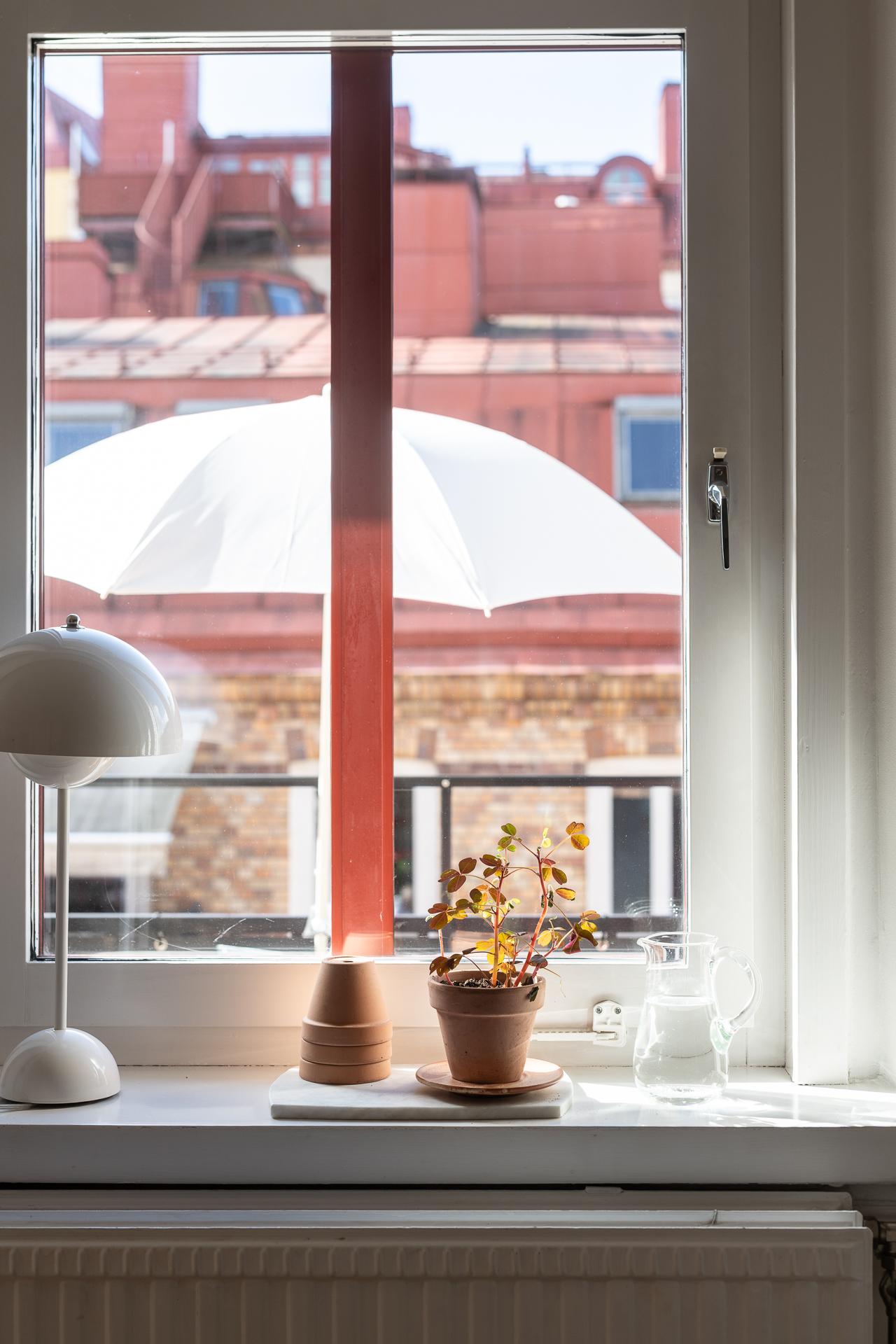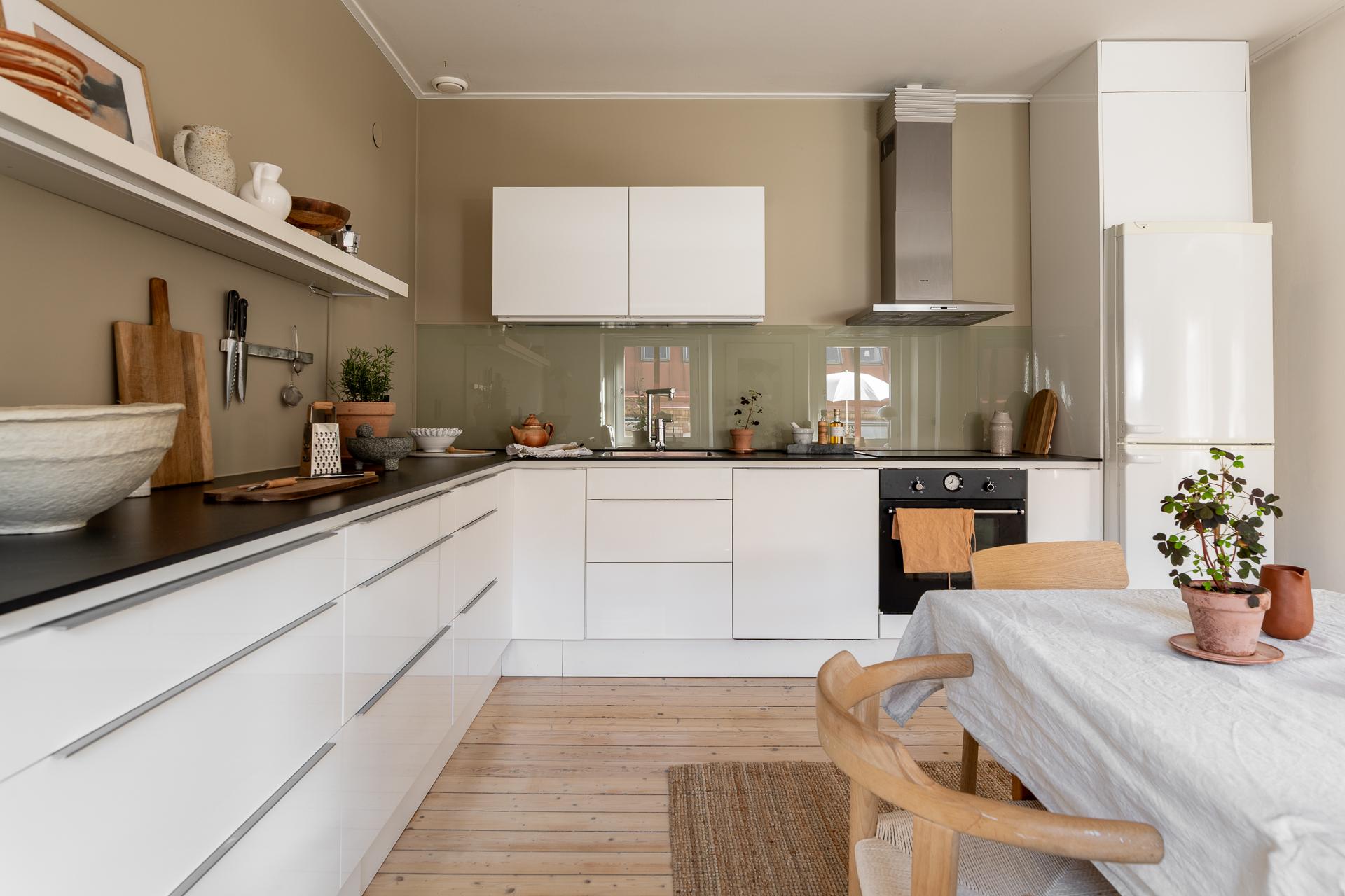 Den öppna planlösningen mellan kök och vardagsrum inbjuder verkligen umgänge. Duka upp för fest, här kan riktigt stora sällskap rymmas med lätthet. Köket som renoverades 2009 breder ut sig i vinkel och har gott om arbetsytor och förvaring. En nätt svart laminatskiva bryter fint mot det i övrigt vita köket och en glasskiva fungerar som stänkskydd bakom spis och vask. Som en förlängning av köket mot köksfönstret har man skapat en kökssoffa med inbyggd förvaring. Kryp upp med tidningen, blicka ut över plåttaken och njut av lugnet från Nordhemsgatan nedanför. Köket är utrustat med kombinerad kyl och frys, integrerad diskmaskin, varmluftsugn och glaskeramikhäll med ovansittande kolfilterfläkt.