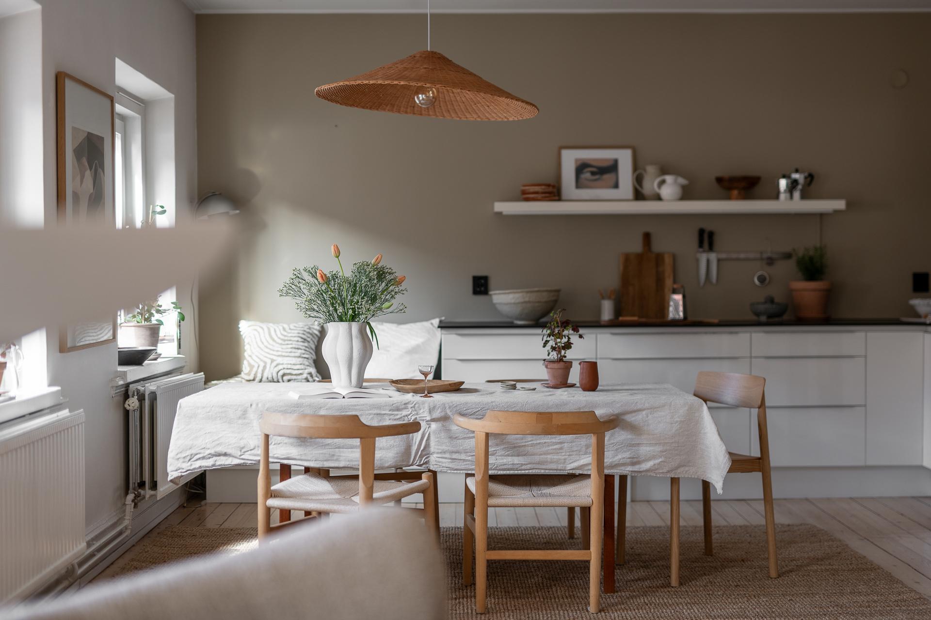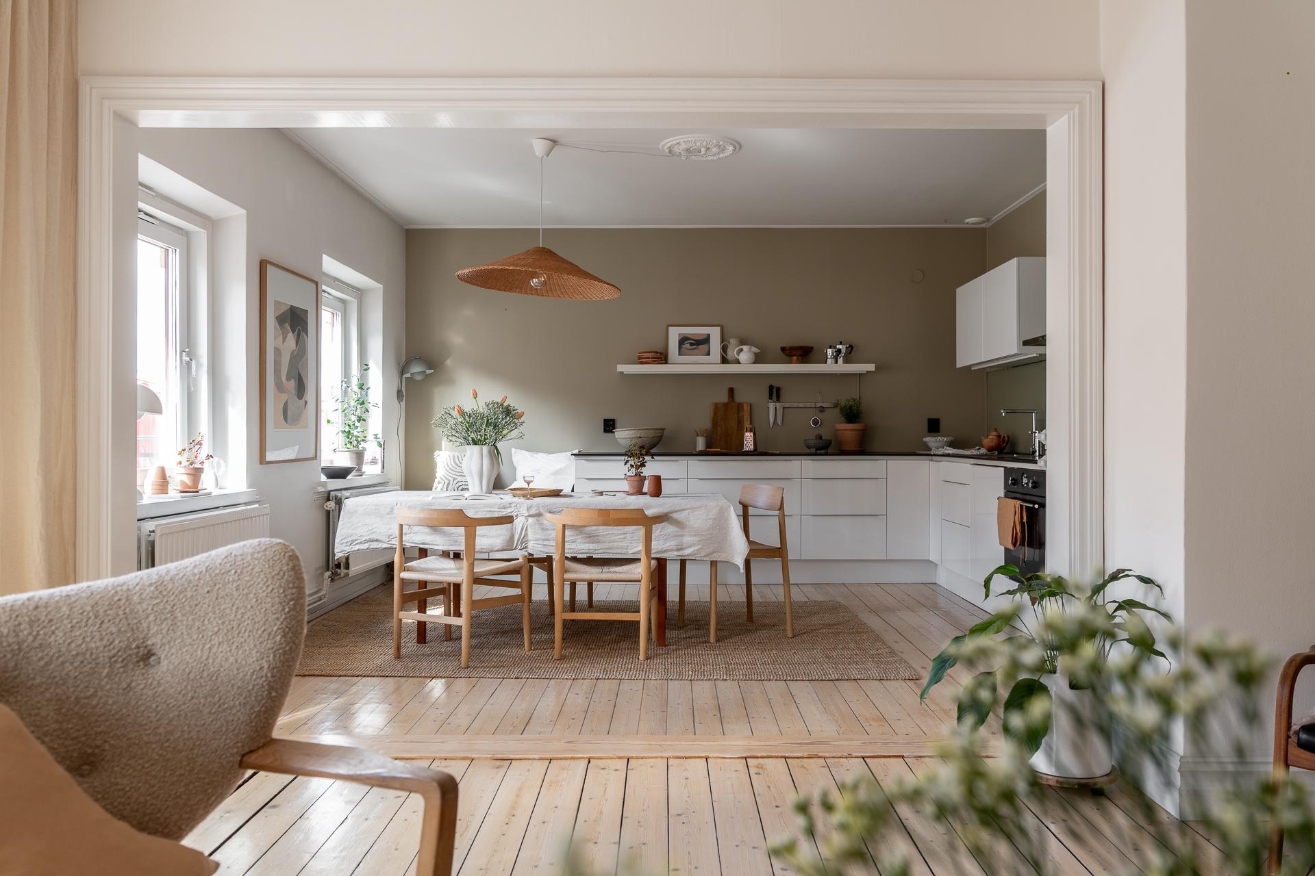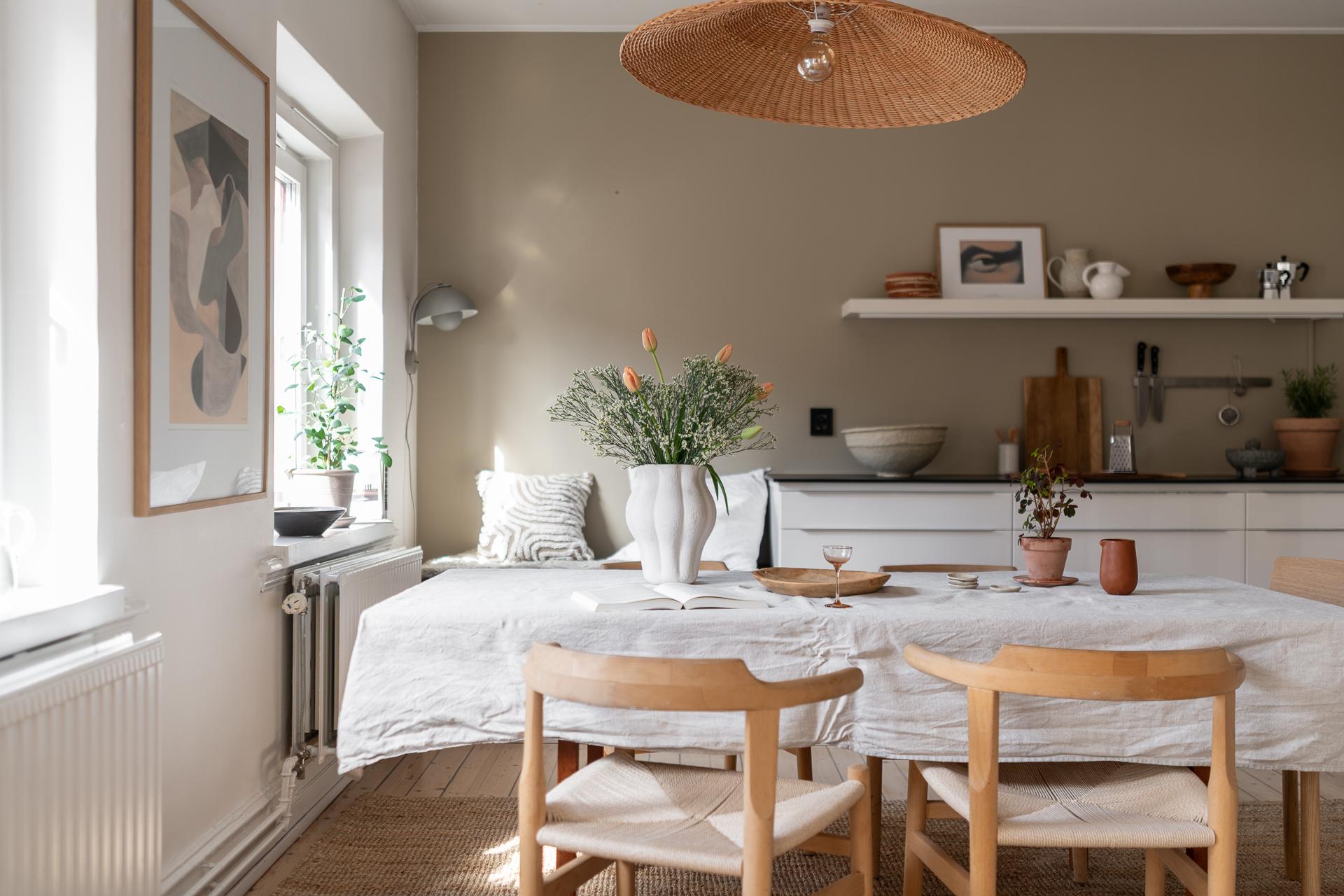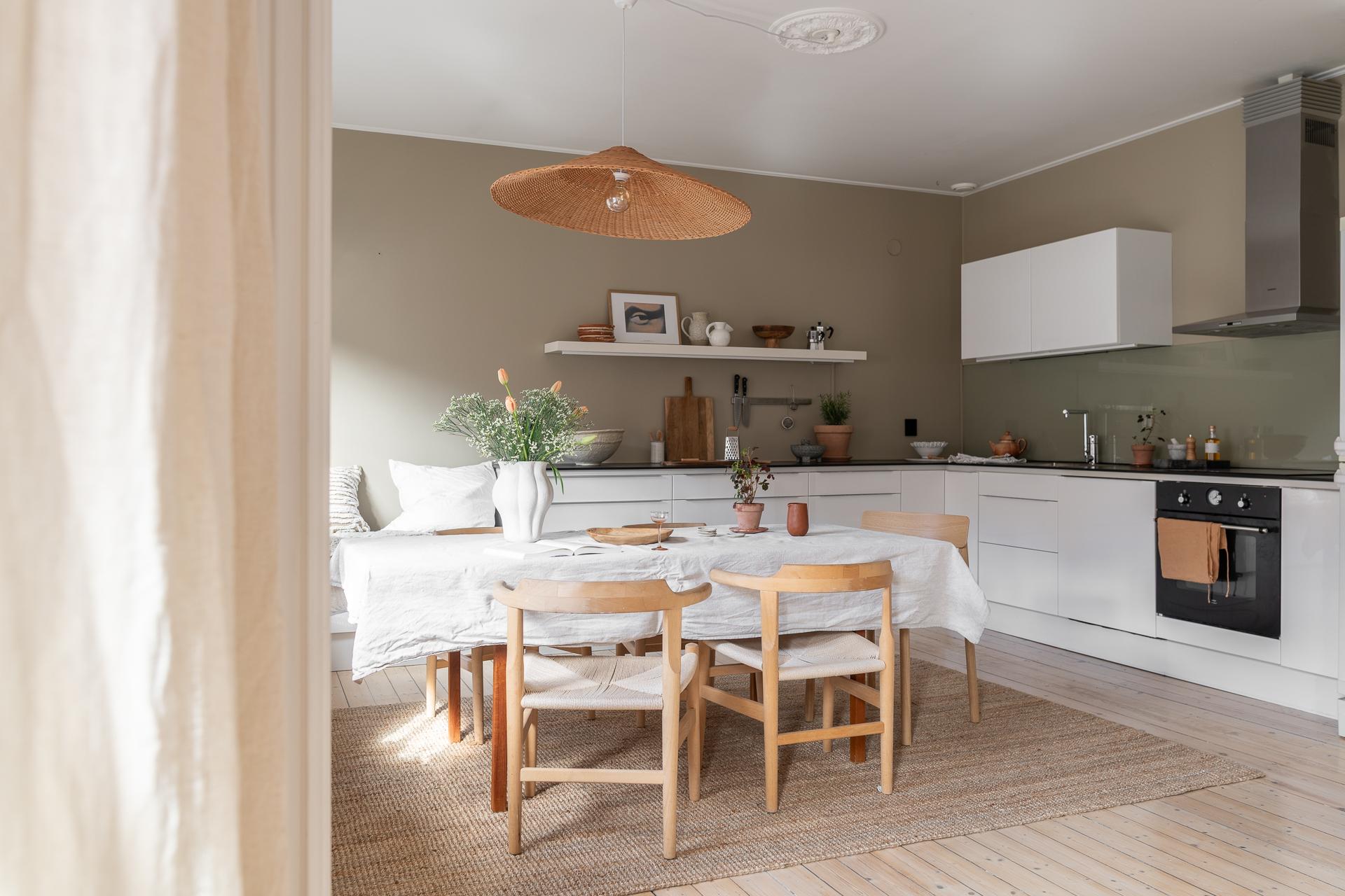 Den öppna planlösningen mellan kök och vardagsrum inbjuder verkligen umgänge. Duka upp för fest, här kan riktigt stora sällskap rymmas med lätthet. Köket som renoverades 2009 breder ut sig i vinkel och har gott om arbetsytor och förvaring. En nätt svart laminatskiva bryter fint mot det i övrigt vita köket och en glasskiva fungerar som stänkskydd bakom spis och vask. Som en förlängning av köket mot köksfönstret har man skapat en kökssoffa med inbyggd förvaring. Kryp upp med tidningen, blicka ut över plåttaken och njut av lugnet från Nordhemsgatan nedanför. Köket är utrustat med kombinerad kyl och frys, integrerad diskmaskin, varmluftsugn och glaskeramikhäll med ovansittande kolfilterfläkt.