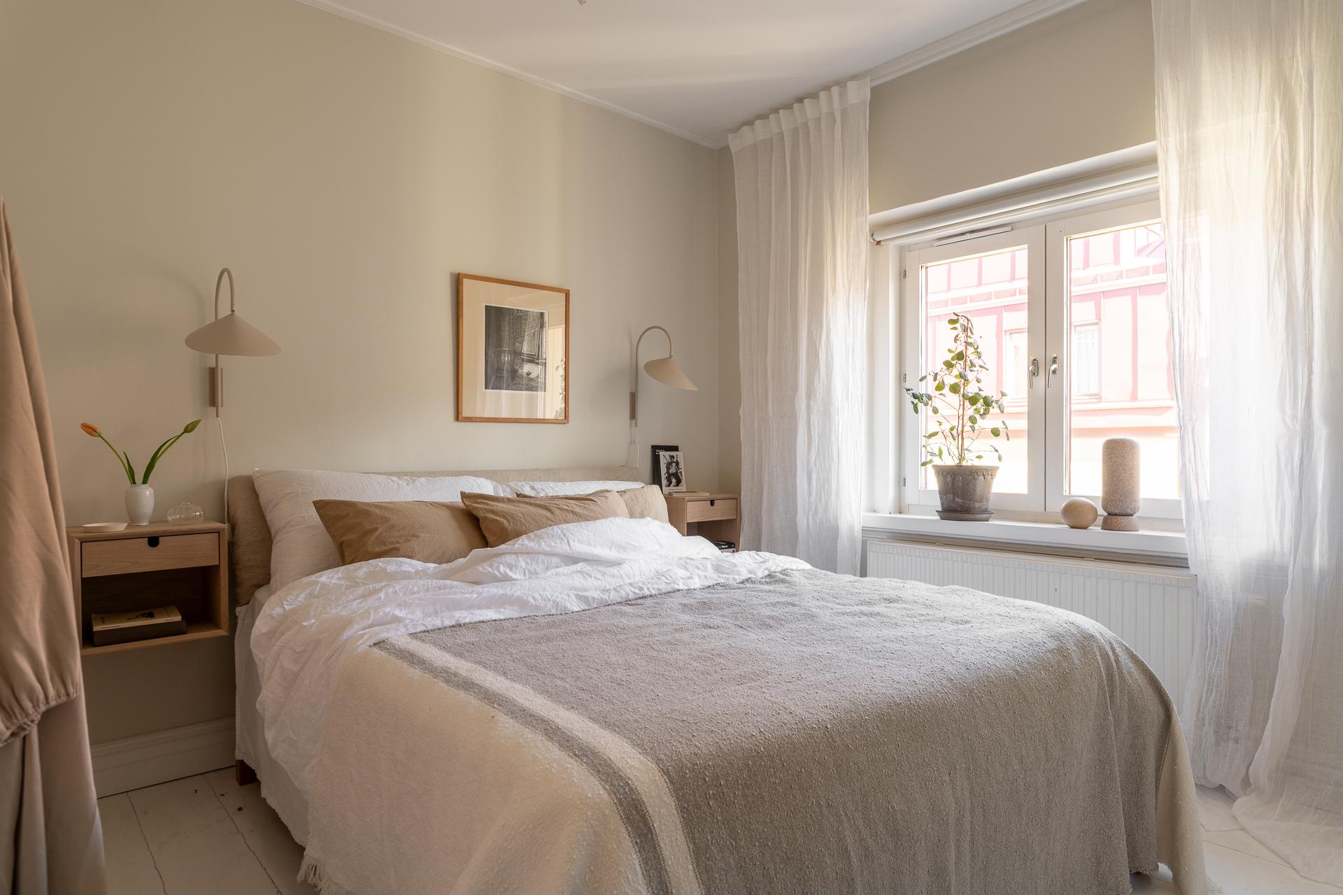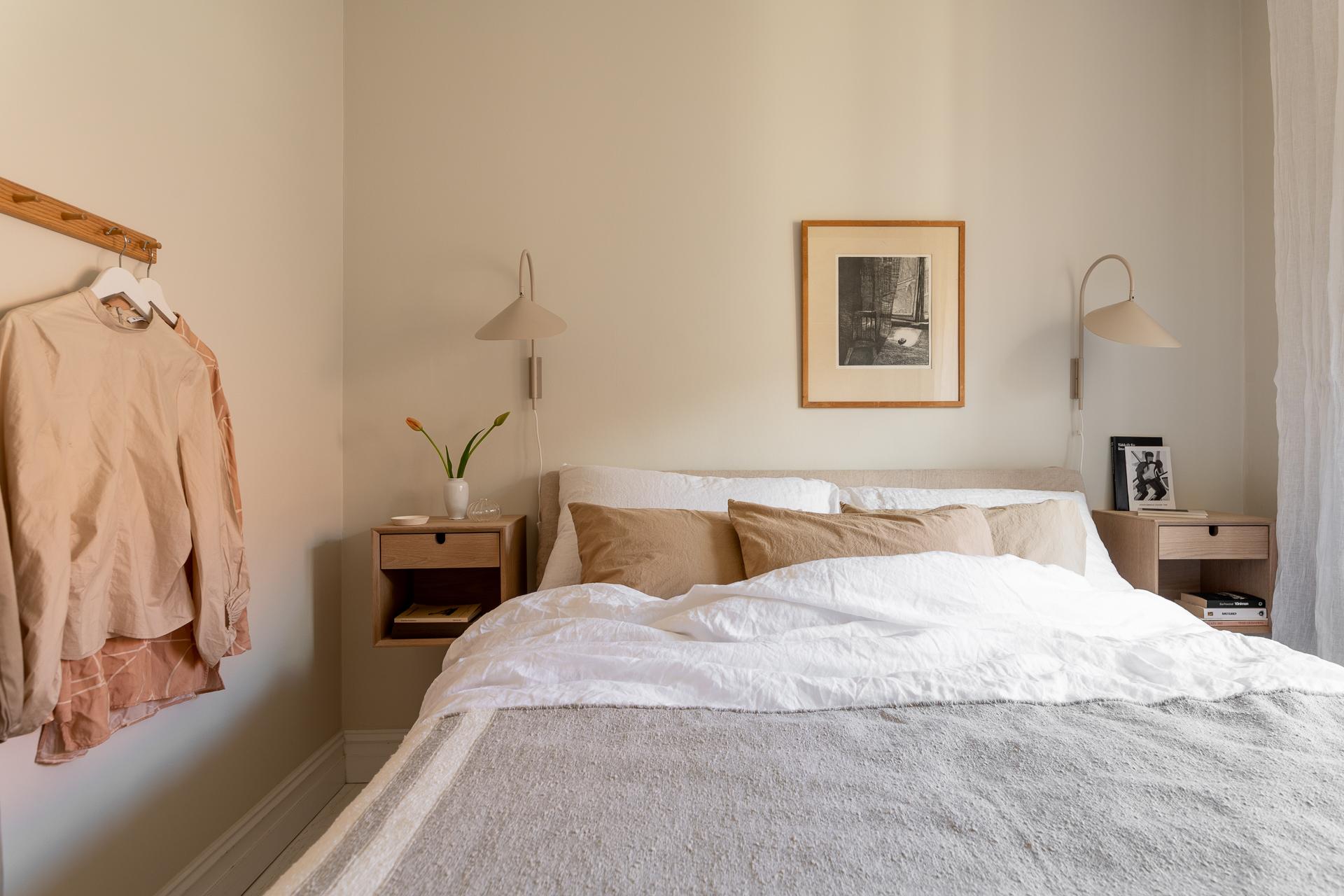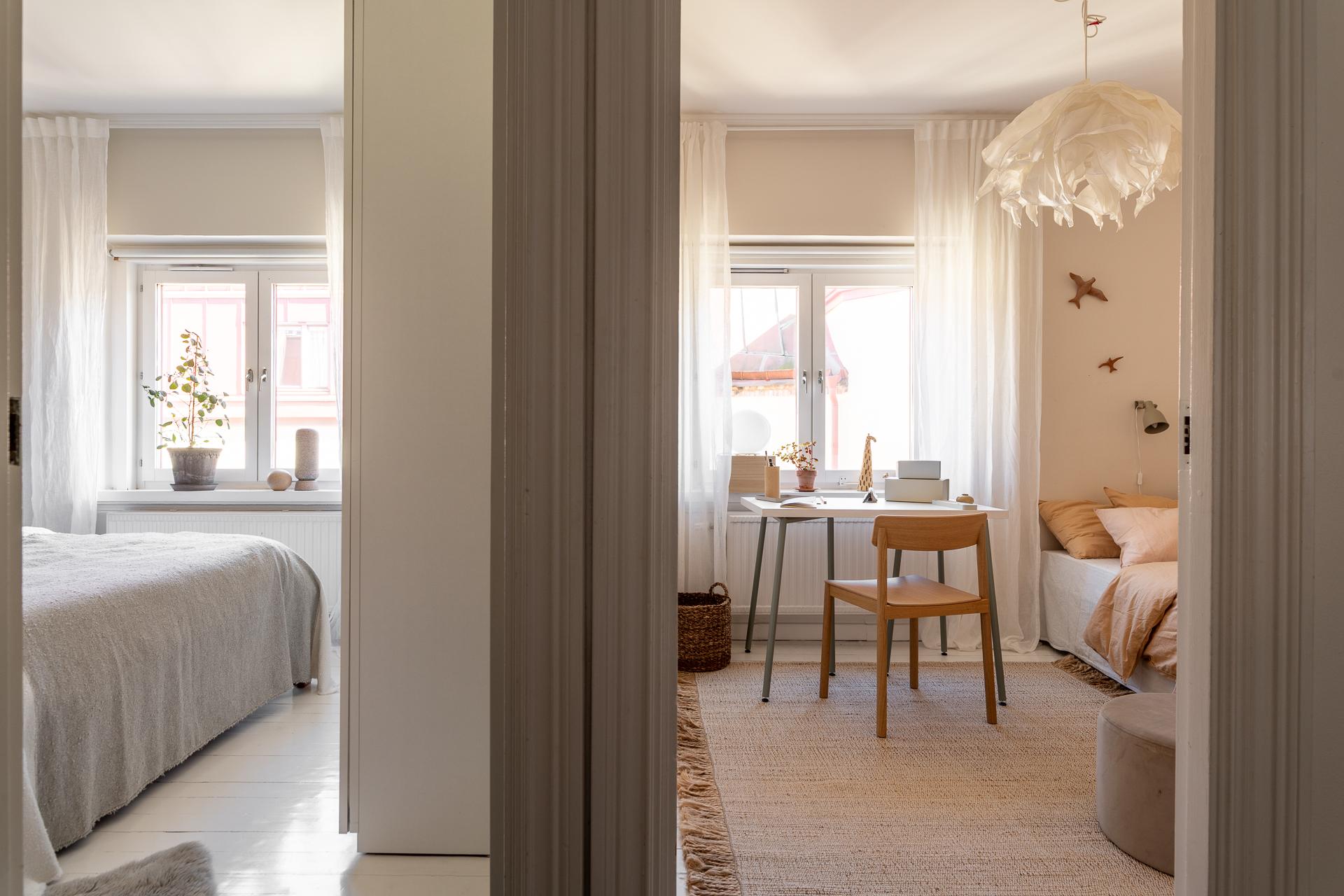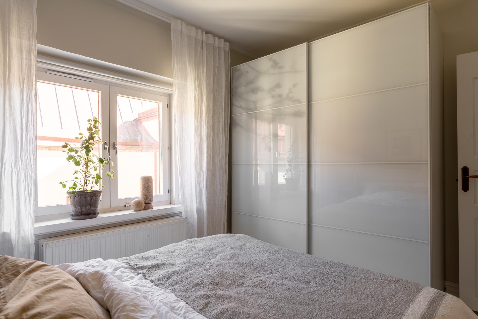 Två lugnt belägna sovrum in mot gården, båda dessutom med plats för dubbelsäng vilket inte är helt vanligt. Det ena av de två sovrummen har en rejäl garderobslösning med skjutdörrar. Väggarna är nymålade i en ljus sandfärgad ton medan brädgolvet är vitmålat.
