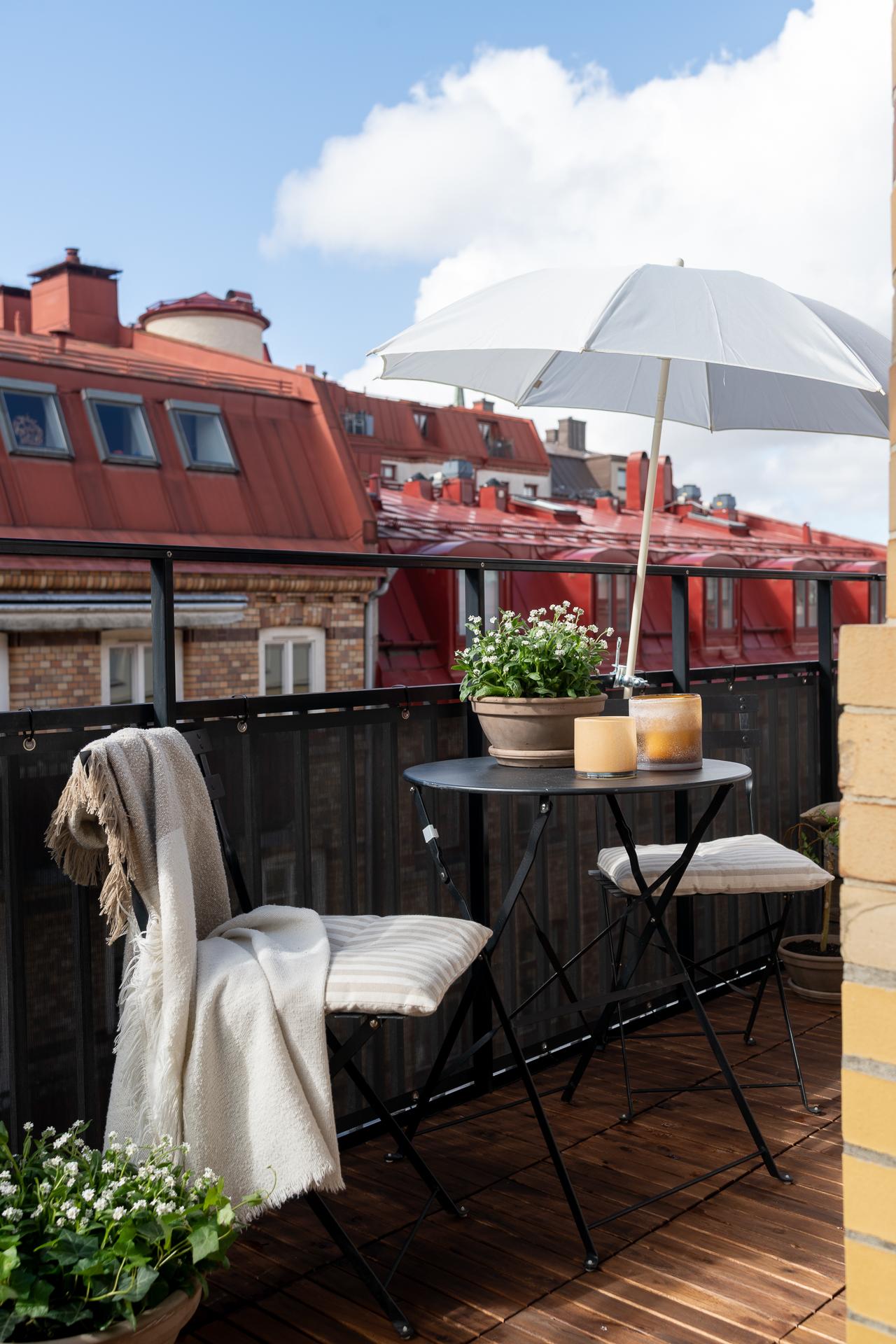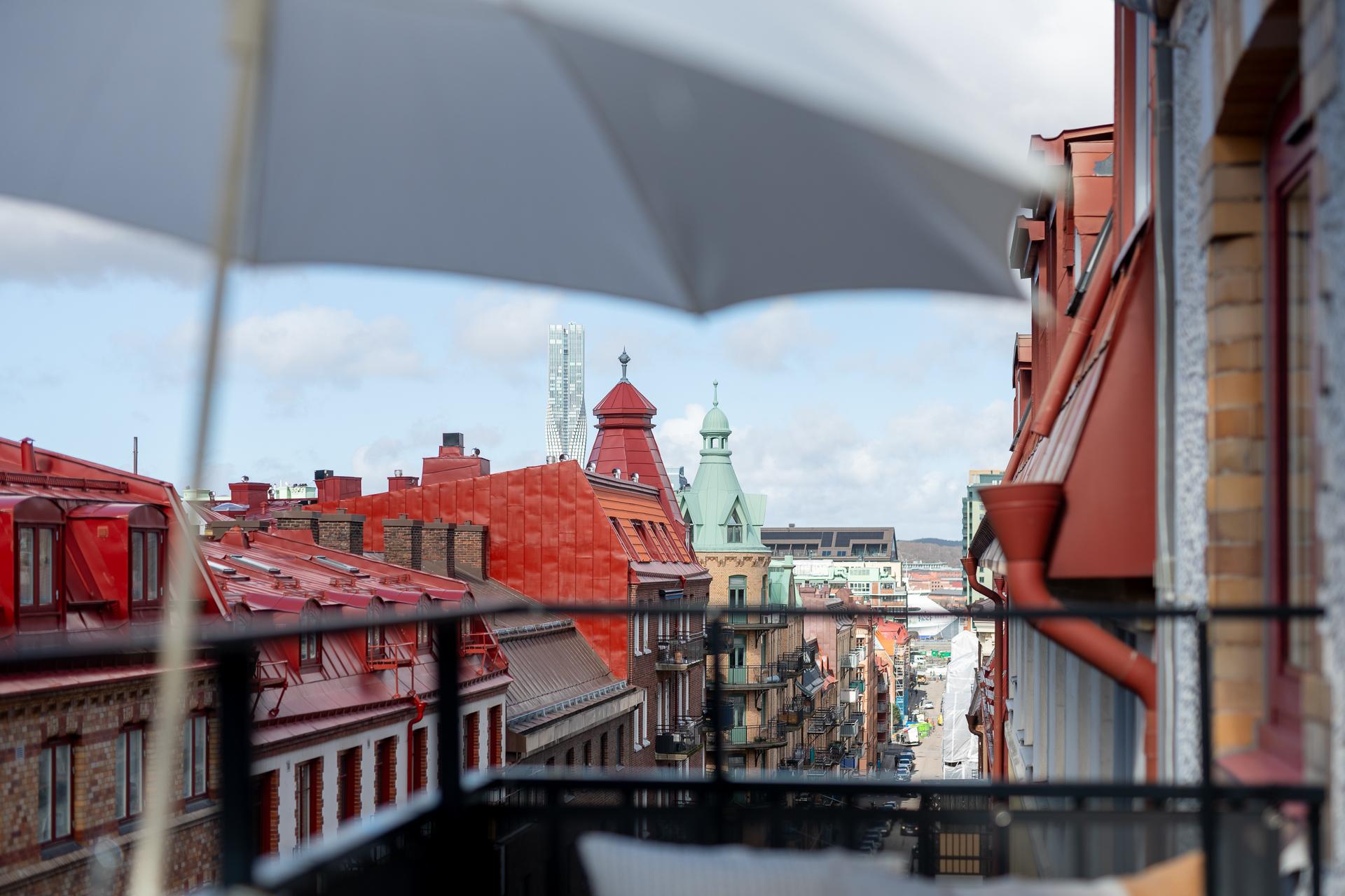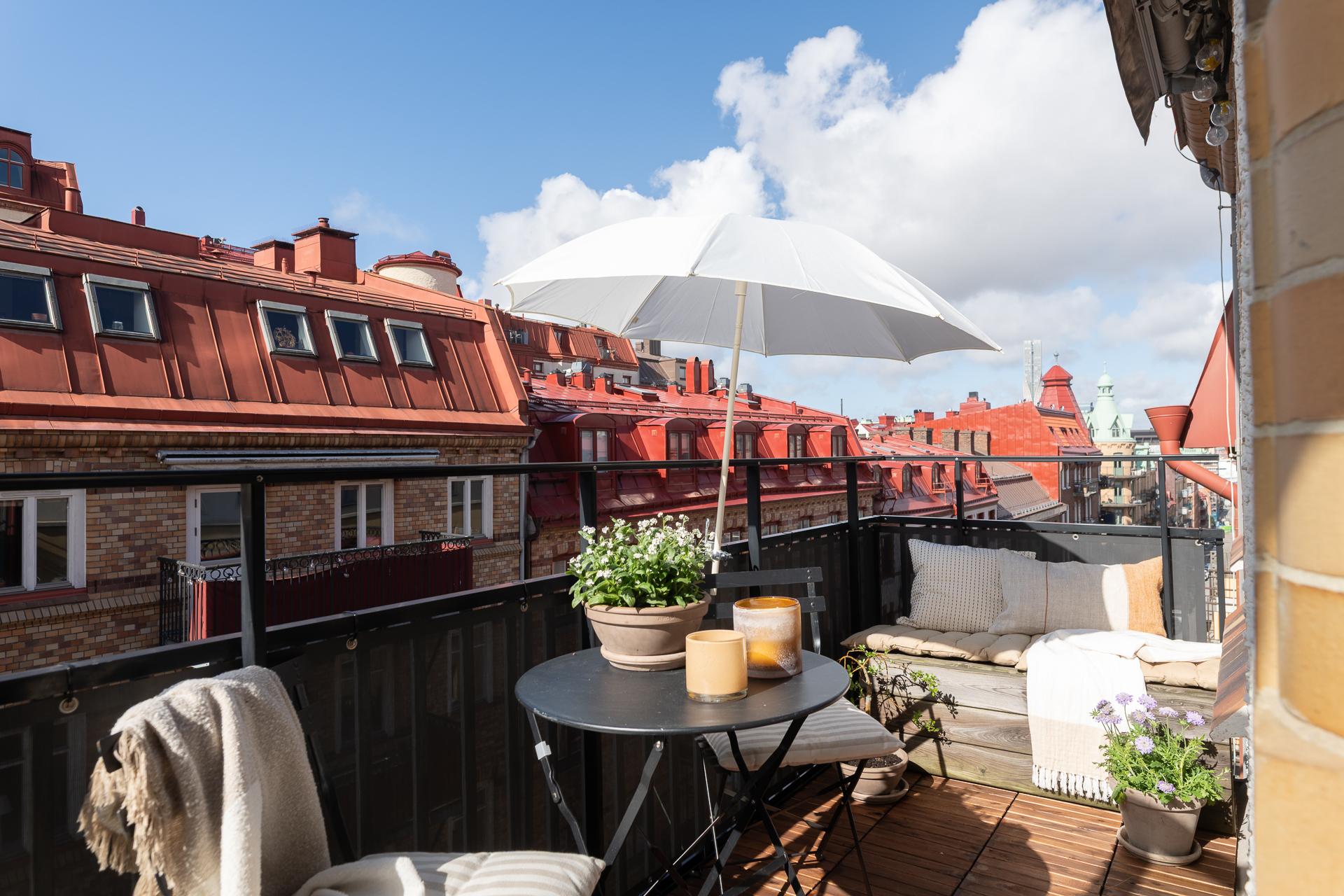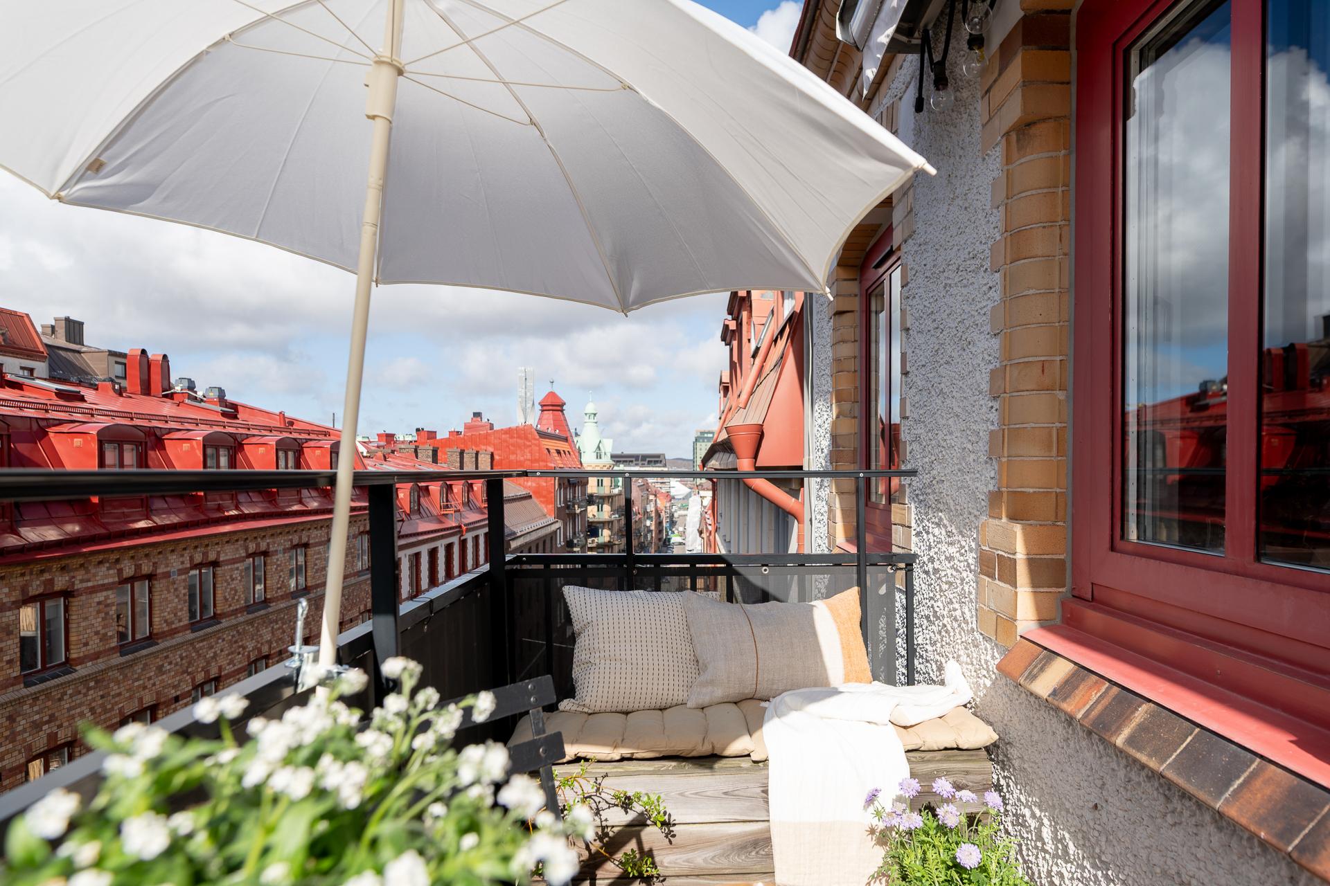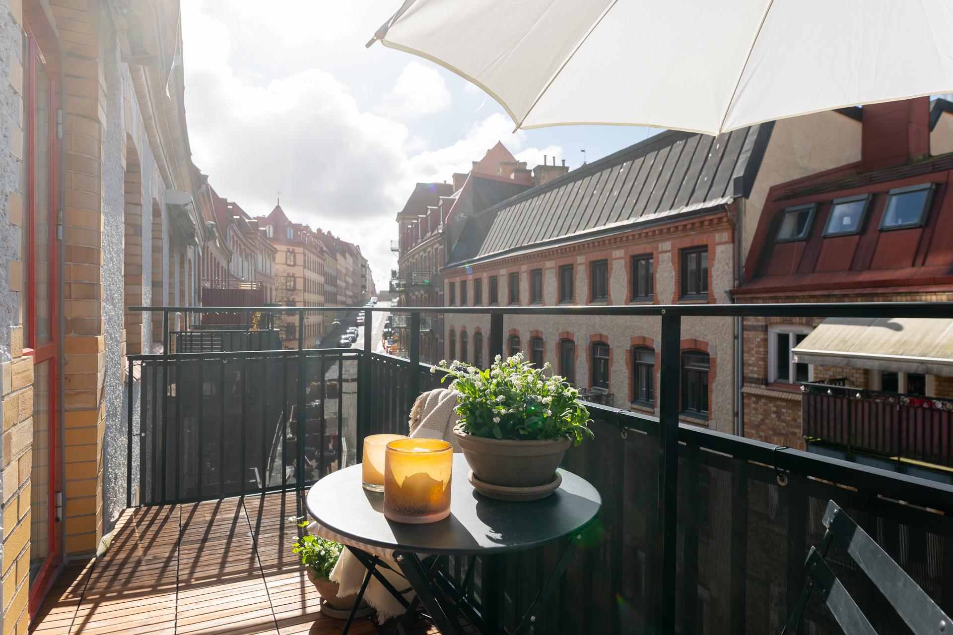Soldränkt och ytterst välplanerad sekelskiftestrea med stor västerbalkong och sol nästan hela dagen. Belägen högst upp i huset på vån 4 av 4 med utsikt hela vägen ner mot hamninloppet. Stora sociala ytor med öppen planlösning mellan vardagsrum och kök. Två sovrum in mot gården. Välskött Brf med betydande hyresintäkter och låga avgifter.