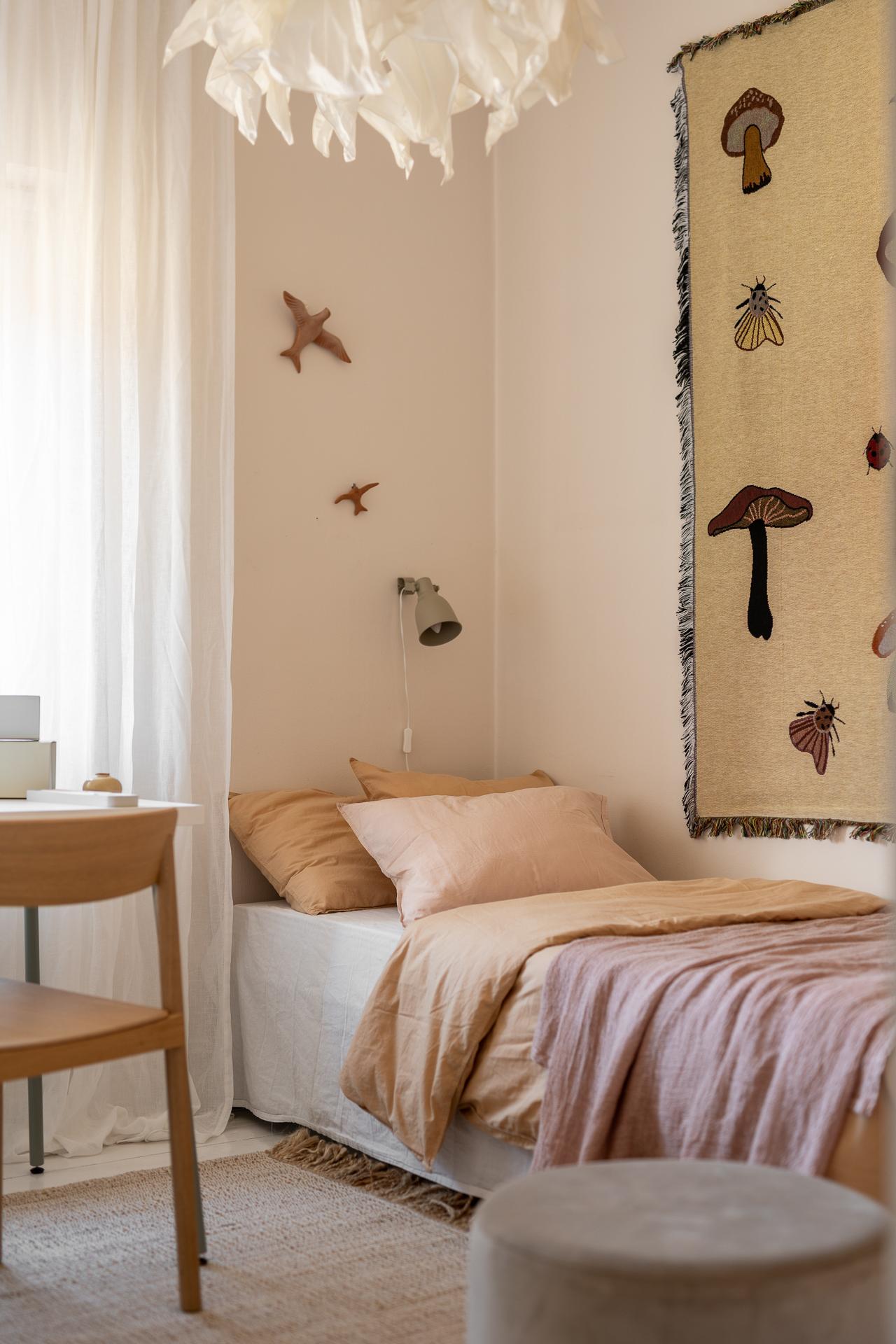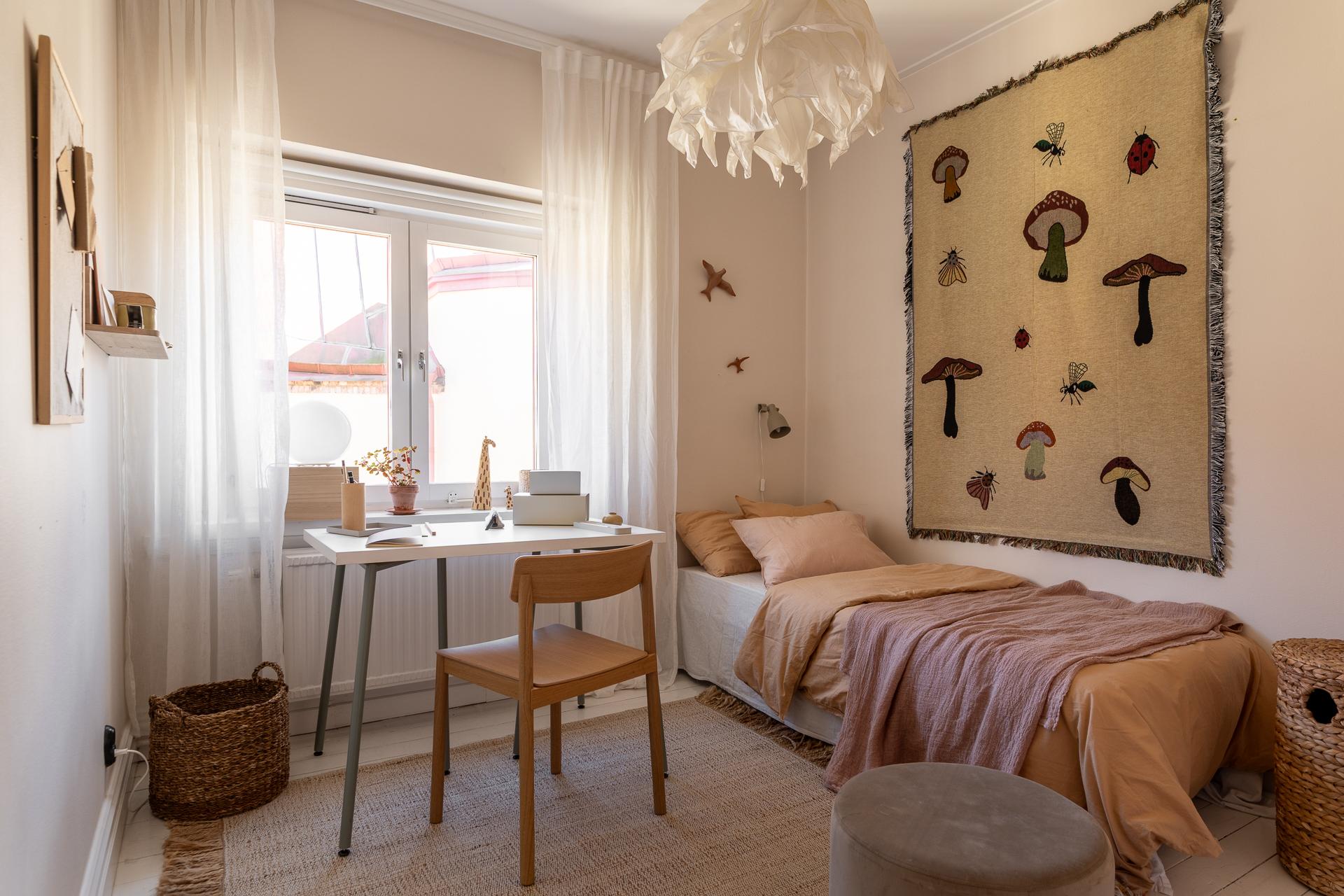 Det andra sovrummet, även detta stort nog för dubbelsäng, fungerar utmärkt som barnrum, gäst- och/eller arbetsrum. Knäpptyst gårdsläge även här och en ljus grund att inreda i form av vitmålat brädgolv och väggar målade i en blekt varm aprikos ton.