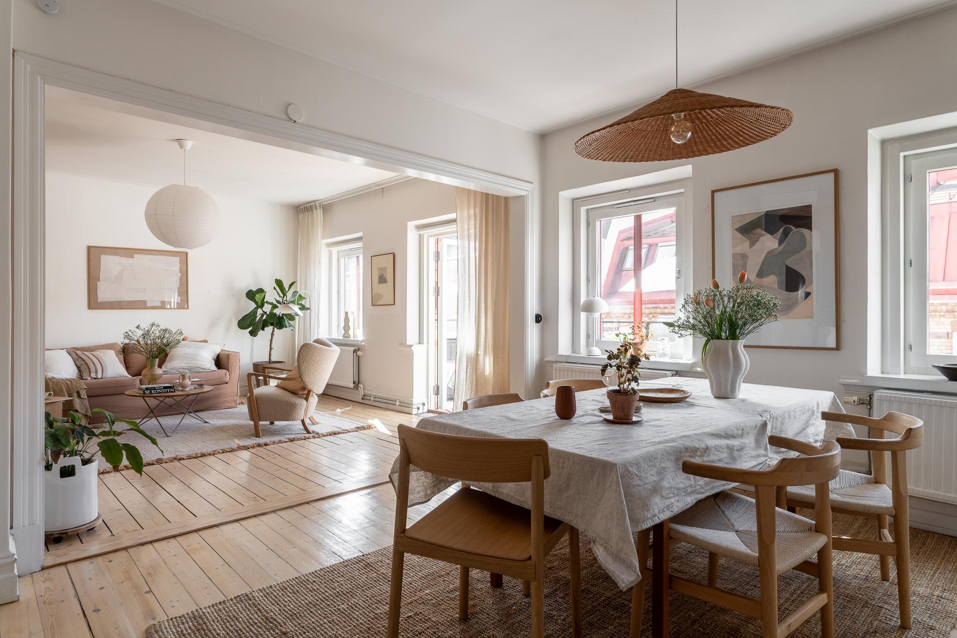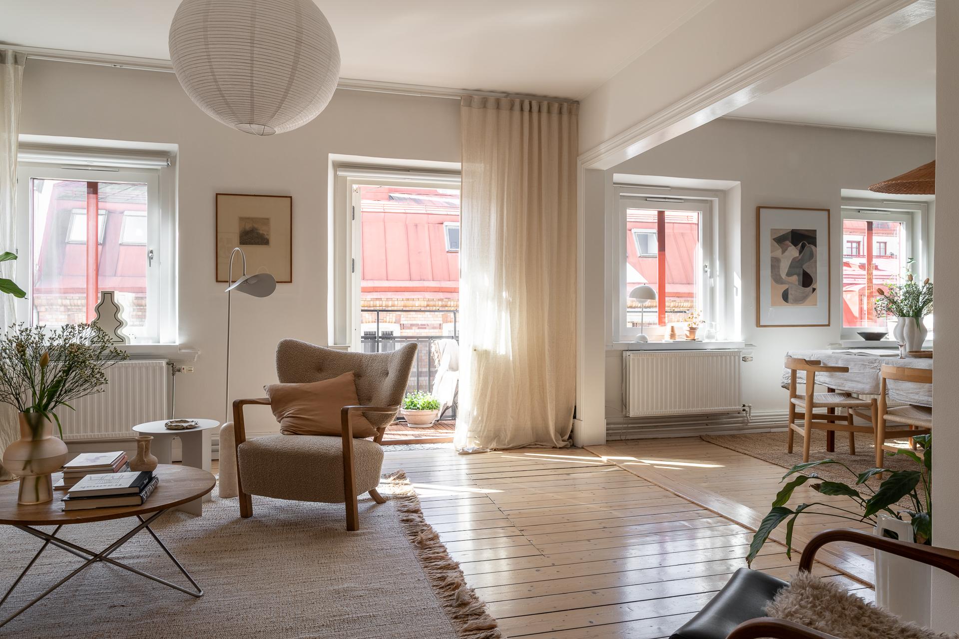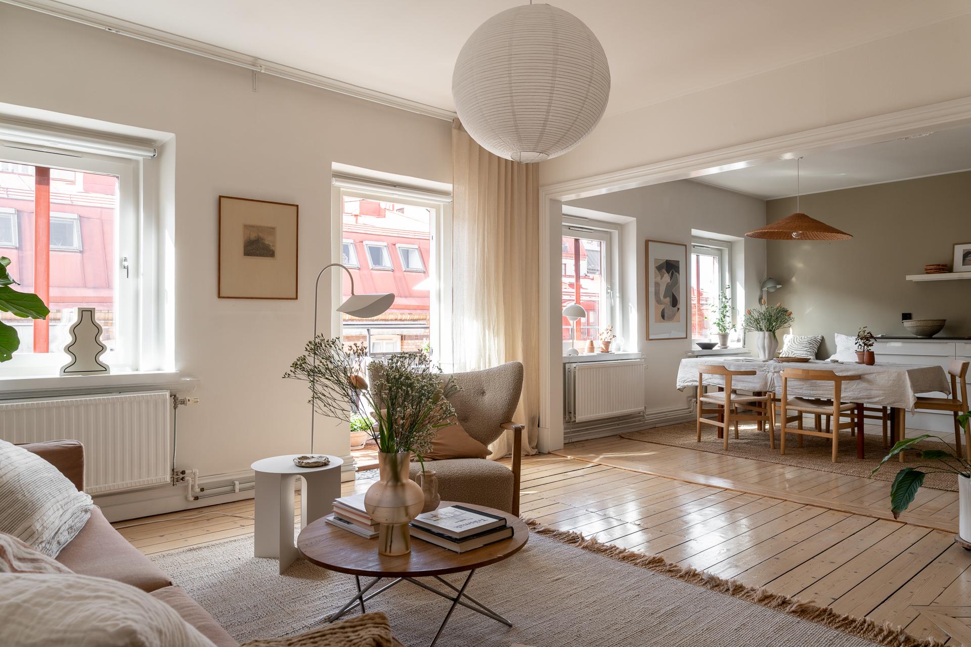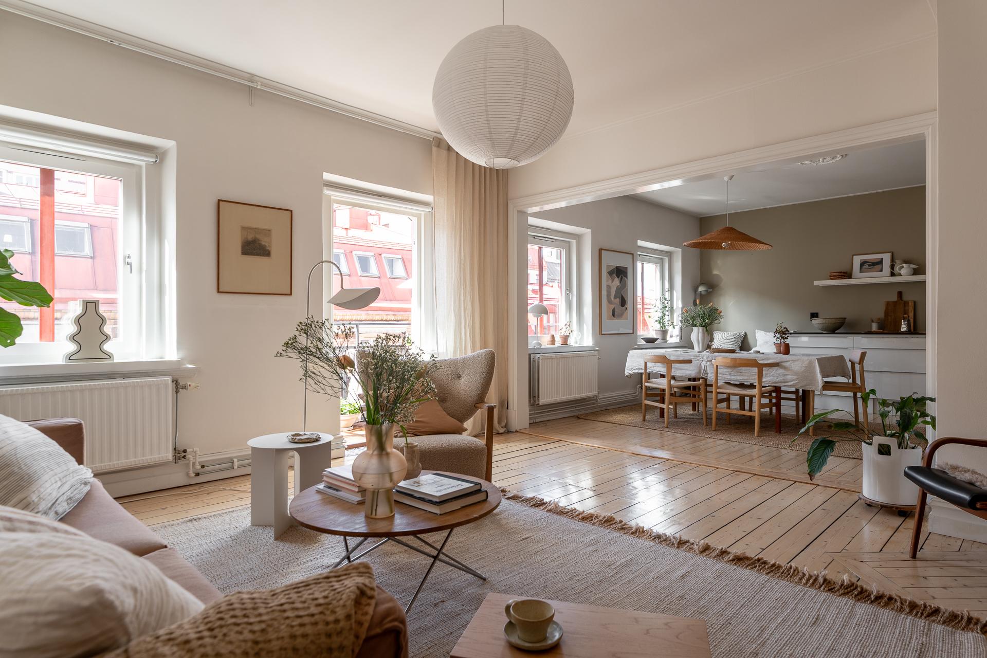 Den genomgående planlösningen med härliga fönsterpartier åt två väderstreck, det höga fria läget och den ljusa färgskalan gör sammantaget att lägenheten upplevs som otroligt ljus och luftig. Balkongen är väl tilltagen och ligger i ett attraktivt västerläge med sol i stort sett hela dagen och underbar utsikt. Den öppna planlösningen mellan vardagsrum och kök gör lägenheten till en social fullträff. Två lugna sovrum mot gården - båda med plats för dubbelsäng om så önskas. Detta är ett hem att verkligen förälska sig i!