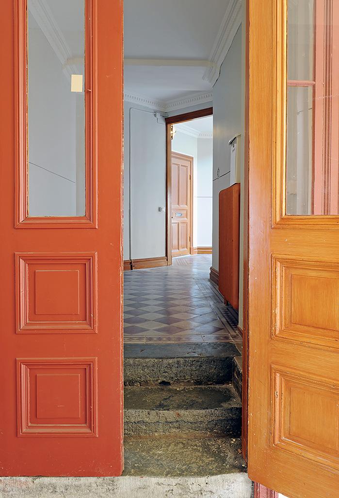 Via föreningens välskötta portgång och vackra trapphus, med tidstypiska kulörer, smidesdetaljer och bevarad stuckatur, nås lägenheten. Här möts du av en varm och omhändertagen atmosfär som speglar husets historia. Golvet inleds med praktisk klinker som övergår i genomgående brädgolv – en röd tråd genom hela bostaden. Här finns garderob och hatthylla, och från hallen nås badrummet till vänster och vardagsrummet rakt fram.
