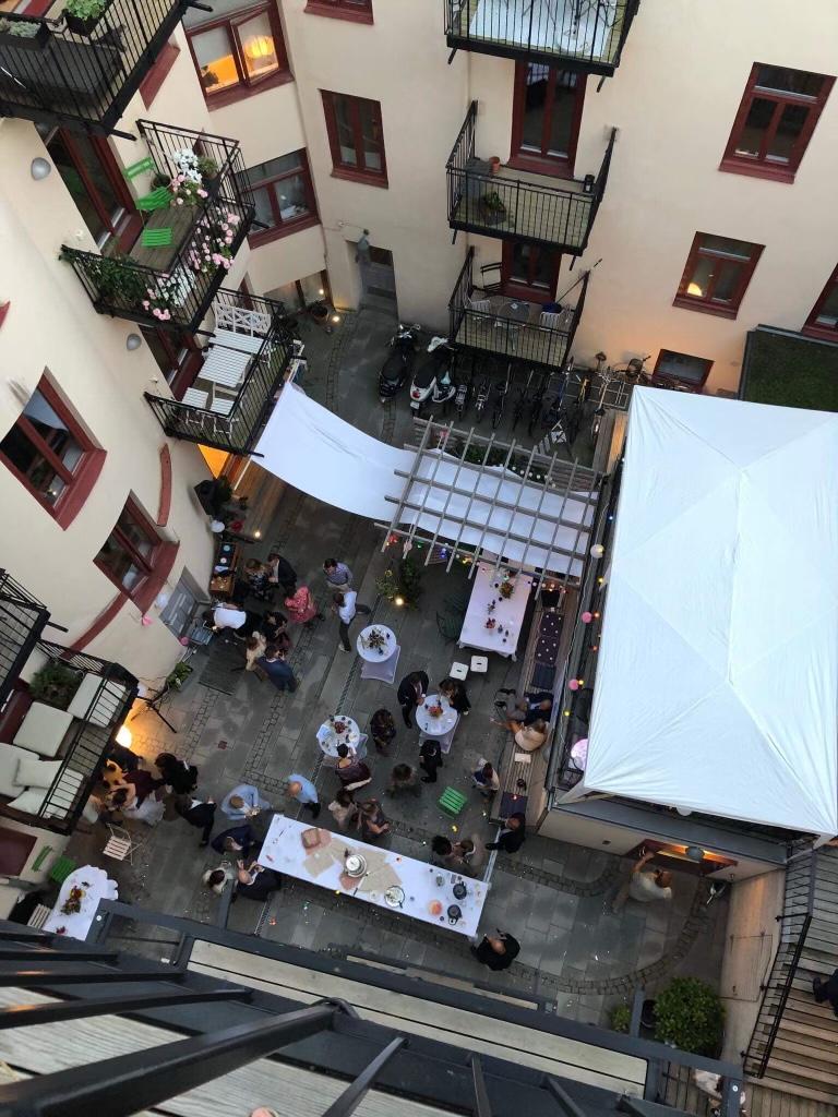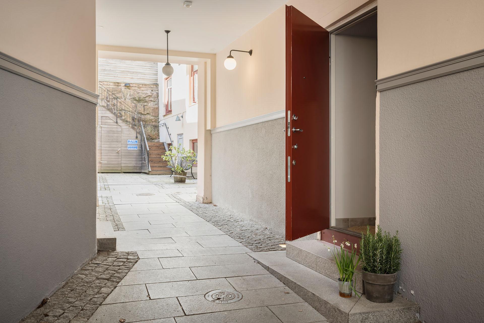Den omsorgsfullt renoverade innergården är en rofylld oas, ritad av trädgårdsarkitekt. Här möts du av vintergröna växter, vackra stenläggningar i bohuslänsk granit och en genomtänkt belysning som skapar en stämningsfull miljö kvällstid. På gårdshusets tak finns en solterrass med loungemöbler och matplats, och på markplan erbjuds en pergola med generösa sällskapsytor i sibirisk lärk.