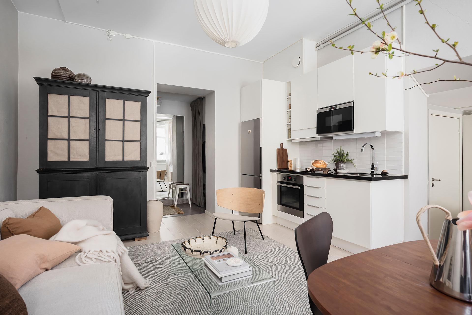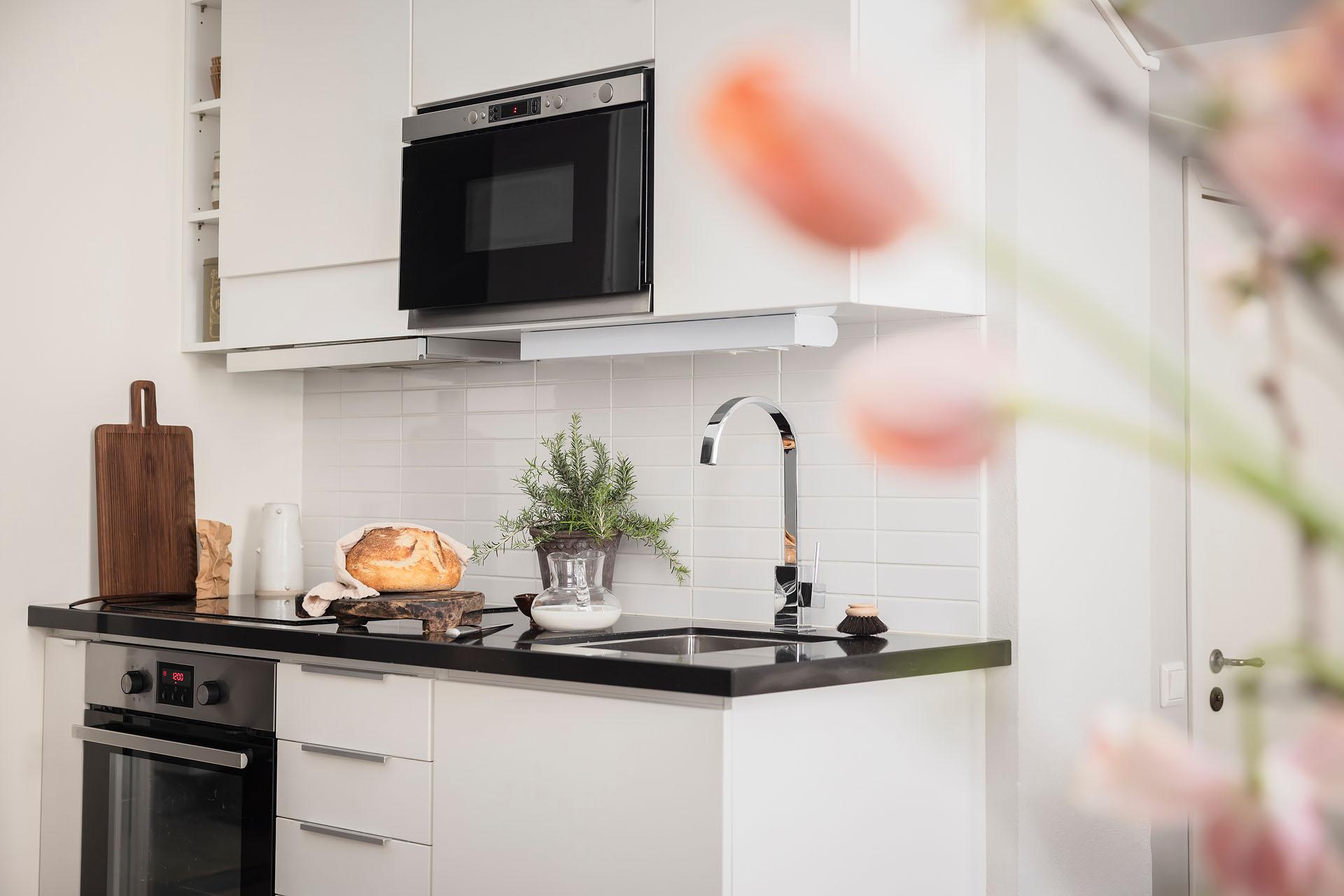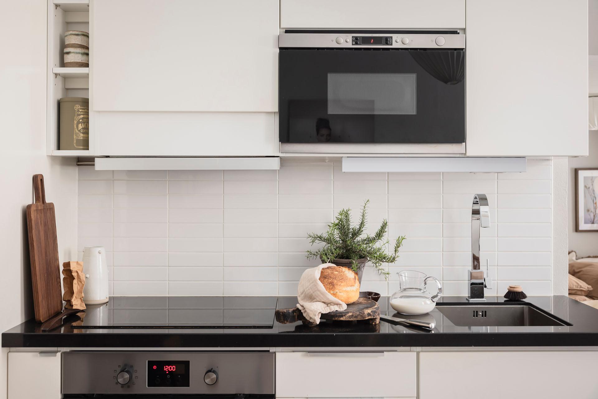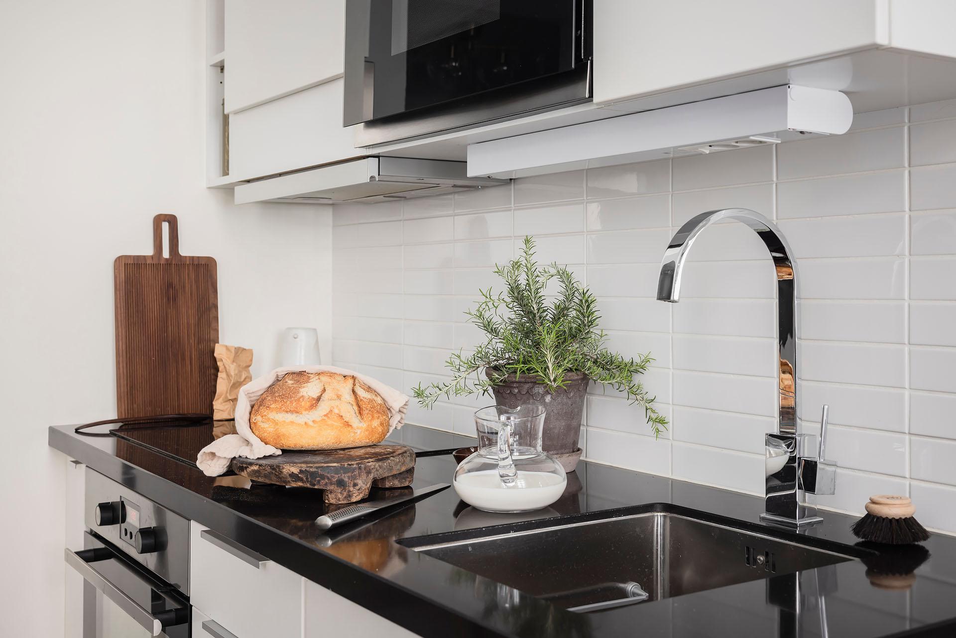 Socialt och öppet vardagsrum med generösa ytor och härlig takhöjd. De stora fönstren med djupa nischer ger ett fint ljusinsläpp. Här ryms enkelt både soffgrupp, matplats och förvaring. Köket är stilrent med vita luckor och mörk bänkskiva i sten och är utrustat med ugn, induktionshäll, diskmaskin, kolfilterfläkt samt kyl/frys.