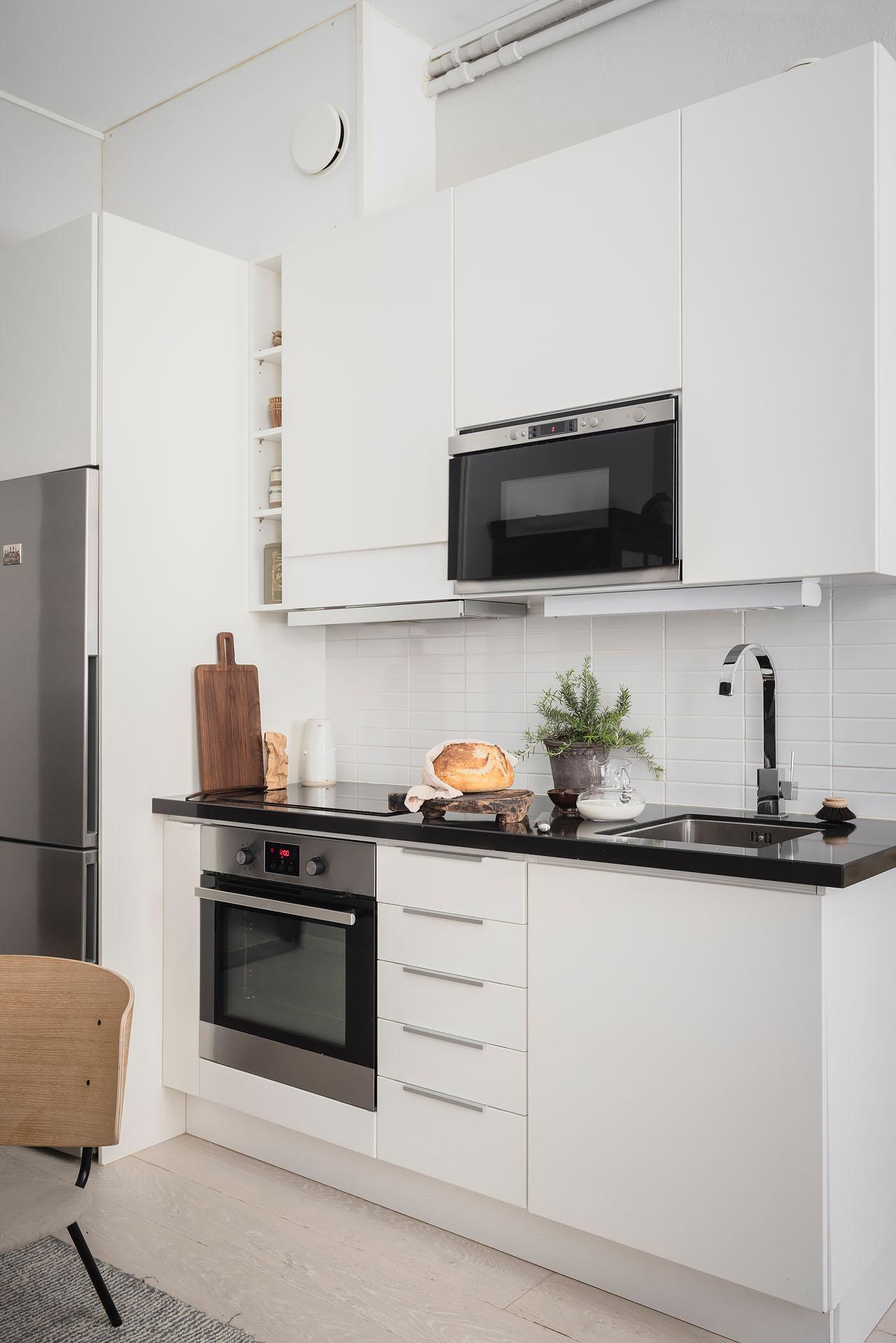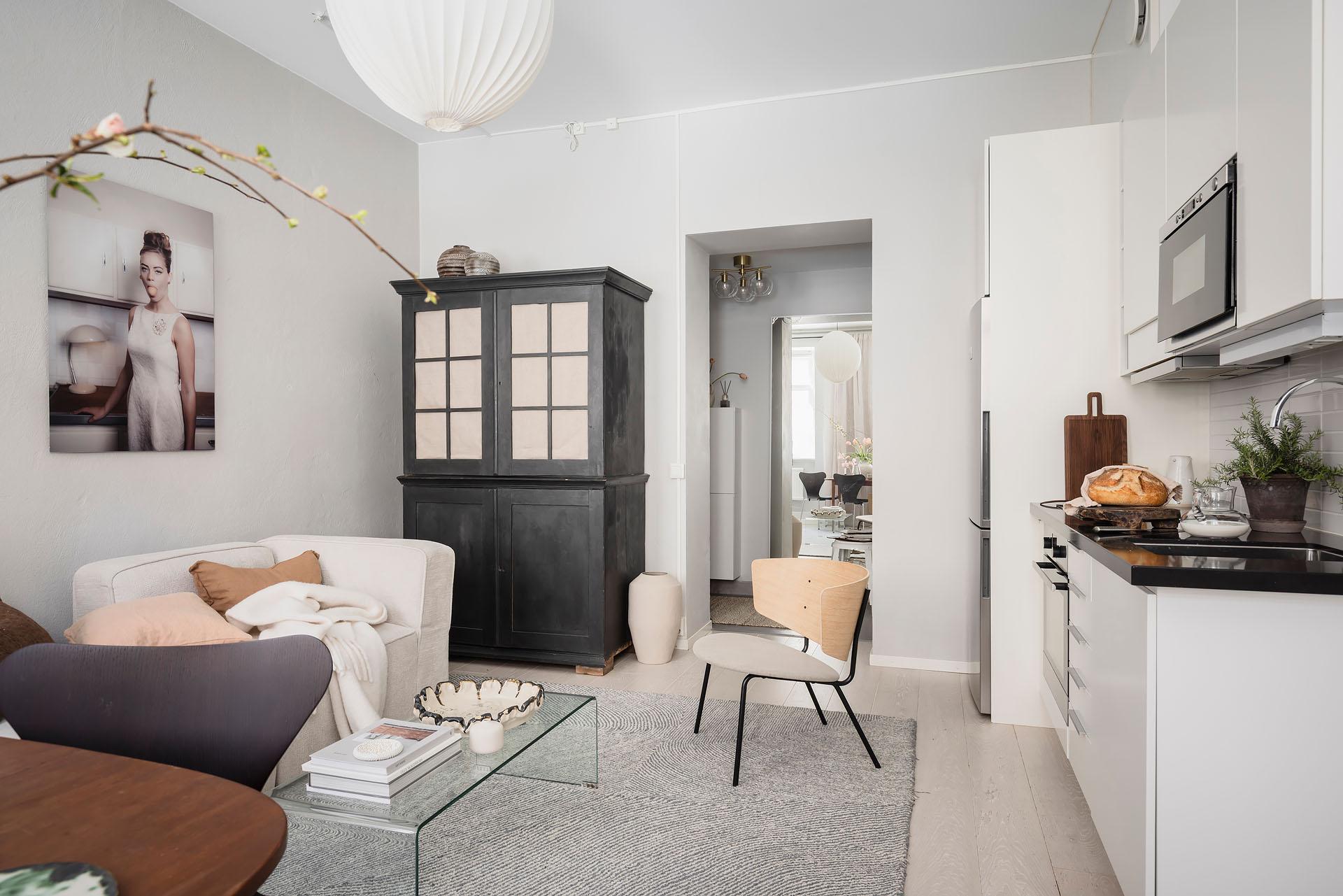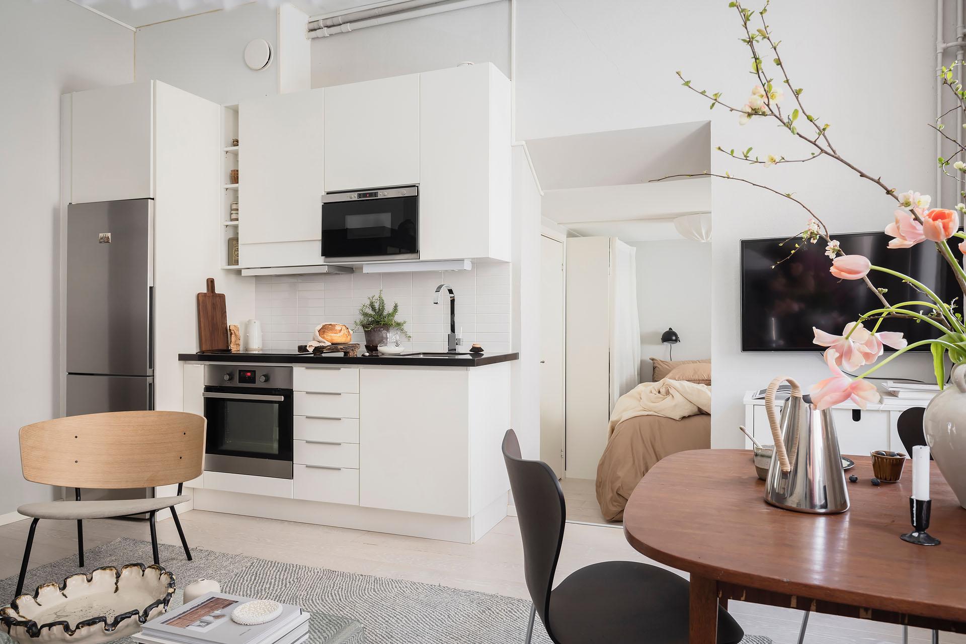 Socialt och öppet vardagsrum med generösa ytor och härlig takhöjd. De stora fönstren med djupa nischer ger ett fint ljusinsläpp. Här ryms enkelt både soffgrupp, matplats och förvaring. Köket är stilrent med vita luckor och mörk bänkskiva i sten och är utrustat med ugn, induktionshäll, diskmaskin, kolfilterfläkt samt kyl/frys.