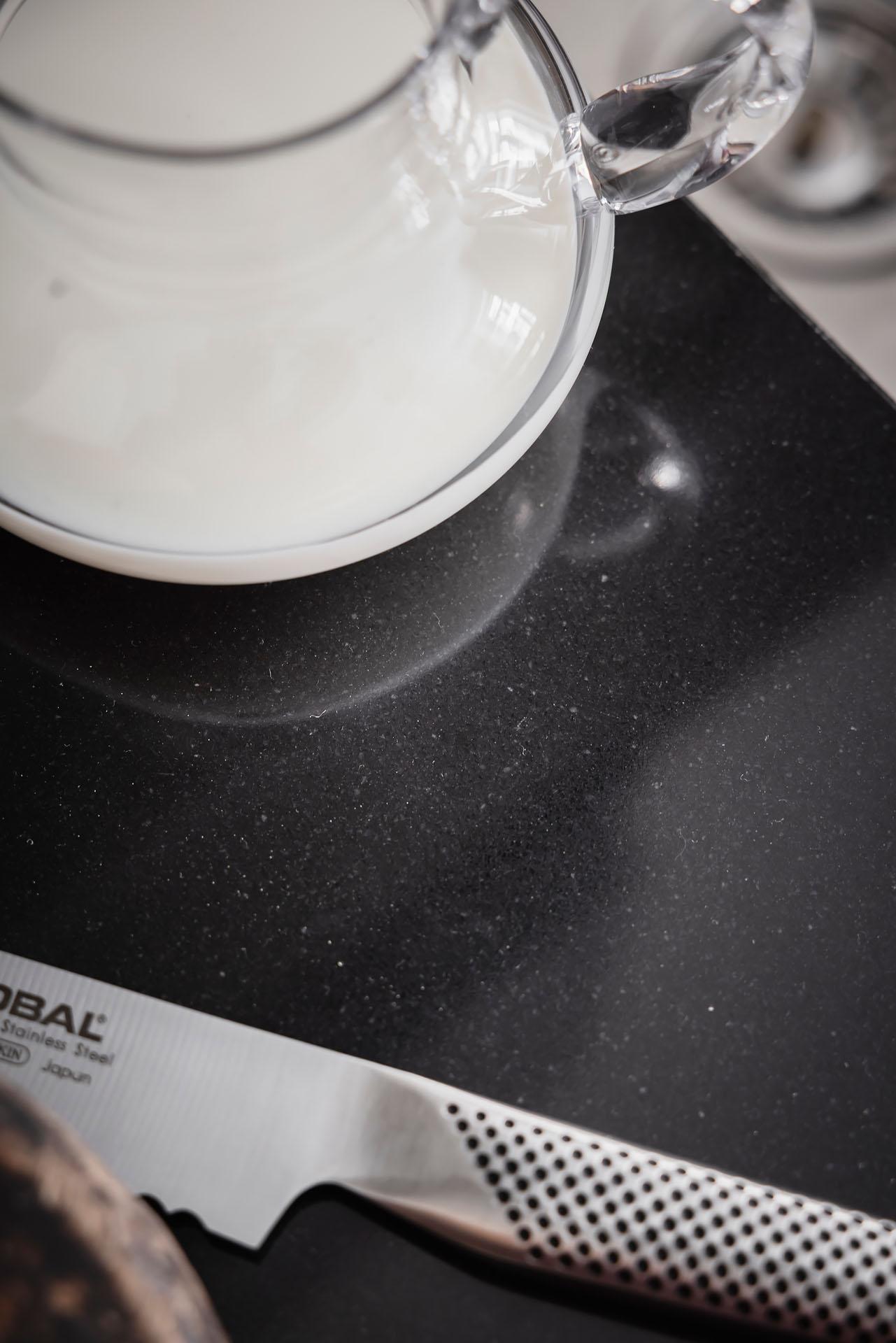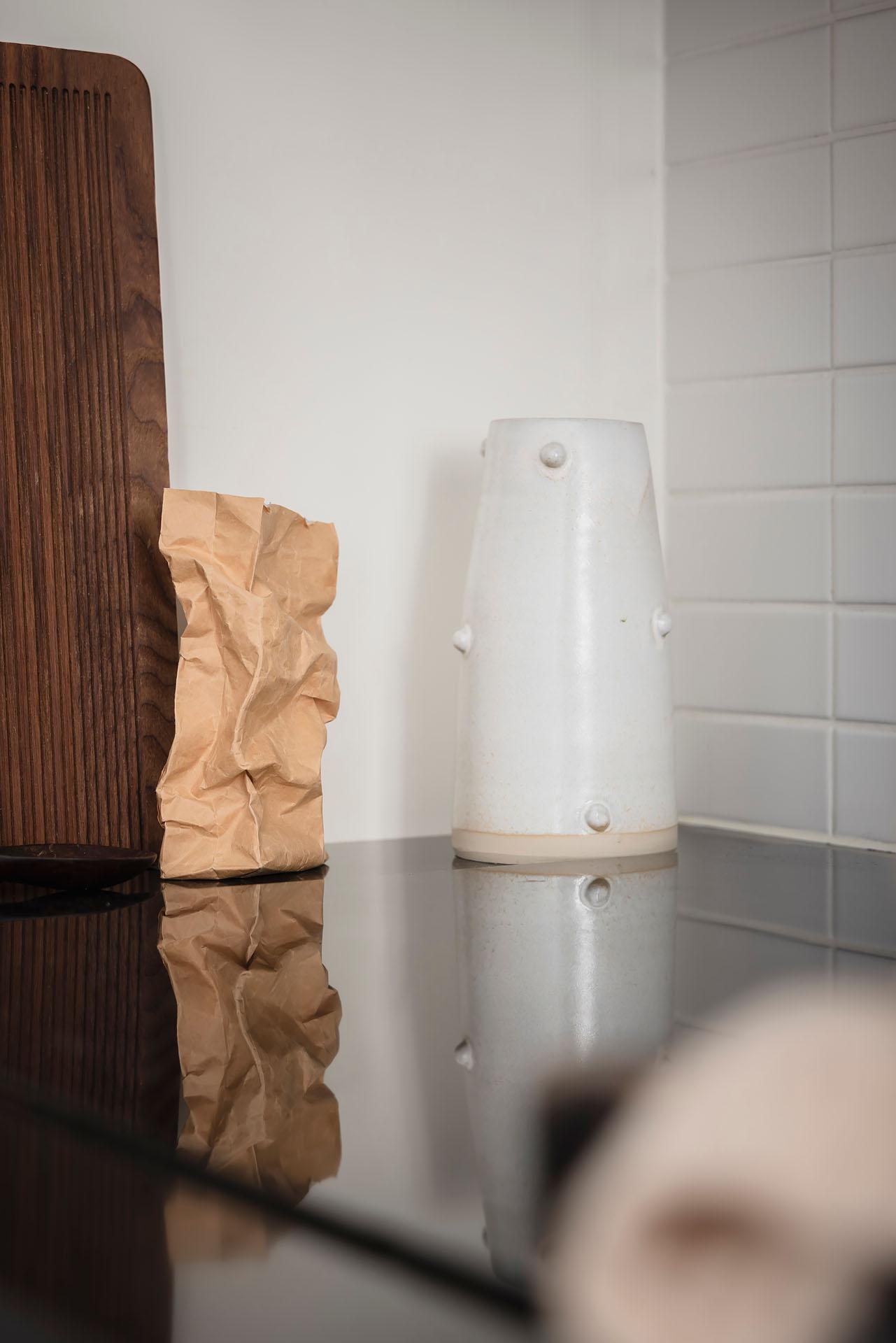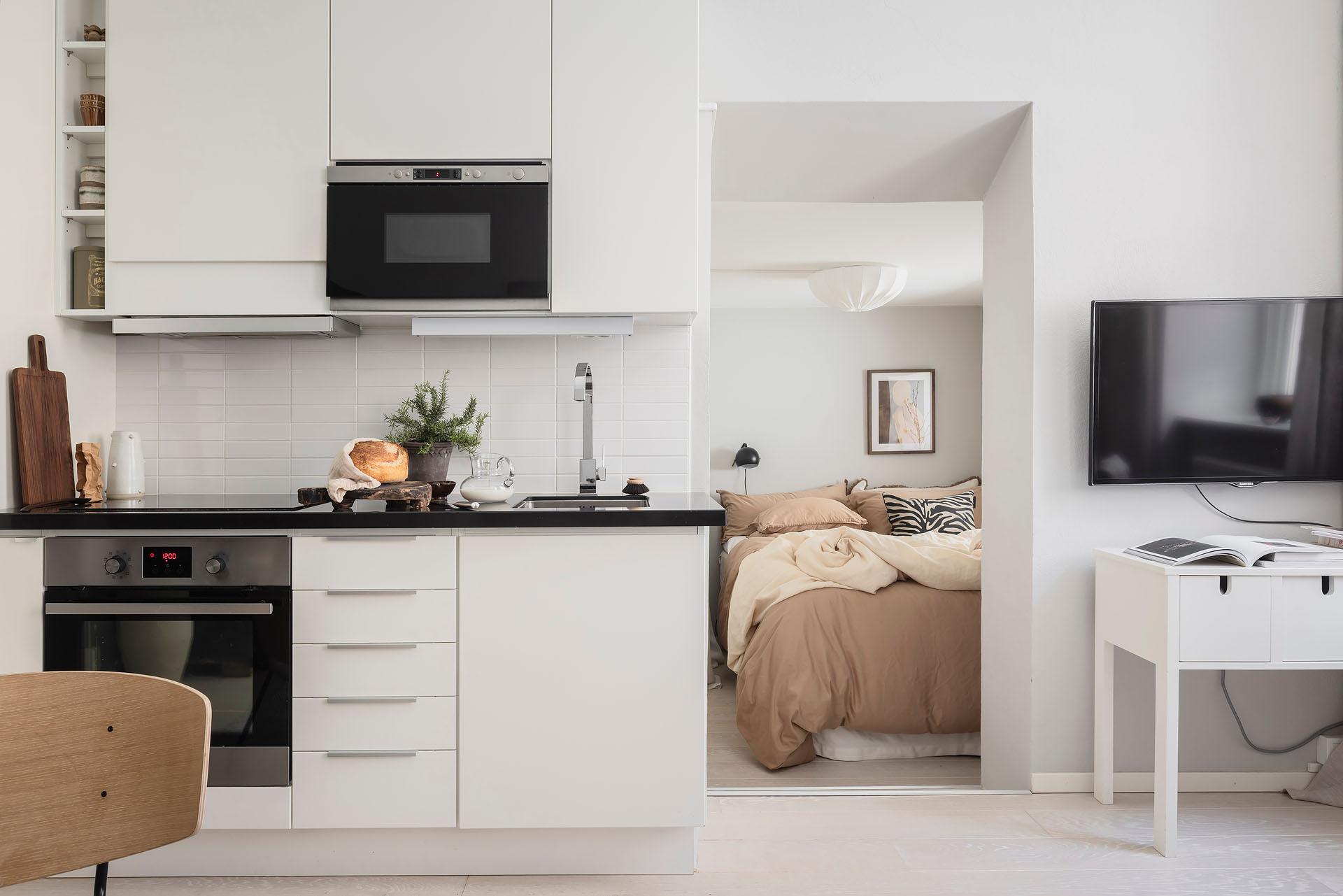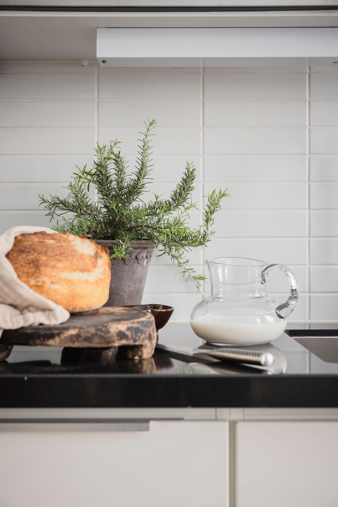 Socialt och öppet vardagsrum med generösa ytor och härlig takhöjd. De stora fönstren med djupa nischer ger ett fint ljusinsläpp. Här ryms enkelt både soffgrupp, matplats och förvaring. Köket är stilrent med vita luckor och mörk bänkskiva i sten och är utrustat med ugn, induktionshäll, diskmaskin, kolfilterfläkt samt kyl/frys.