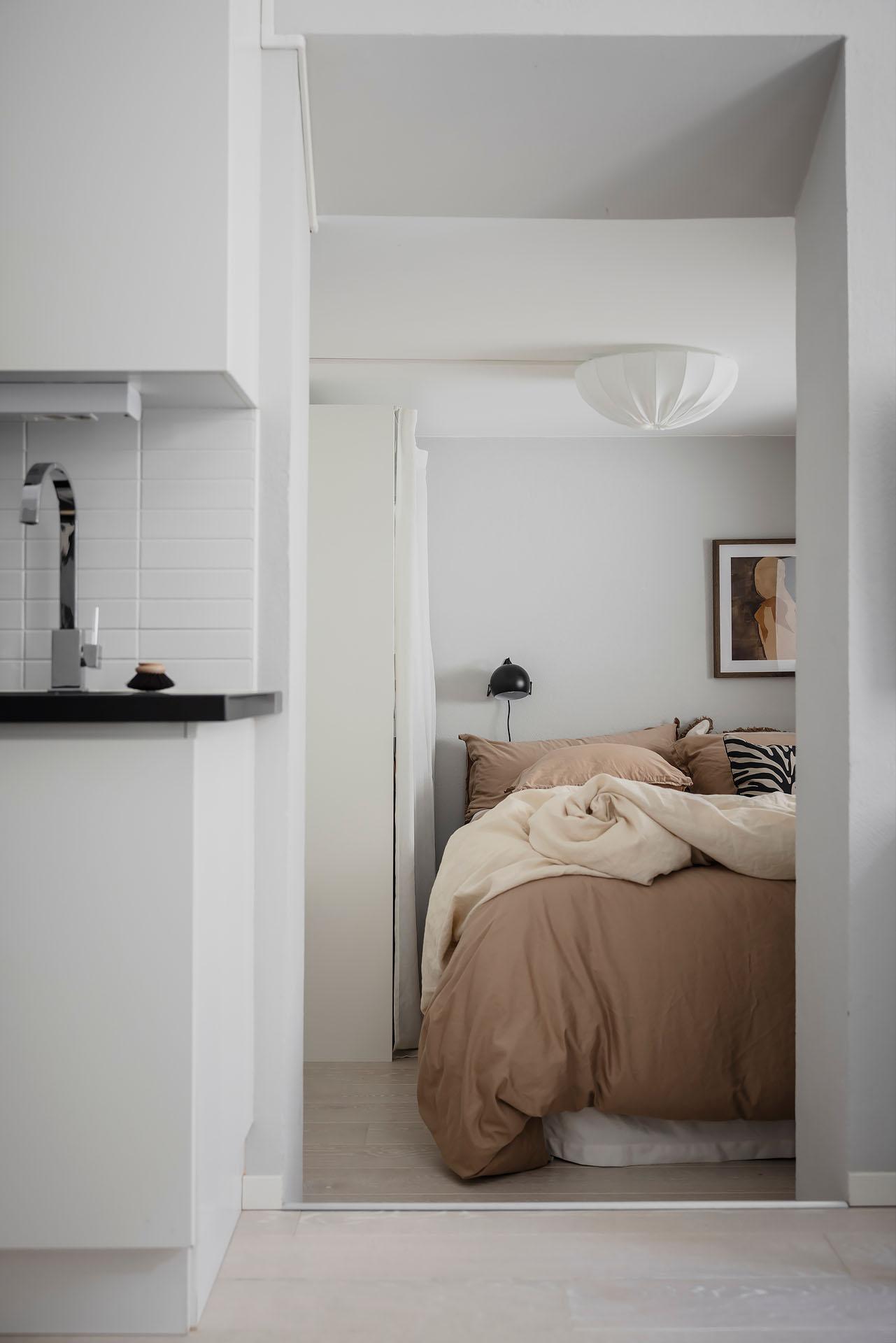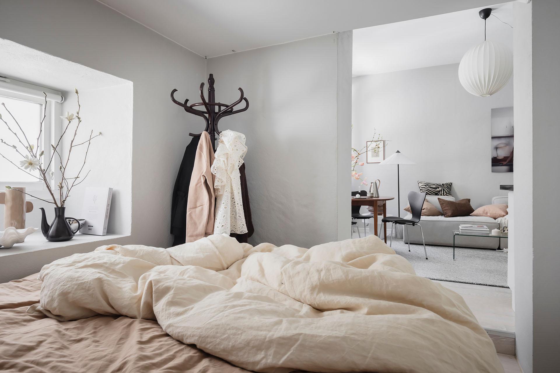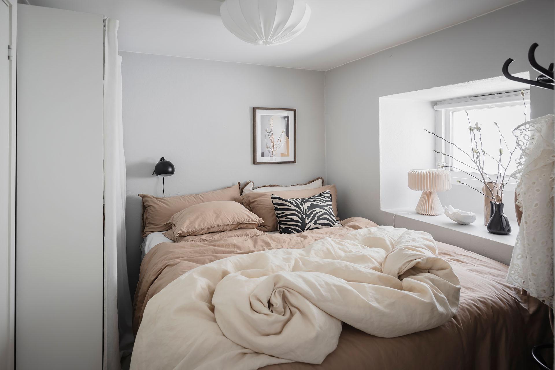 Lugnt och rogivande sovrum med plats för en 160 cm bred säng, nattduksbord och förvaring. Fönster ger ett behagligt ljusinsläpp.