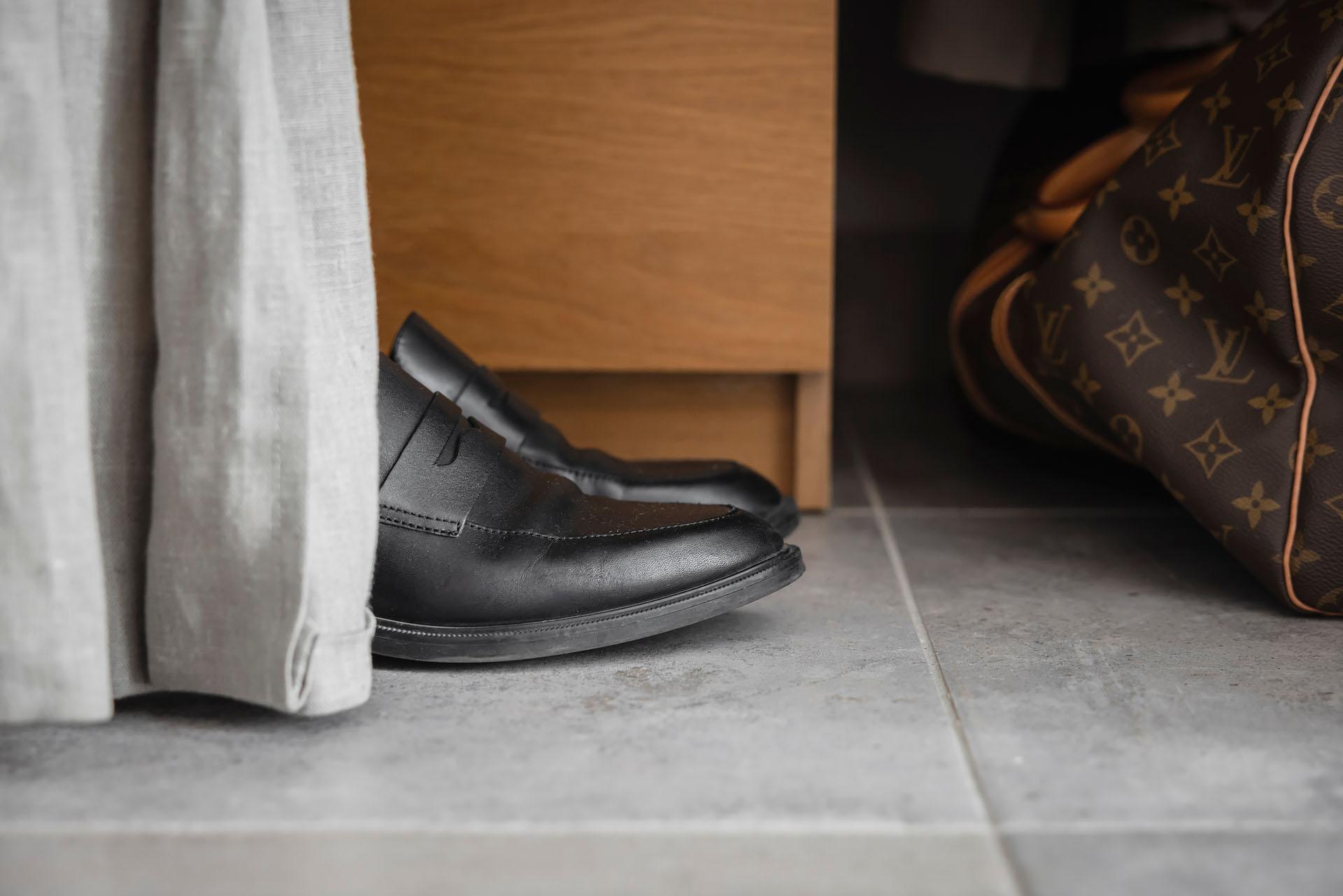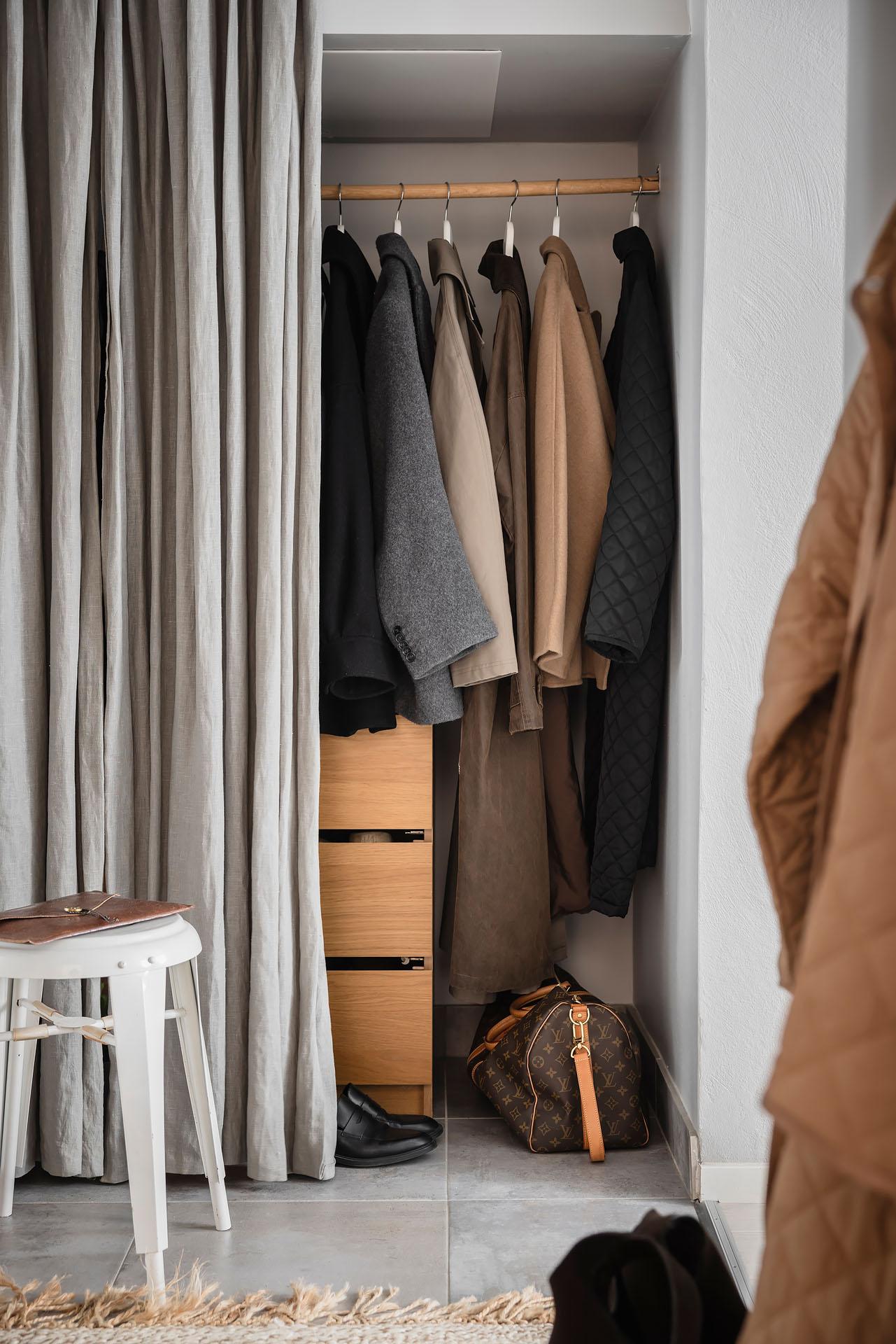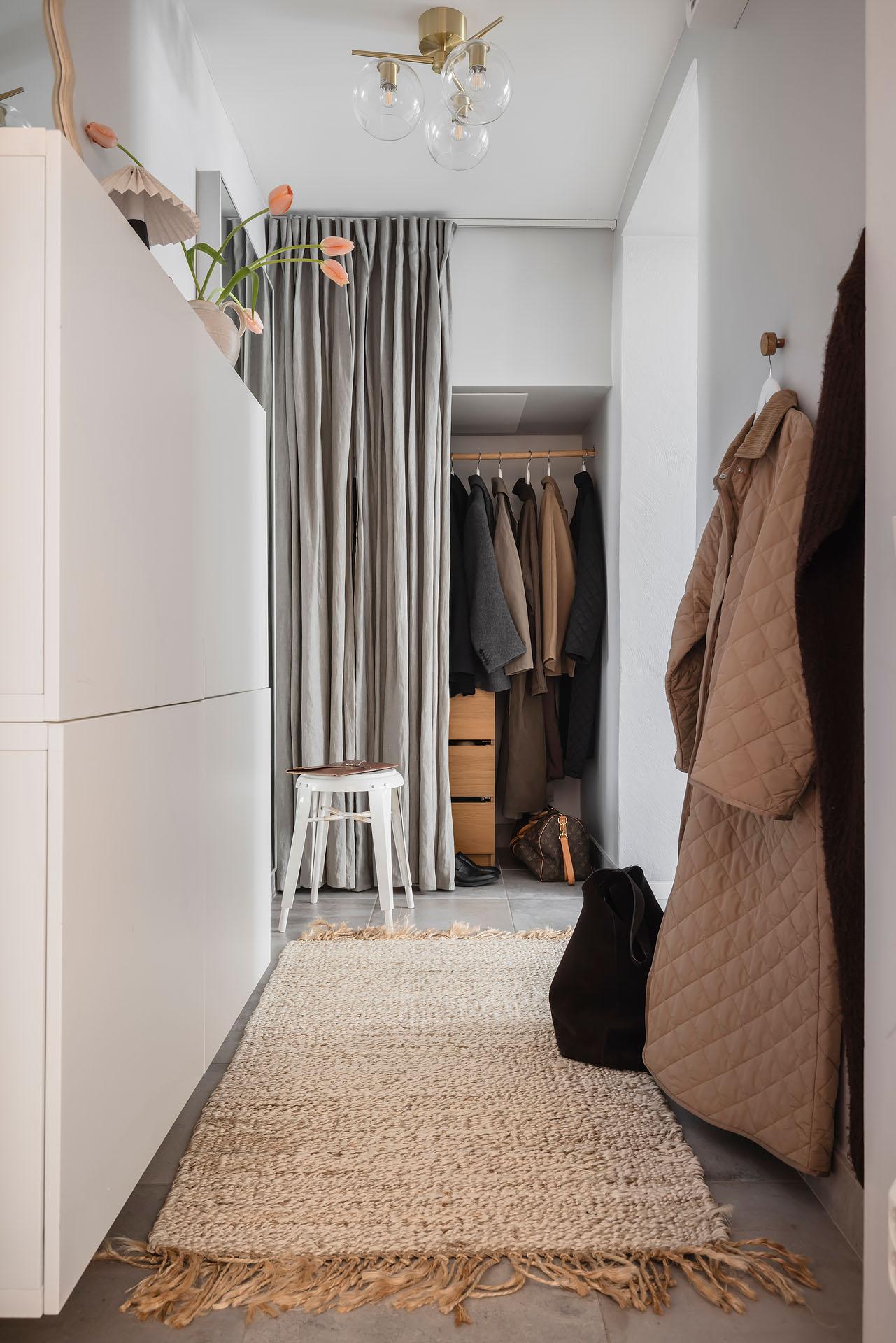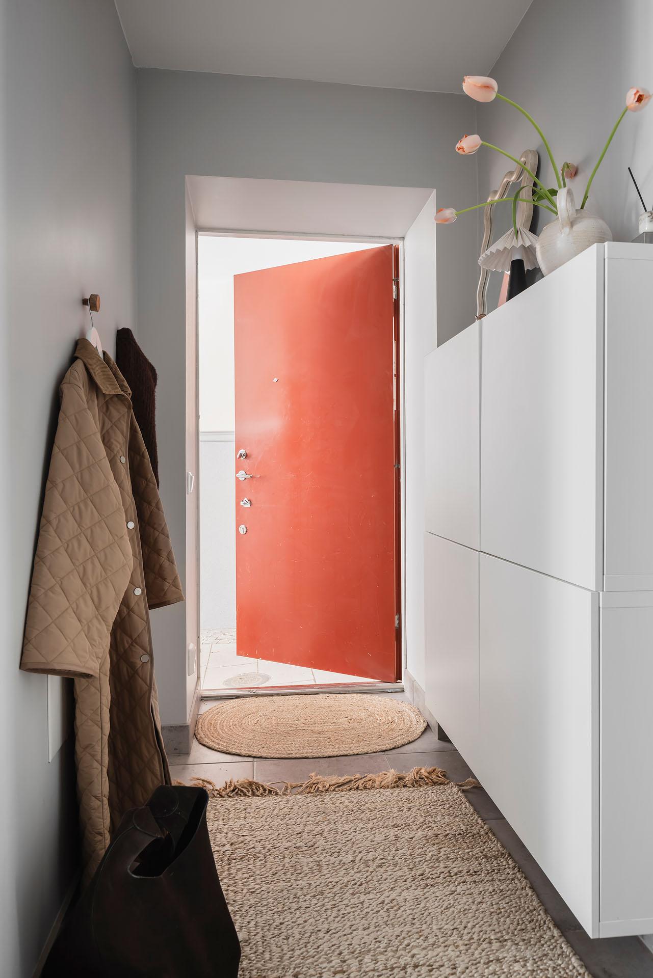 Välkomnande hall med plats för avhängning samt garderob för förvaring. Väggarna är målade i en varm grå nyans och det slitstarka plankgolvet löper tröskelfritt vidare in i bostaden. Här finns även utrymme för hallmöbel och spegel.