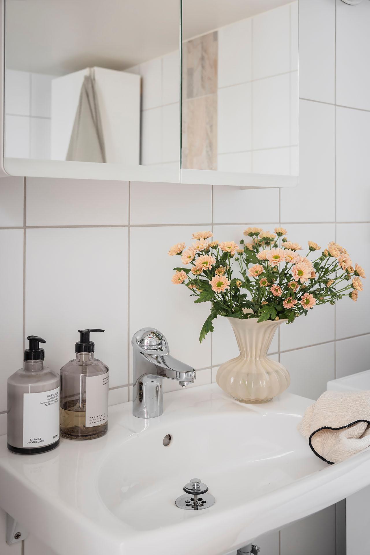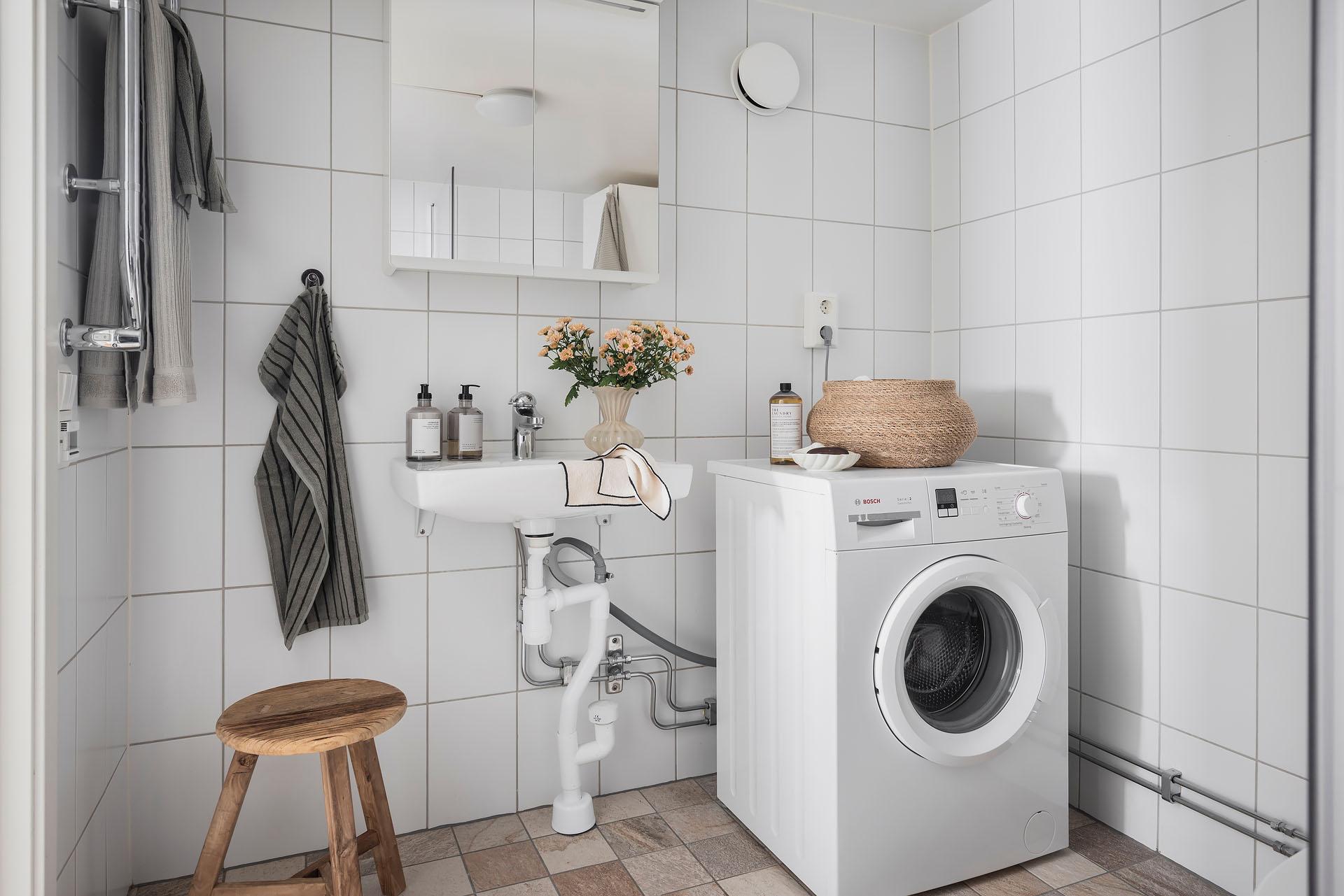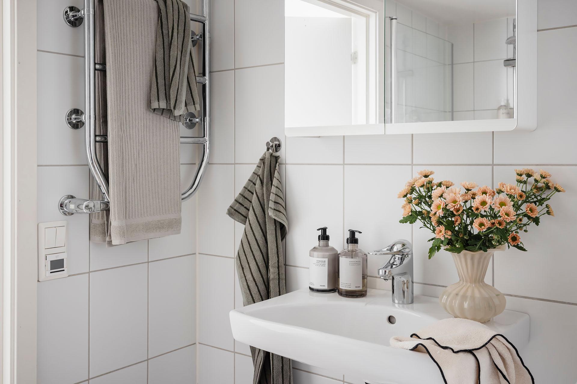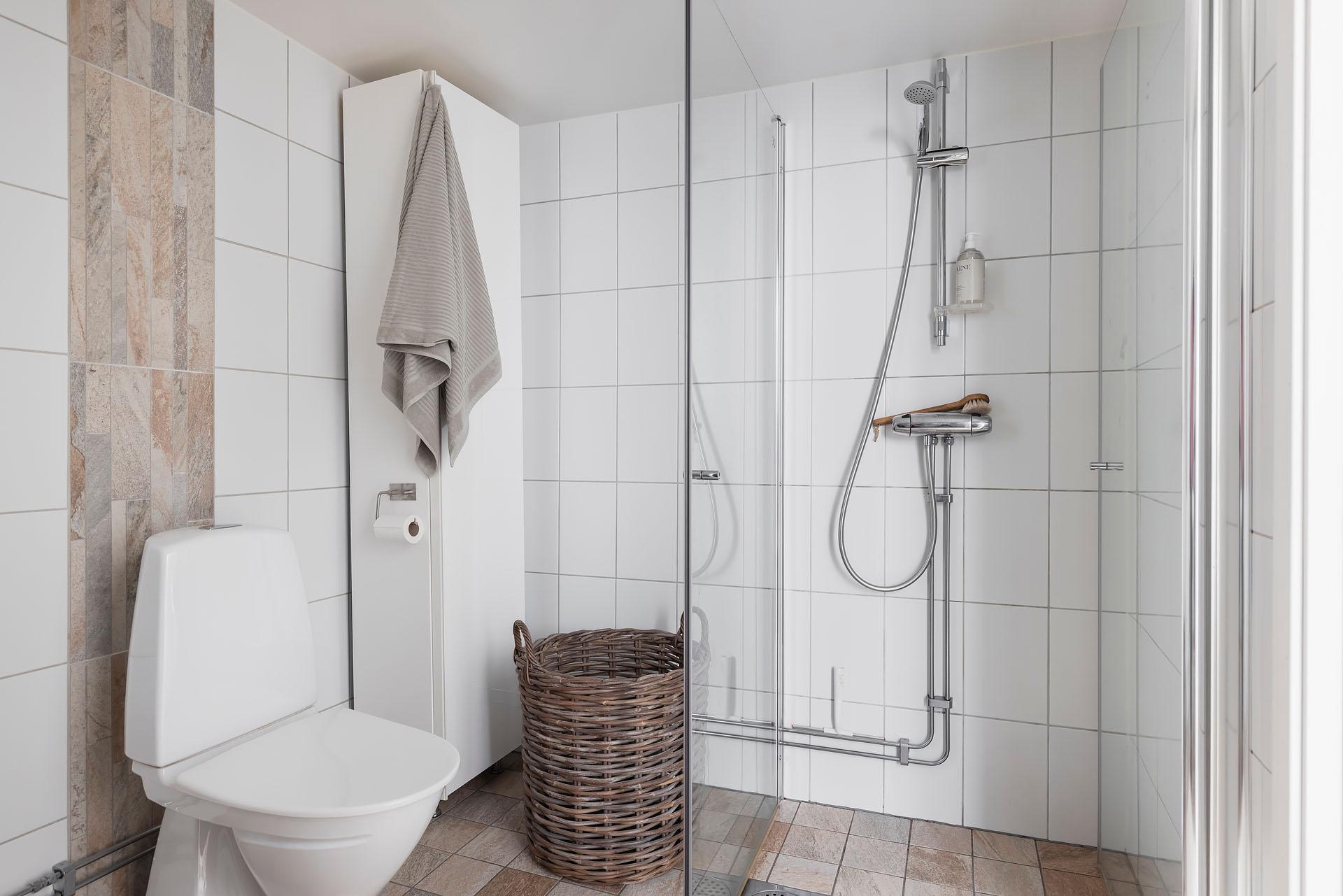Rymligt badrum med klassiska och tidlösa materialval. Beige klinkergolv med golvvärme och helkaklade vita väggar. Utrustat med dusch med vikbara glasväggar, handfat, spegelskåp, WC samt tvättmaskin.