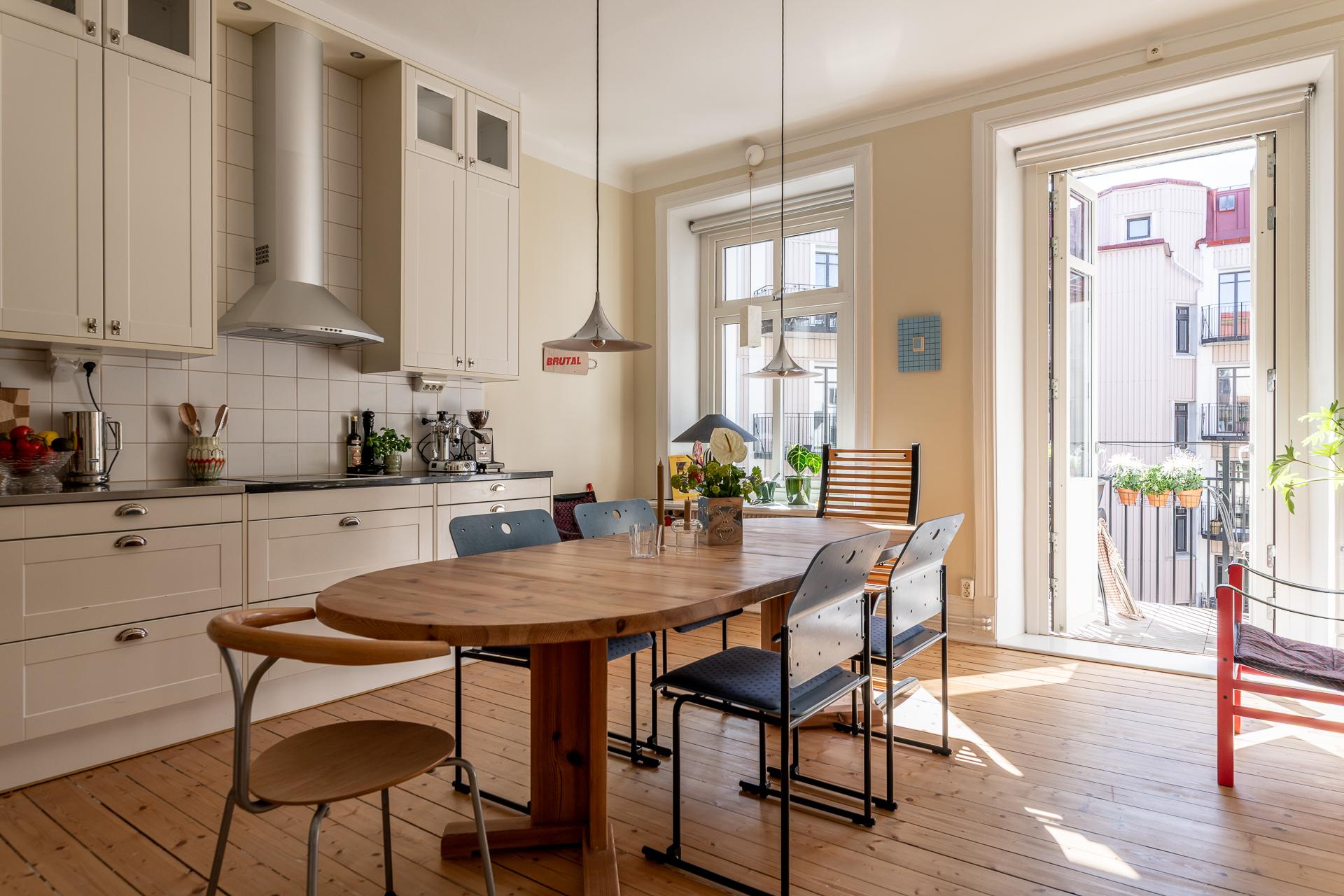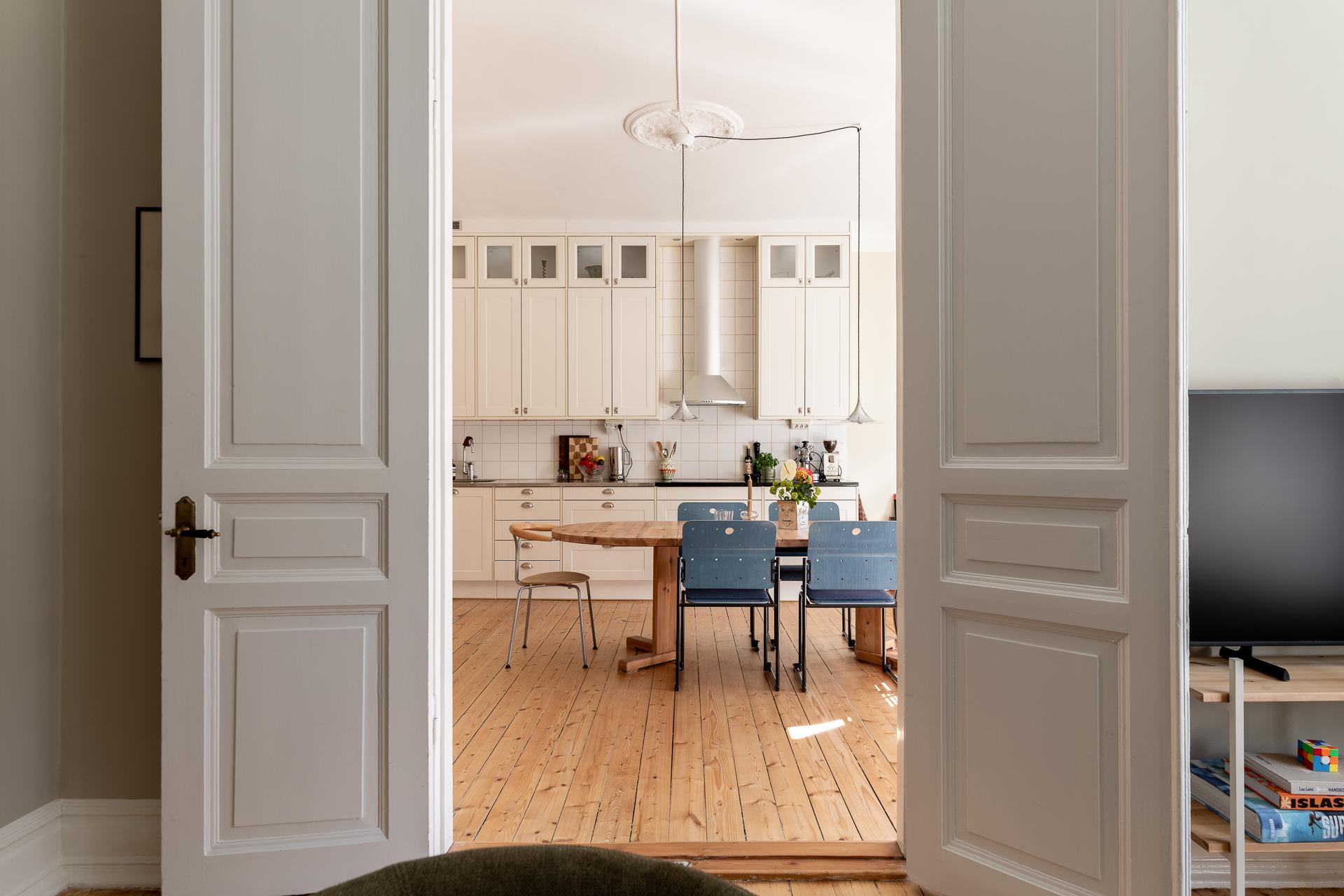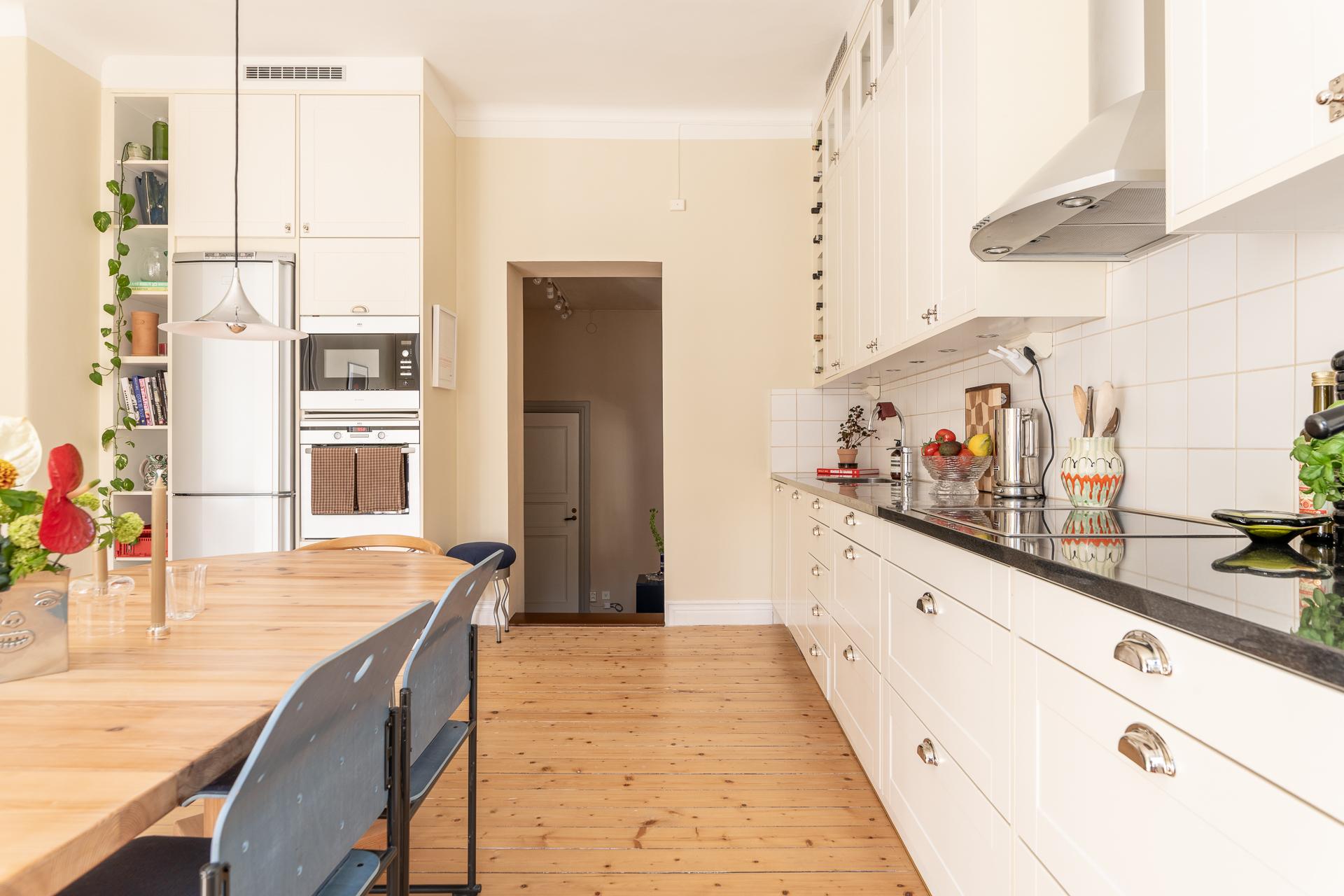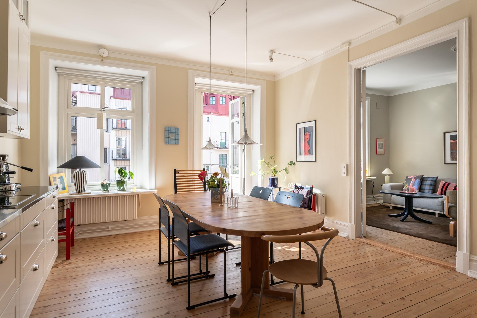 Köket och vardagsrummet ligger i fil, elegant placerade några trappsteg upp från hallen, vilket skapar en subtil och spännande nivåindelning. Den breda öppningen mellan rummen ger en känsla av öppen planlösning, samtidigt som de vackra parspegeldörrarna gör det möjligt att stänga till när så önskas. I köket finns gott om plats för stora middagar med vänner och familj – här ryms utan problem ett långbord för tio personer. Under varmare månader blir den rymliga balkongen en naturlig förlängning av rummet, perfekt för både livliga middagar och stilla stunder i eftermiddags- och kvällssolen. Arbetsytorna är generösa och förvaringen välplanerad, med överskåp som nyttjar den imponerande takhöjden. Det framtagna originalgolvet i brädor ger karaktär, och ovanför tronar en vacker takrosett.