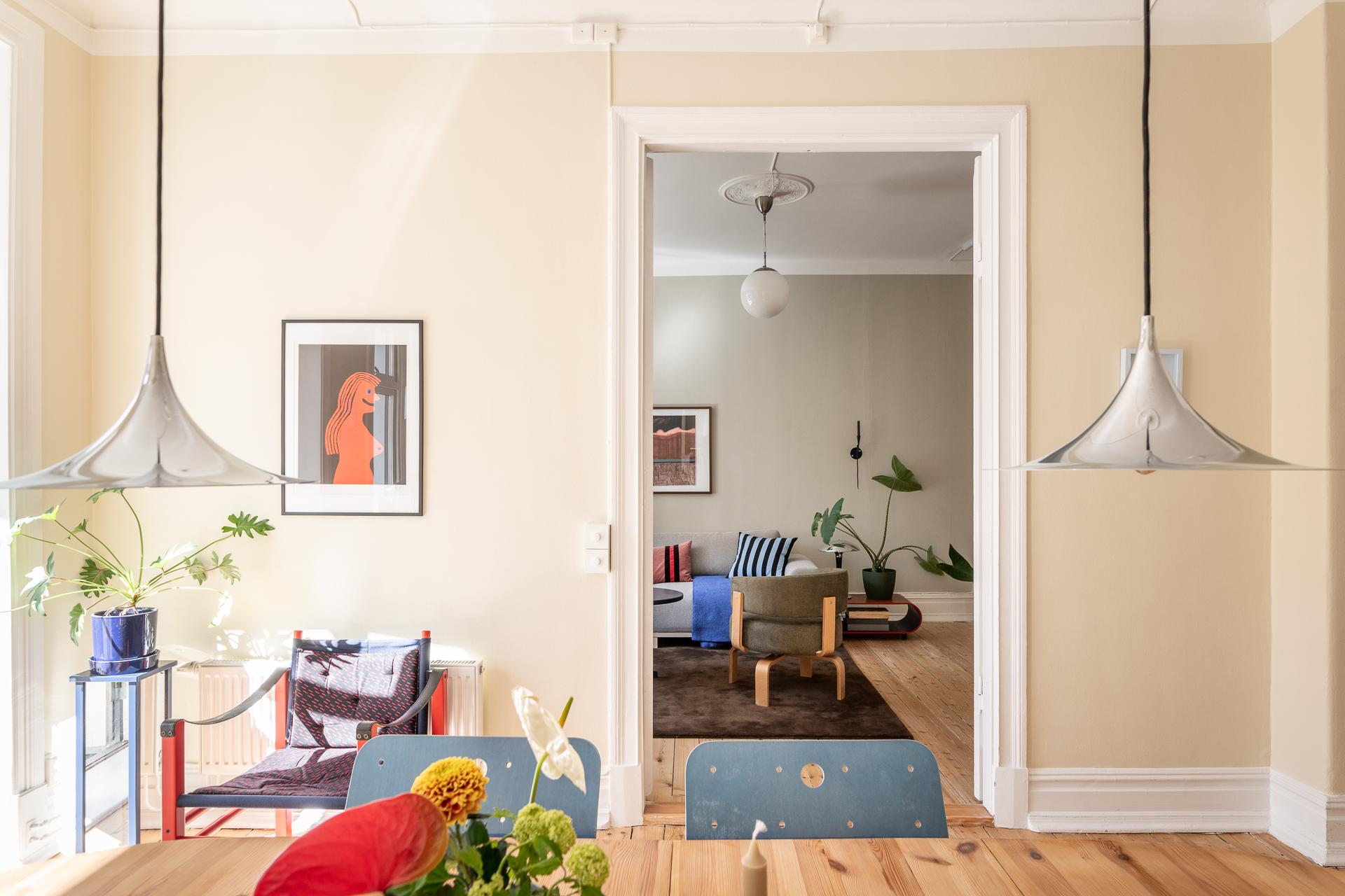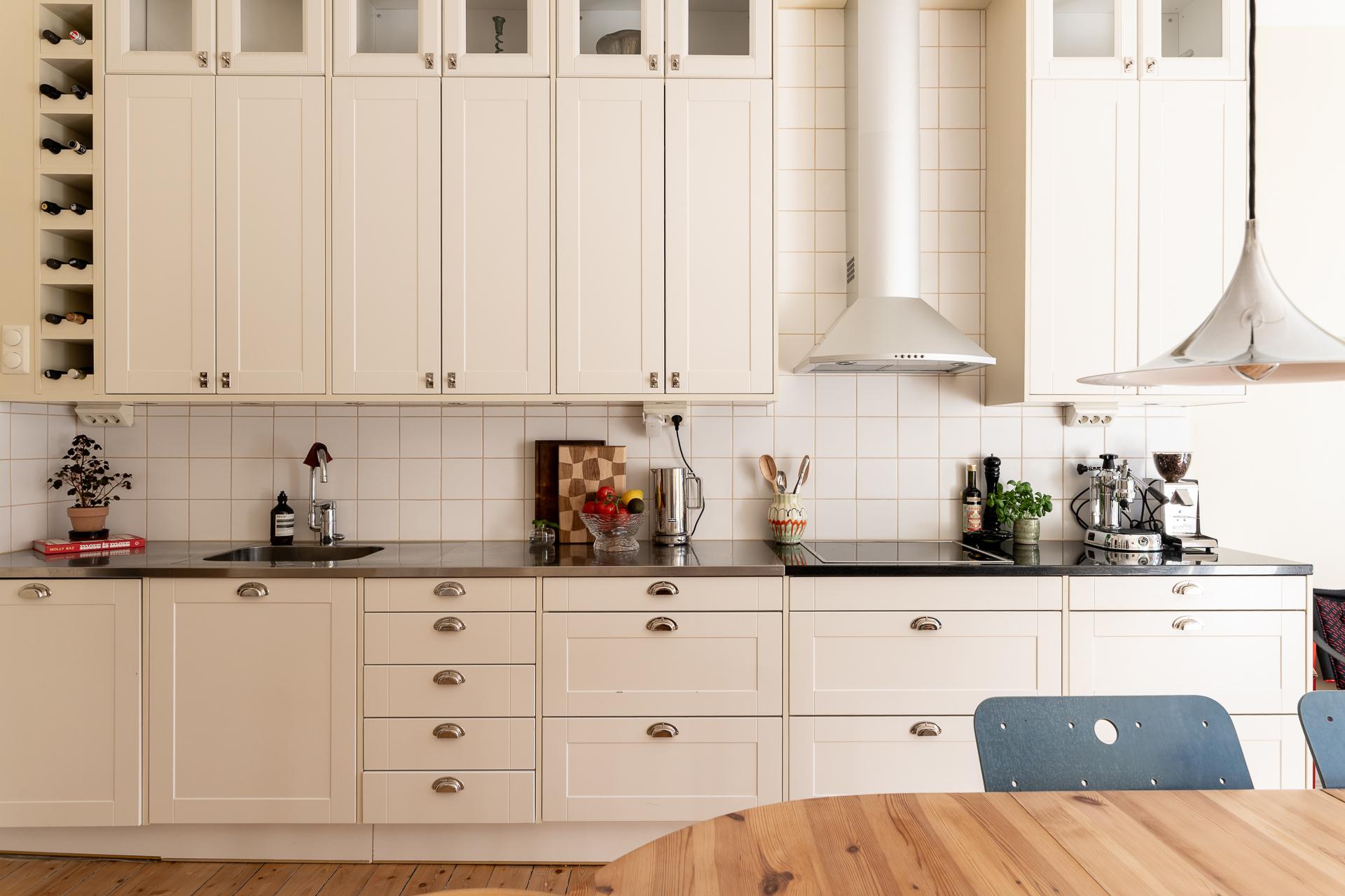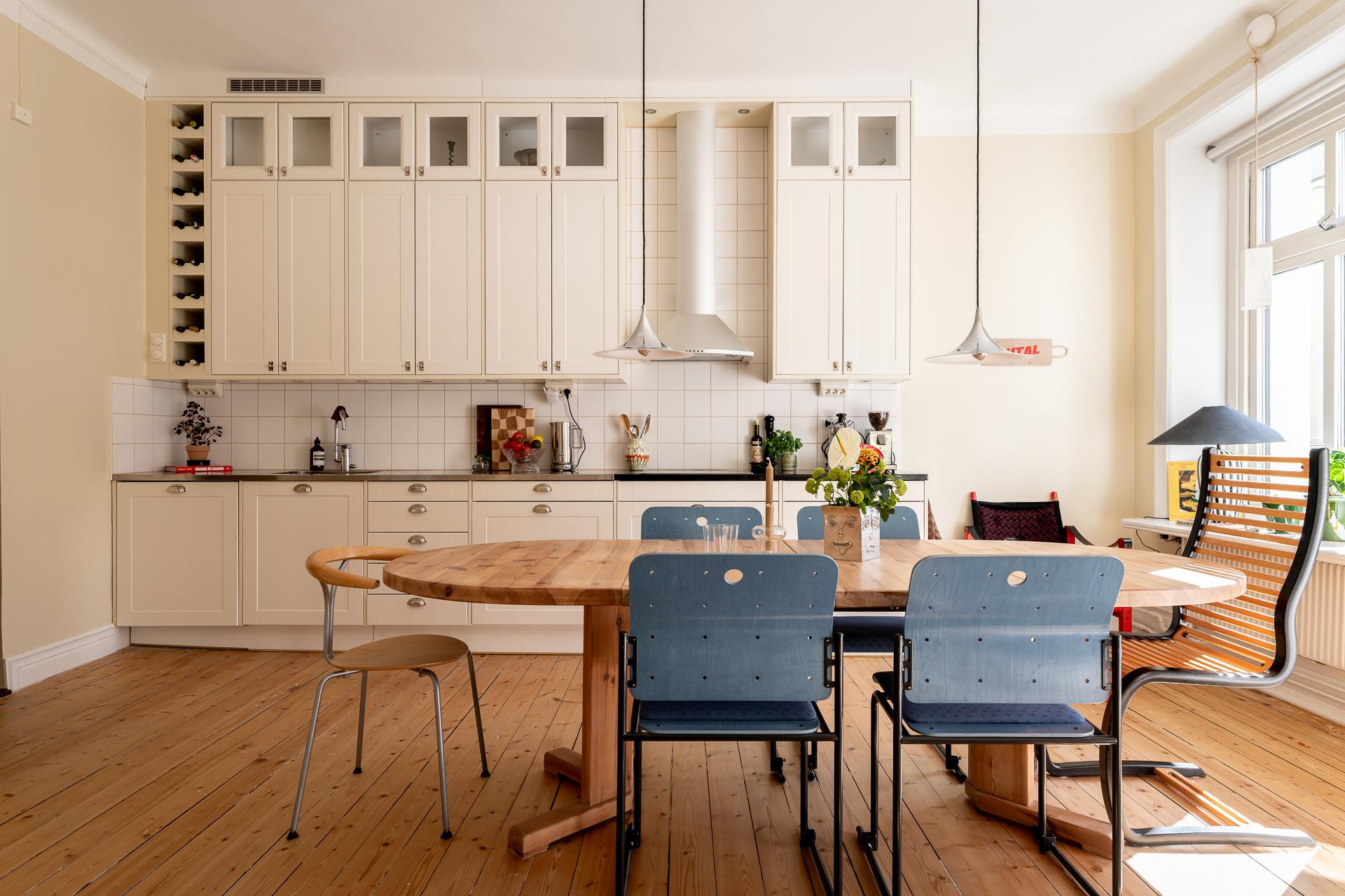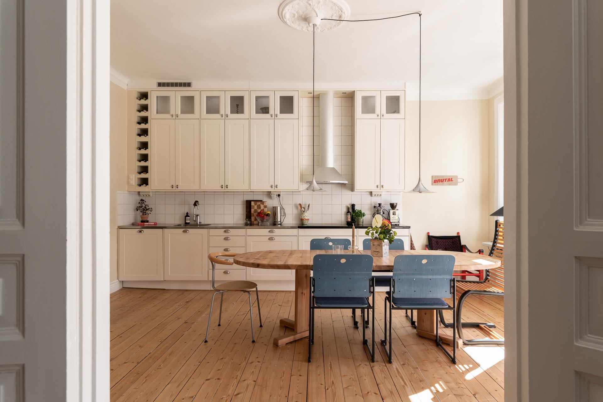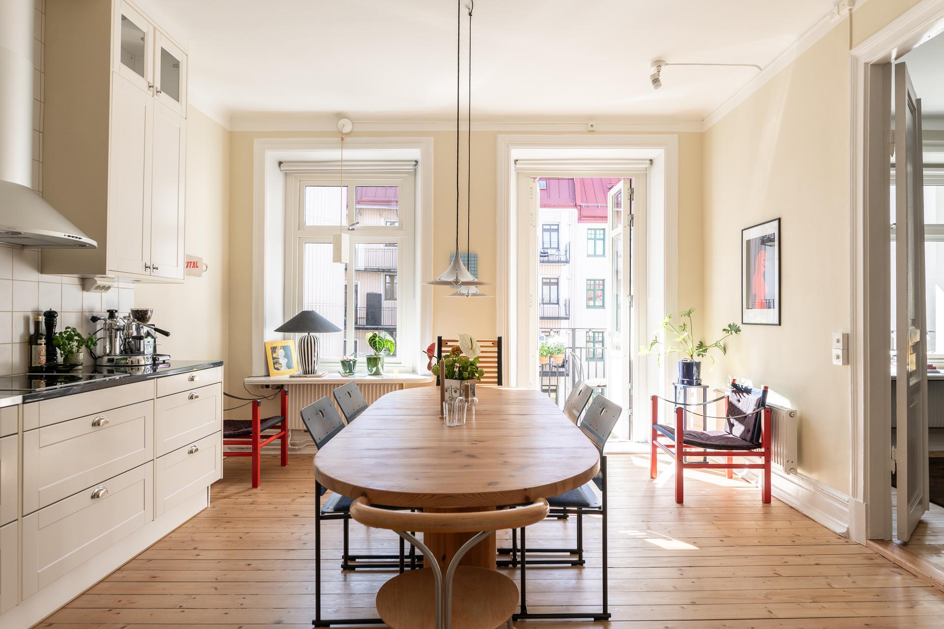 Köket och vardagsrummet ligger i fil, elegant placerade några trappsteg upp från hallen, vilket skapar en subtil och spännande nivåindelning. Den breda öppningen mellan rummen ger en känsla av öppen planlösning, samtidigt som de vackra parspegeldörrarna gör det möjligt att stänga till när så önskas. I köket finns gott om plats för stora middagar med vänner och familj – här ryms utan problem ett långbord för tio personer. Under varmare månader blir den rymliga balkongen en naturlig förlängning av rummet, perfekt för både livliga middagar och stilla stunder i eftermiddags- och kvällssolen. Arbetsytorna är generösa och förvaringen välplanerad, med överskåp som nyttjar den imponerande takhöjden. Det framtagna originalgolvet i brädor ger karaktär, och ovanför tronar en vacker takrosett.
